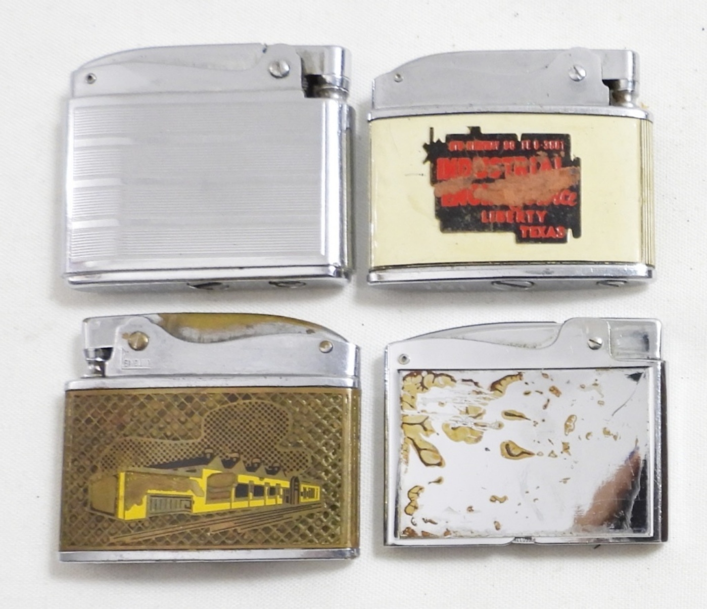 (4) FLAT VINTAGE LIGHTERS W DESIGNS, LOYAL CASKET CO, ECHRICH, INDUSTRIAL ENGINE SERVICE, TEXTURED SILVER ENGRAVED “ART” RONSON