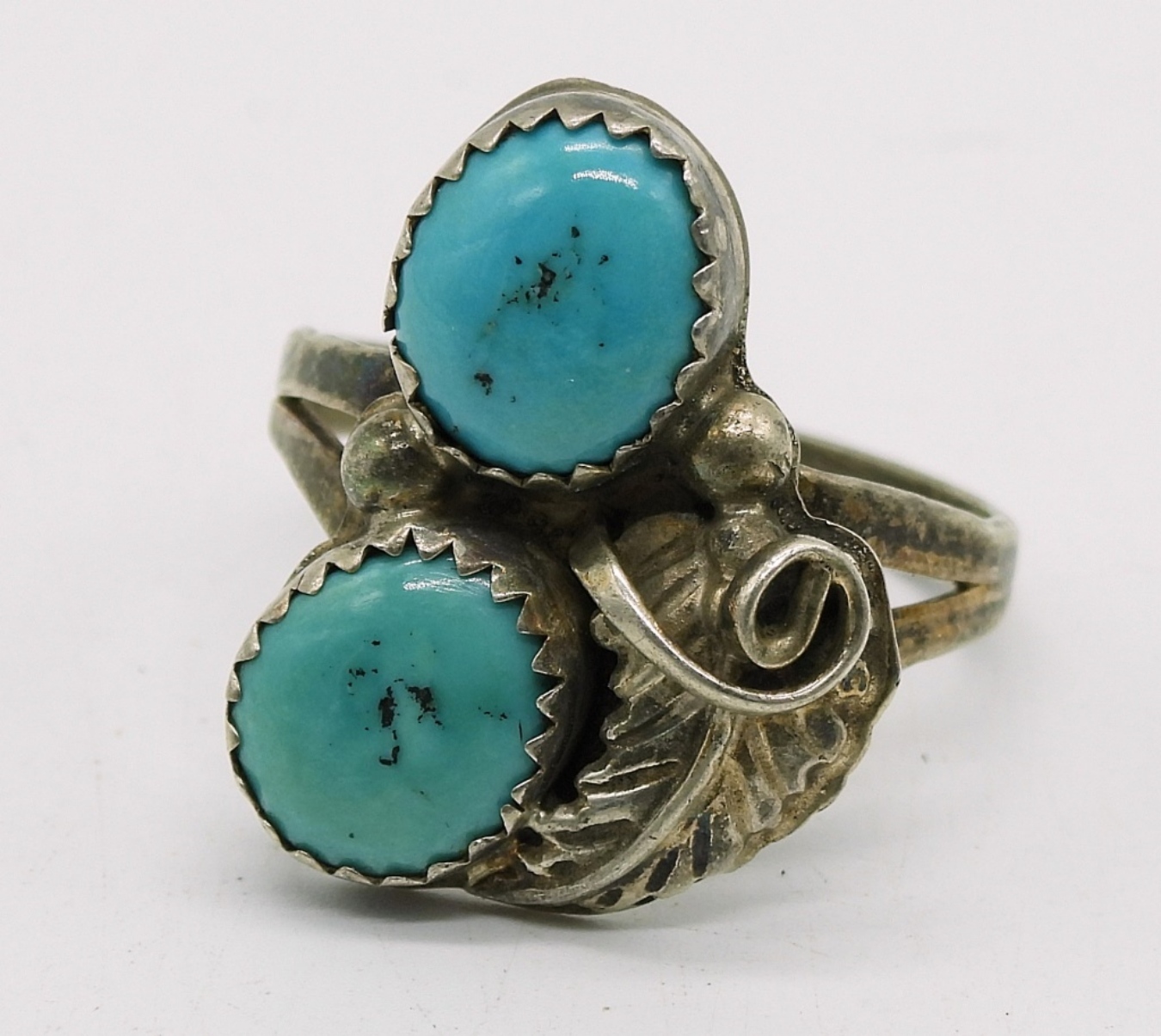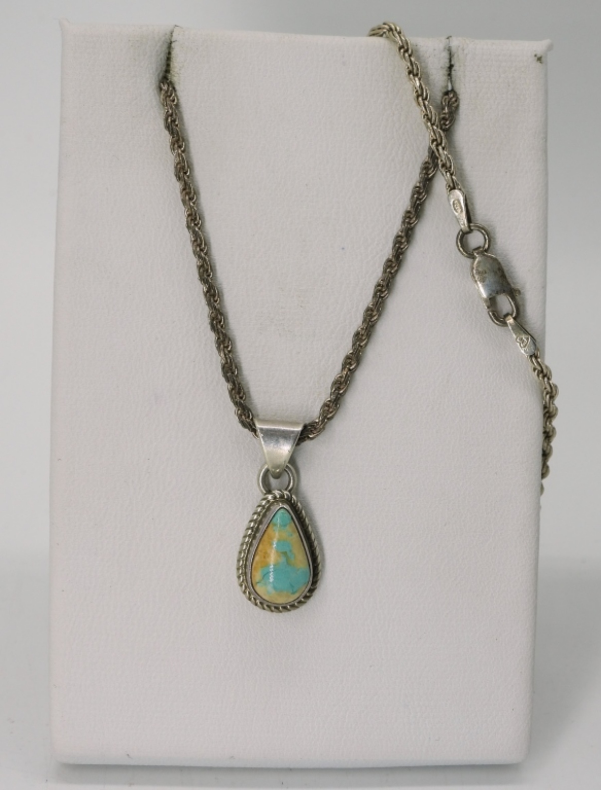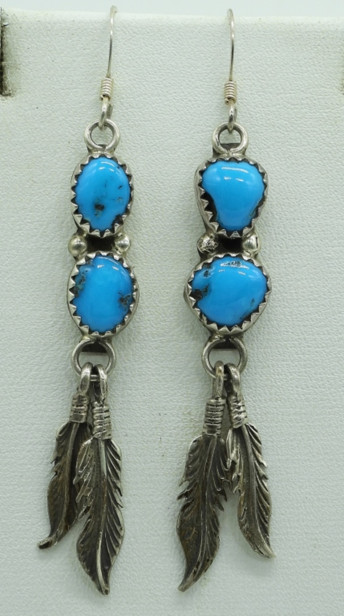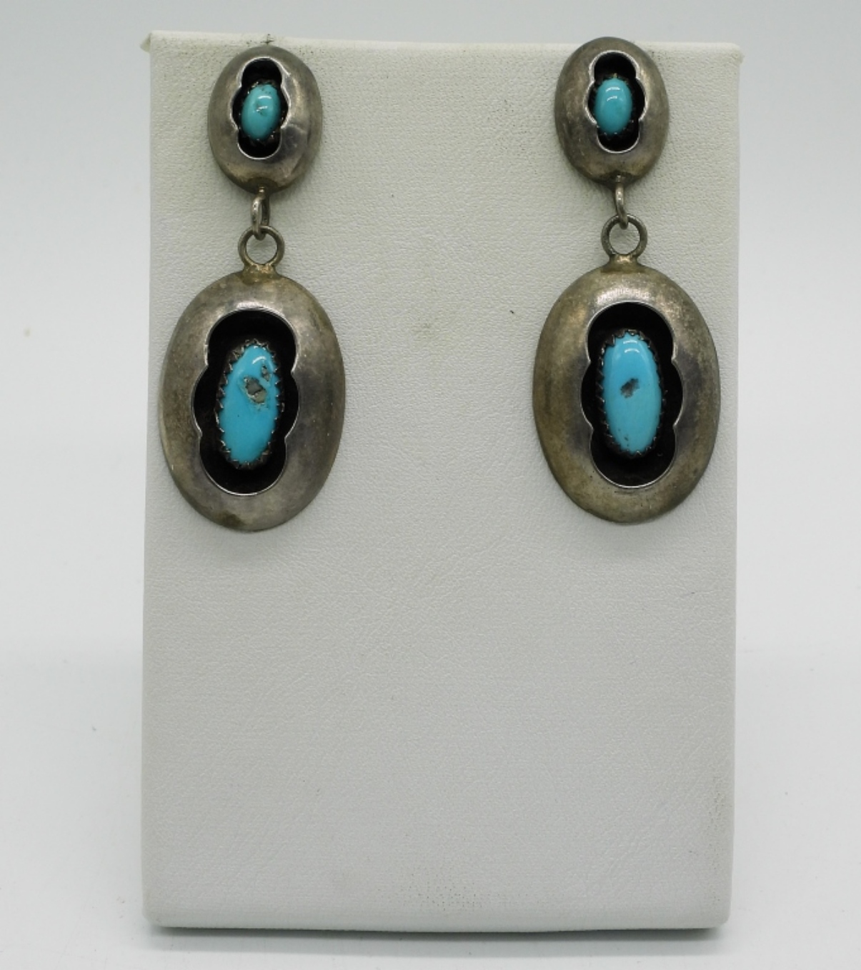 VINTAGE TURQUOISE STERLING JEWELRY. TWO PAIR OF PIERCED DROP EARRINGS, ONE RING SIZE 9. PRETTY TURQUOISE PENDANT ON A STERLING 18″ CHAIN. 15.6 DWT