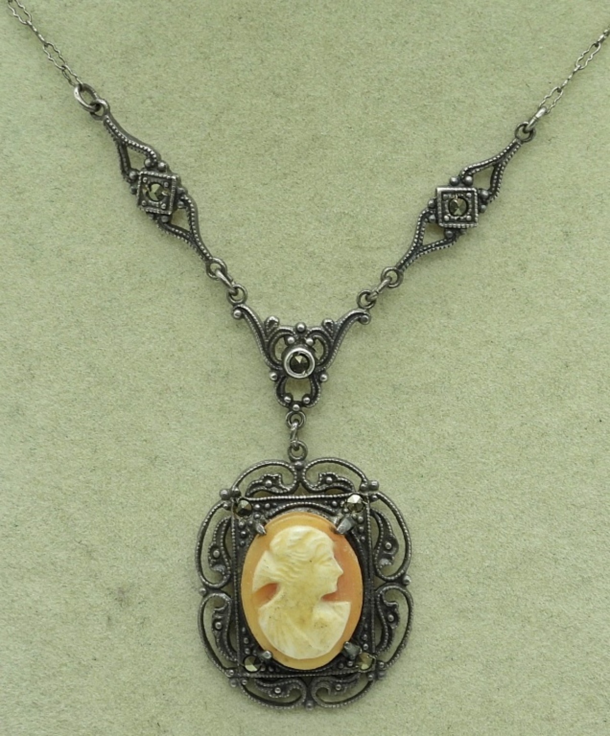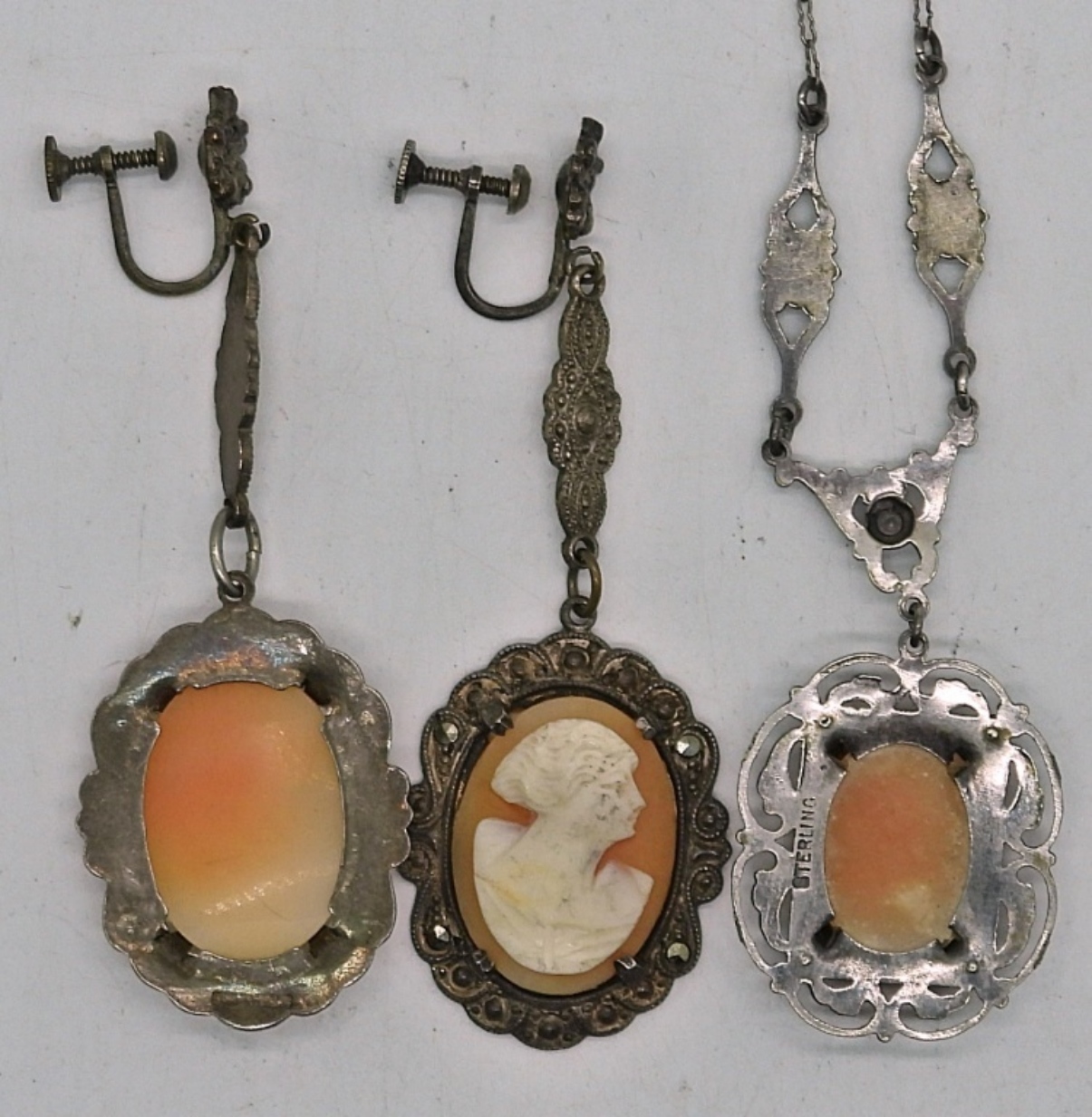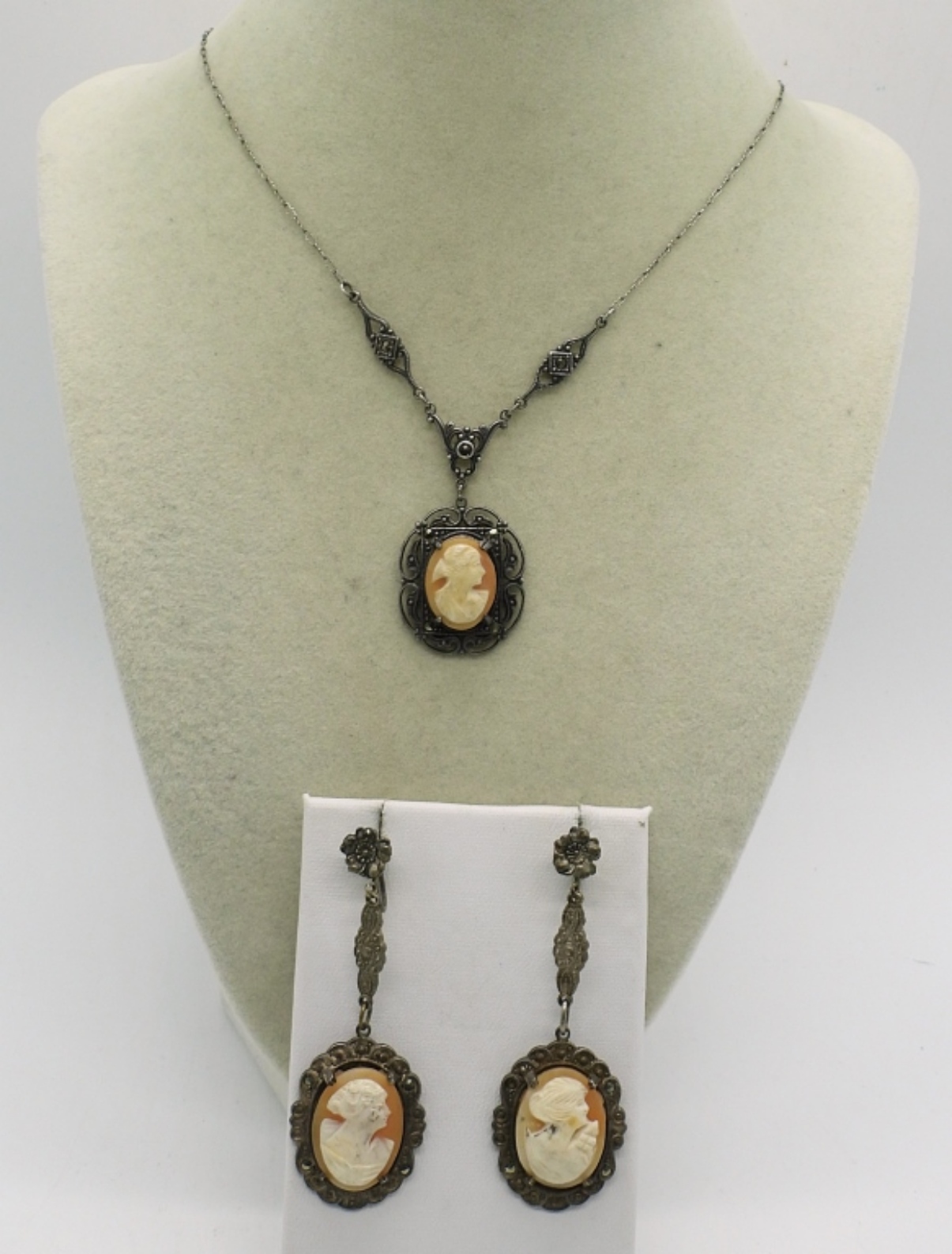 VINTAGE STERLING SILVER CAMEO NECKLACE AND MATCHING SCREW BACK DANGLE EARRINGS. NECKLACE, 17″ PETITE. EARRINGS 2.5″ LONG. 10.8 DWT