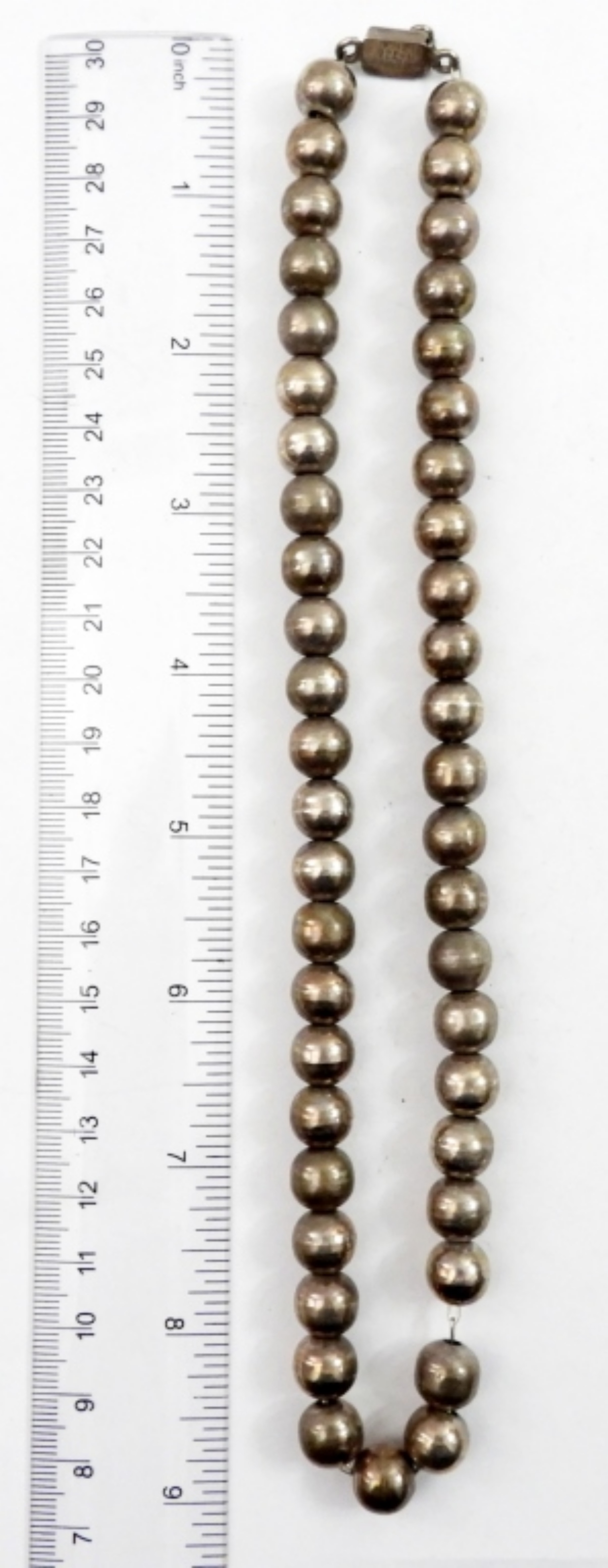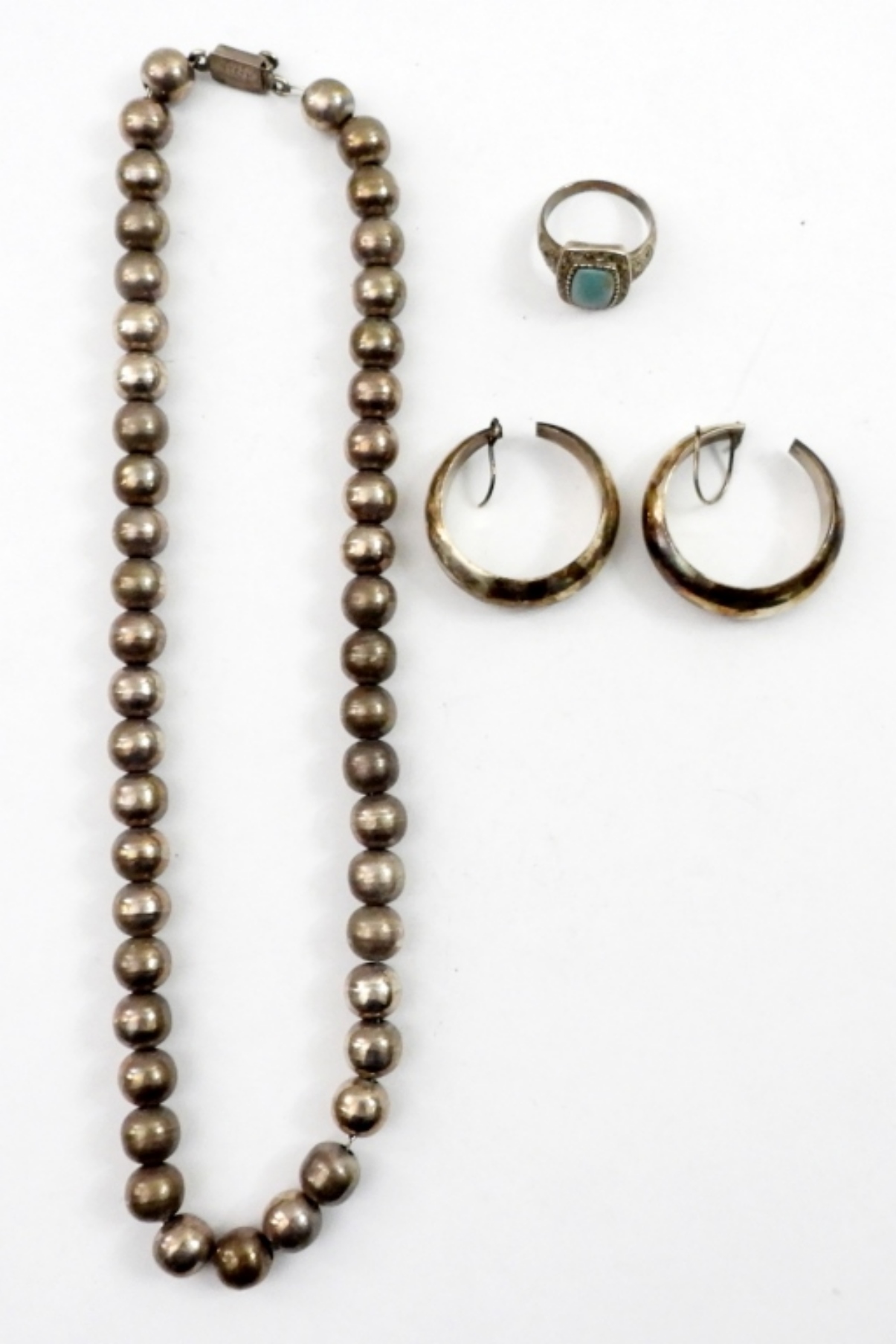 16 IN MEXICO STERLING NECKLACE , A PAIR OF MEXICO STERLING EARRINGS AND A SIZE 9 RING WITH BLUE STONE 59.3 DWT