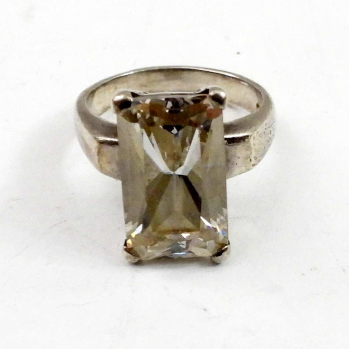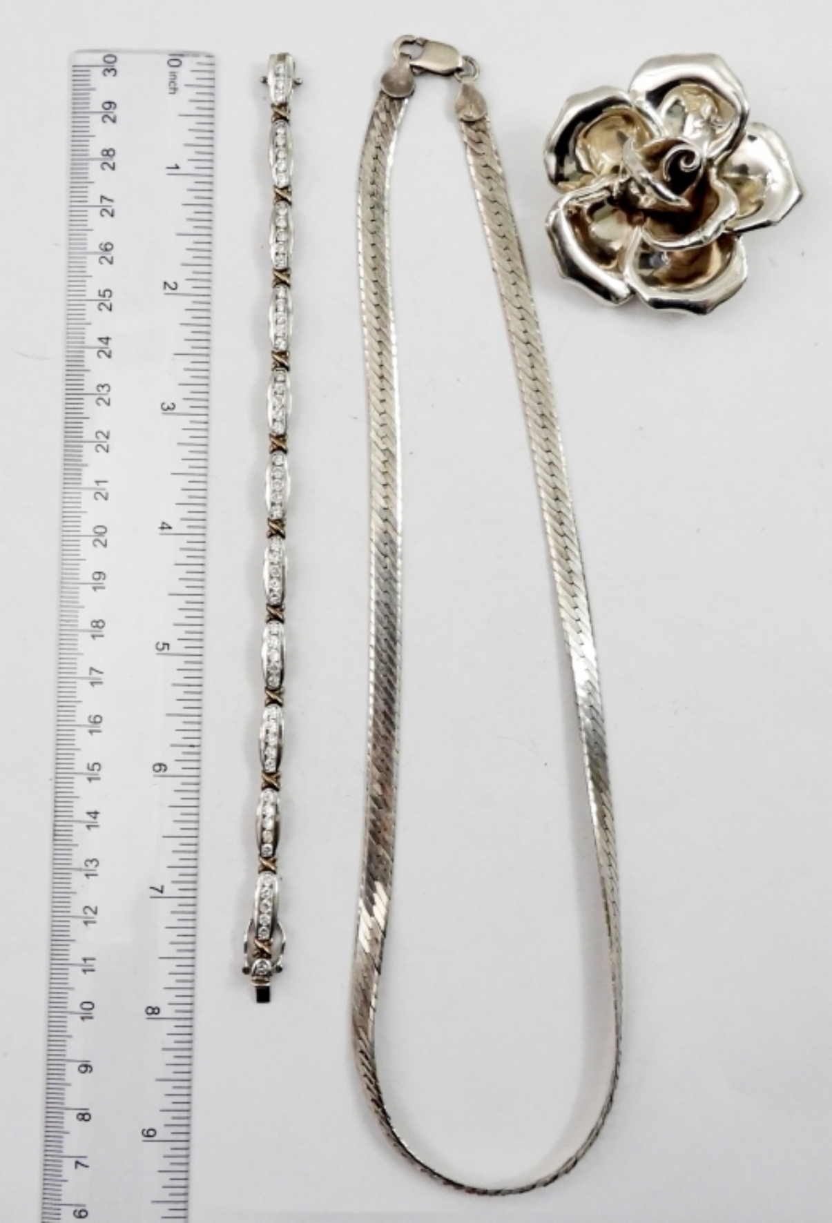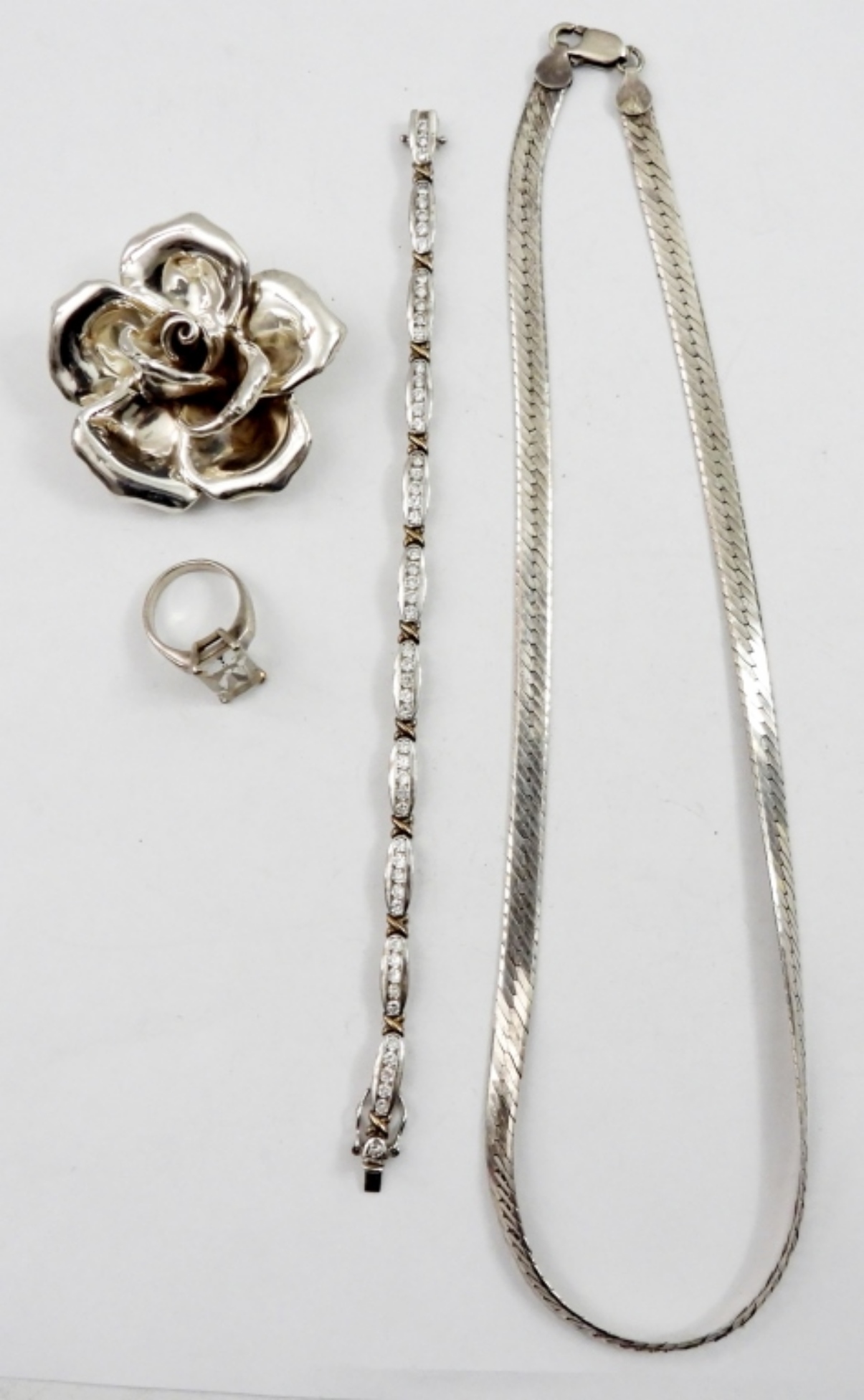 18 IN STERLING NECKLACE, 6 IN BRACELET WITH DIAMOND LIKE STONES,A FLOWER BROOCH AND A SIZE 7 RING WITH DIAMOND LIKE STONE