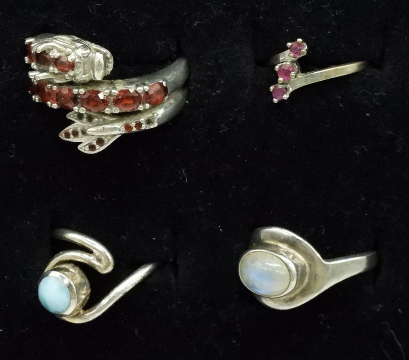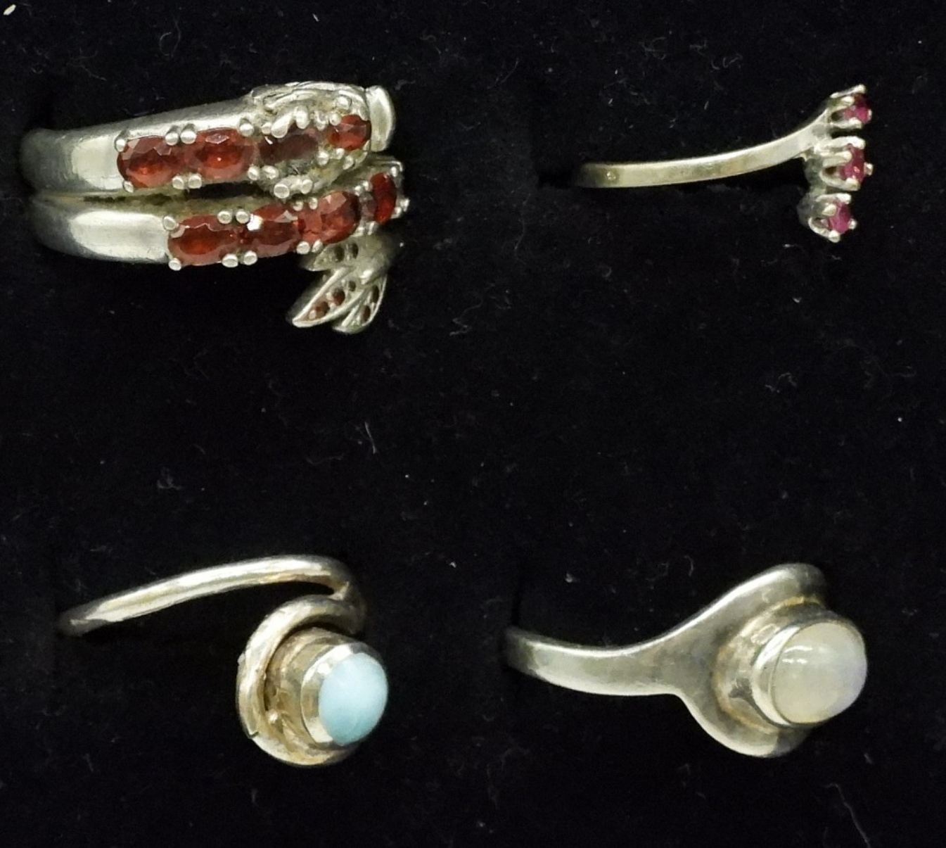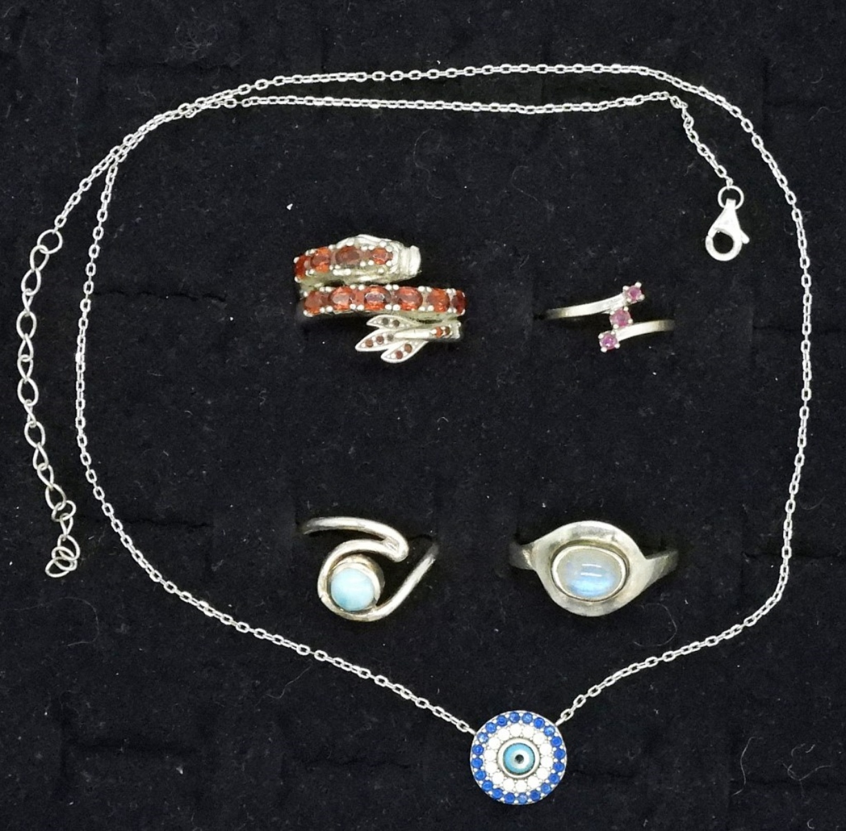 ONE STERLING FASHION NECKLACE, 20″. FOUR STERLING RINGS WITH GEMSTONES, SIZES 4-8. 11.7 DWT