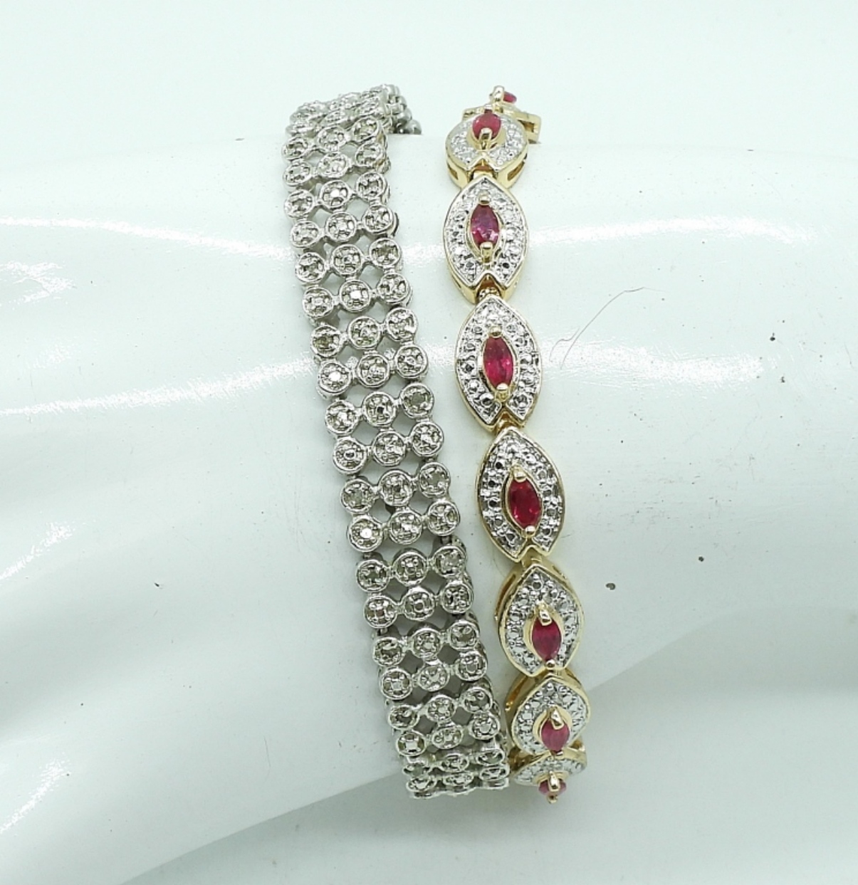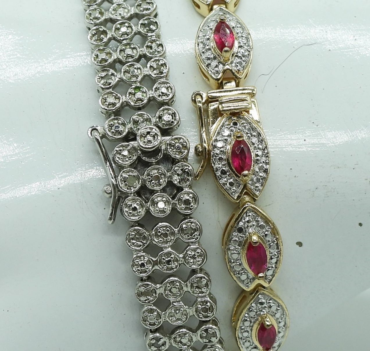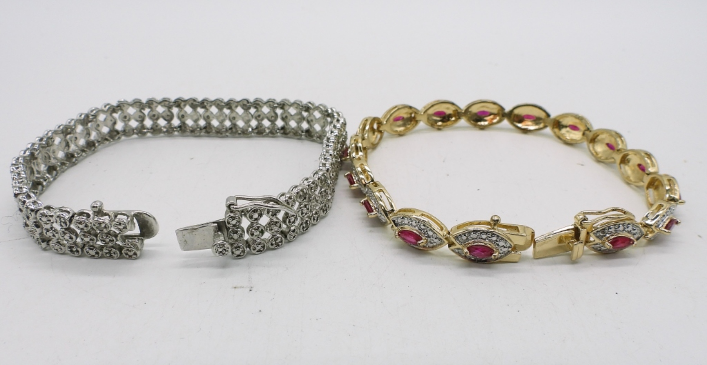 GORGEOUS STERLING FASHION BRACELETS, GOLD AND SILVER TONEDS WITH RED AND WHILTE GEMSTONES. VERY PRETTY. 7″. 19.4 DWT