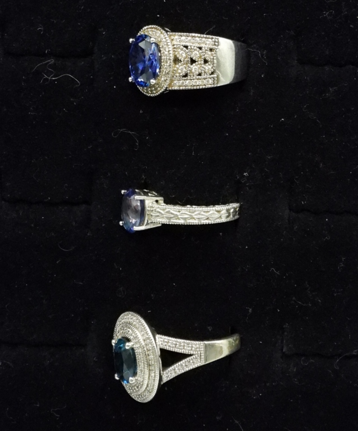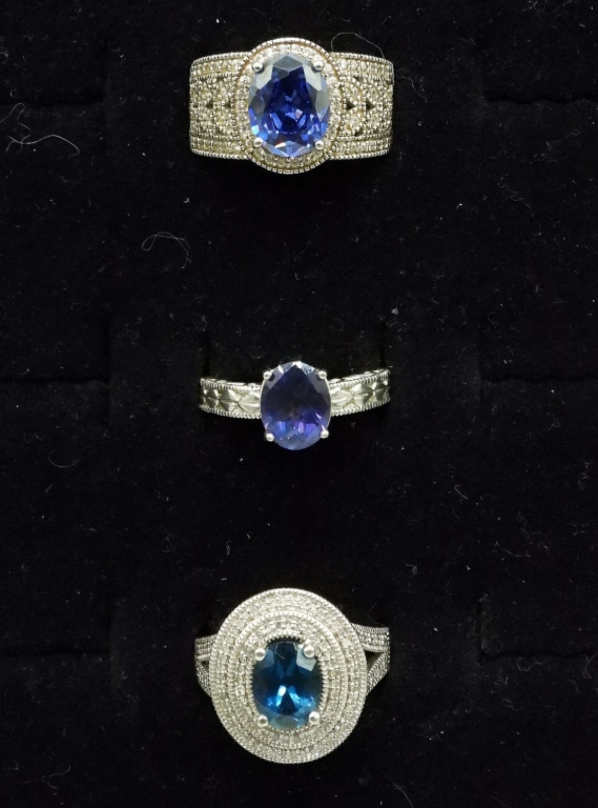 THREE ABSOLUTELY STUNNING RINGS WITH BLUE / PURPLE GEMSTONES. SIZES 6 & 8. 10.4 DWT