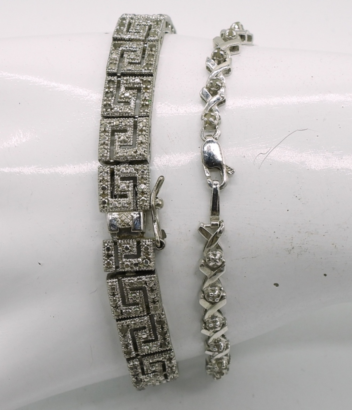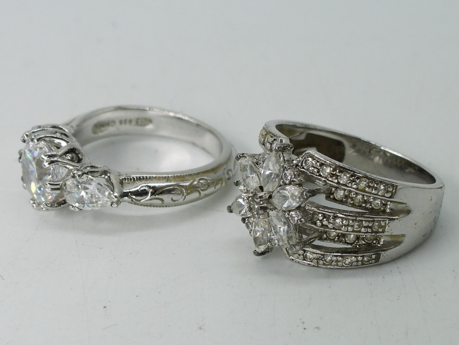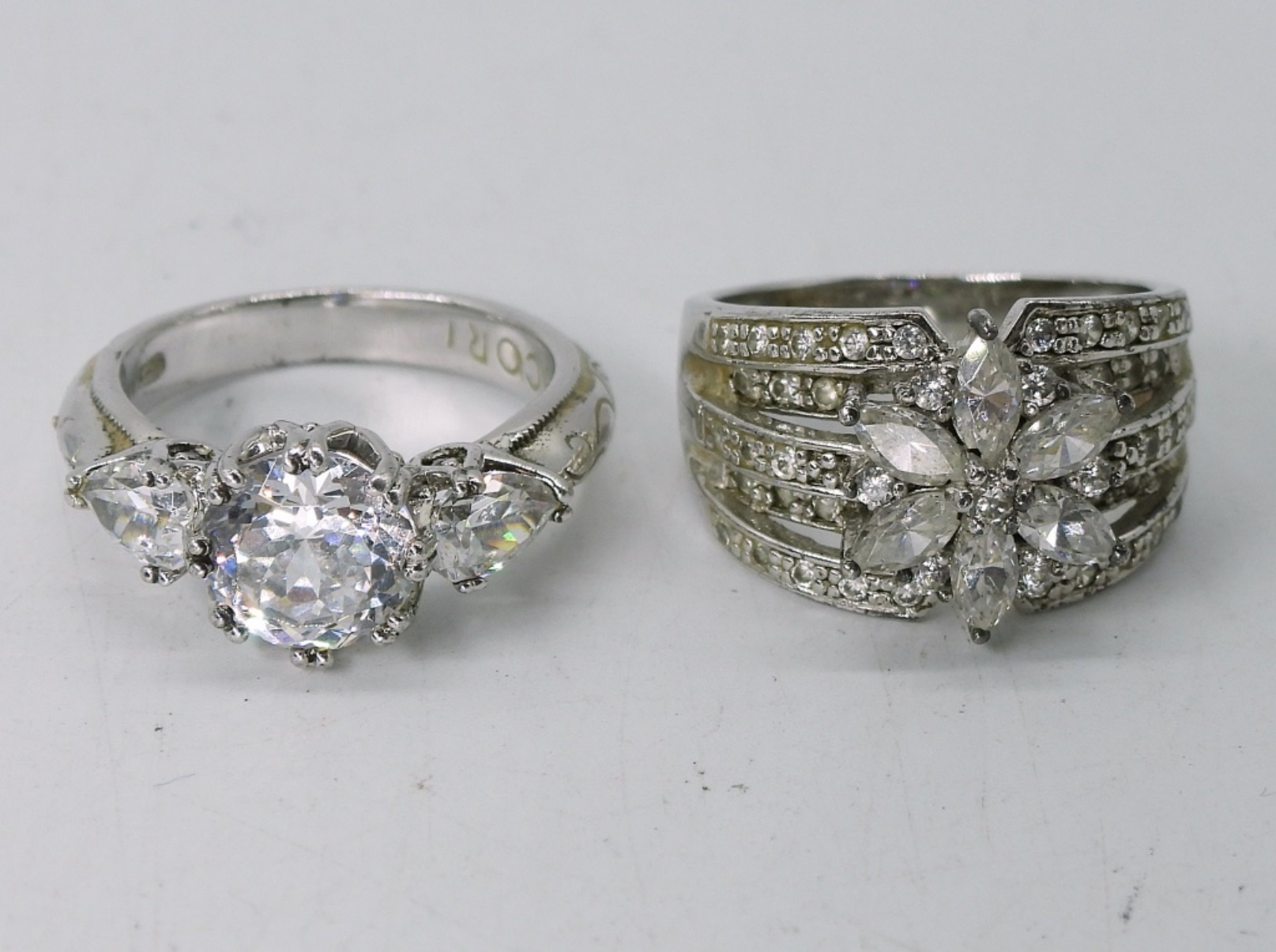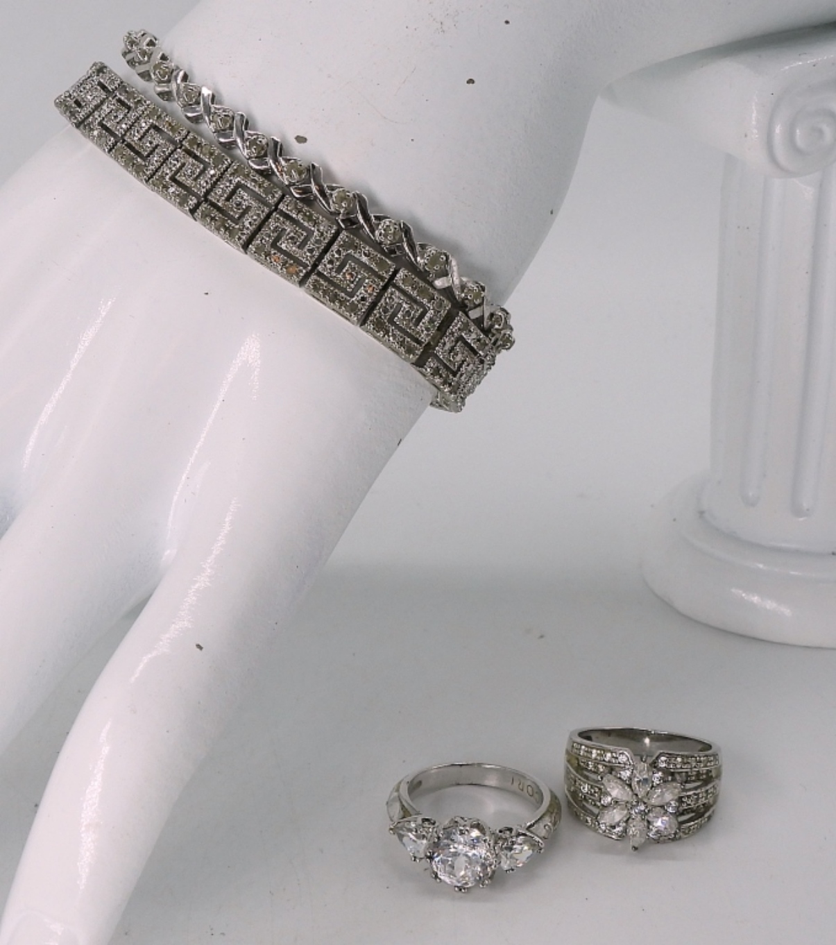 TWO STERLING SILVER BRIDAL STYLE BRACELETS, 7-7.5″. TWO BEAUTIFUL STERLING SILVER WHITE GEMSTONE BRIDAL STYLE RINGS, SIZE 6. 22.3 DWT