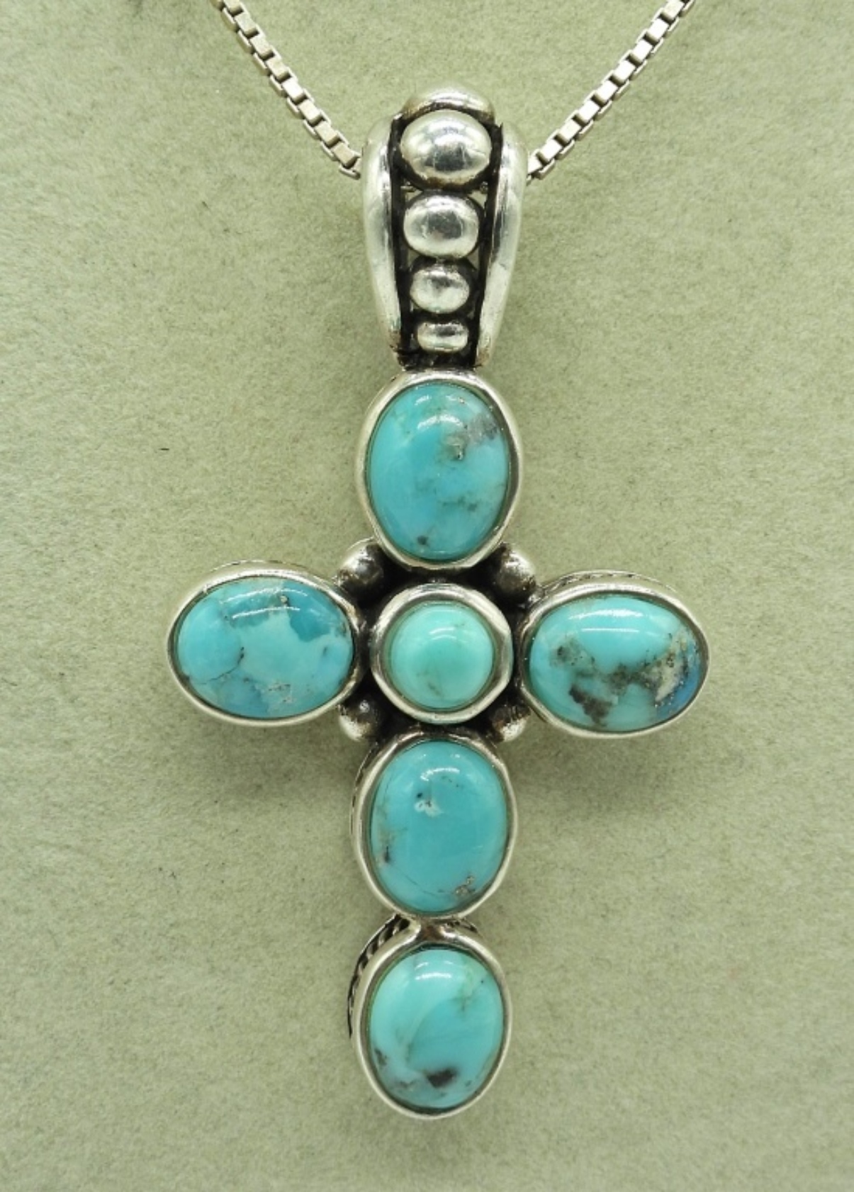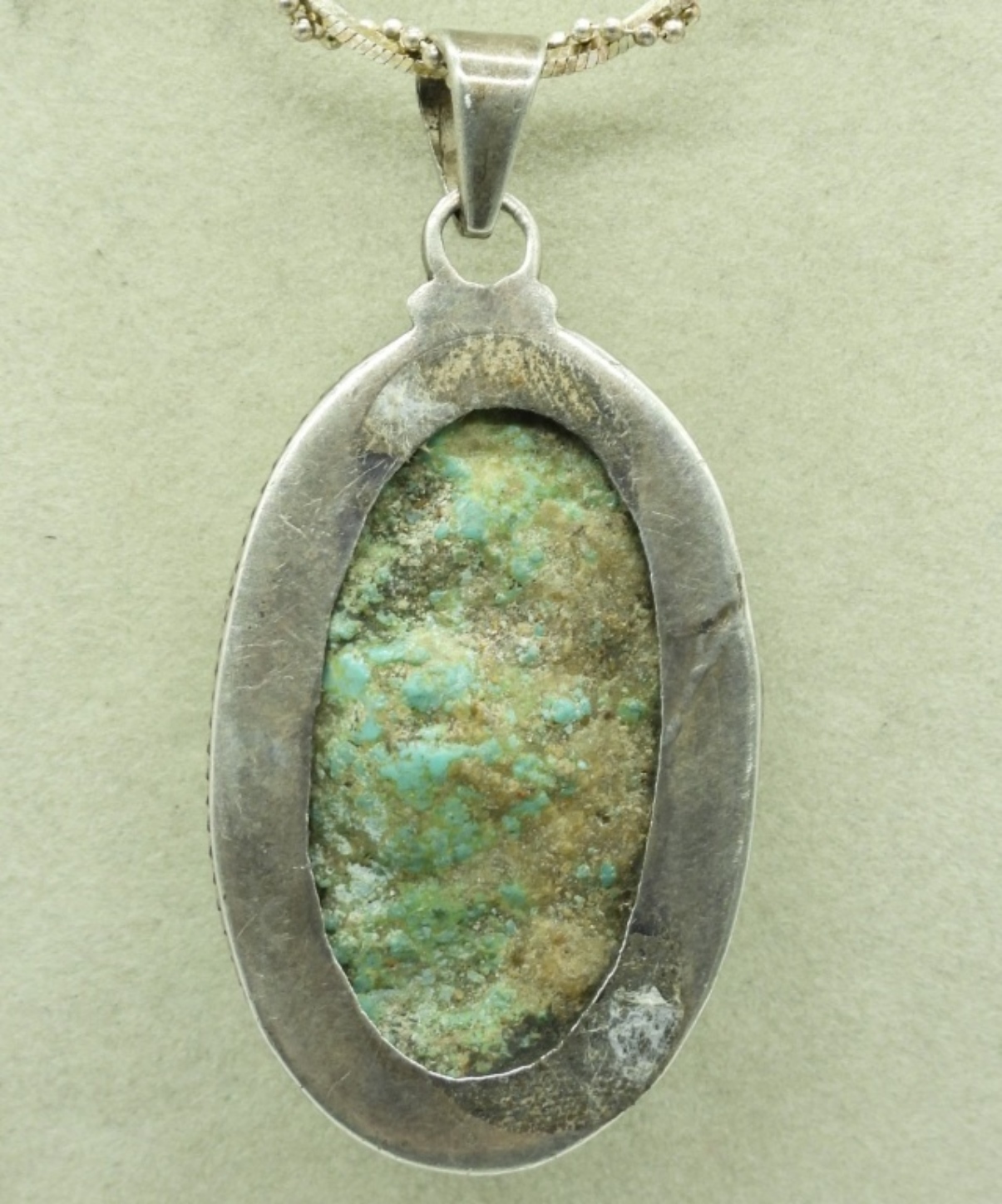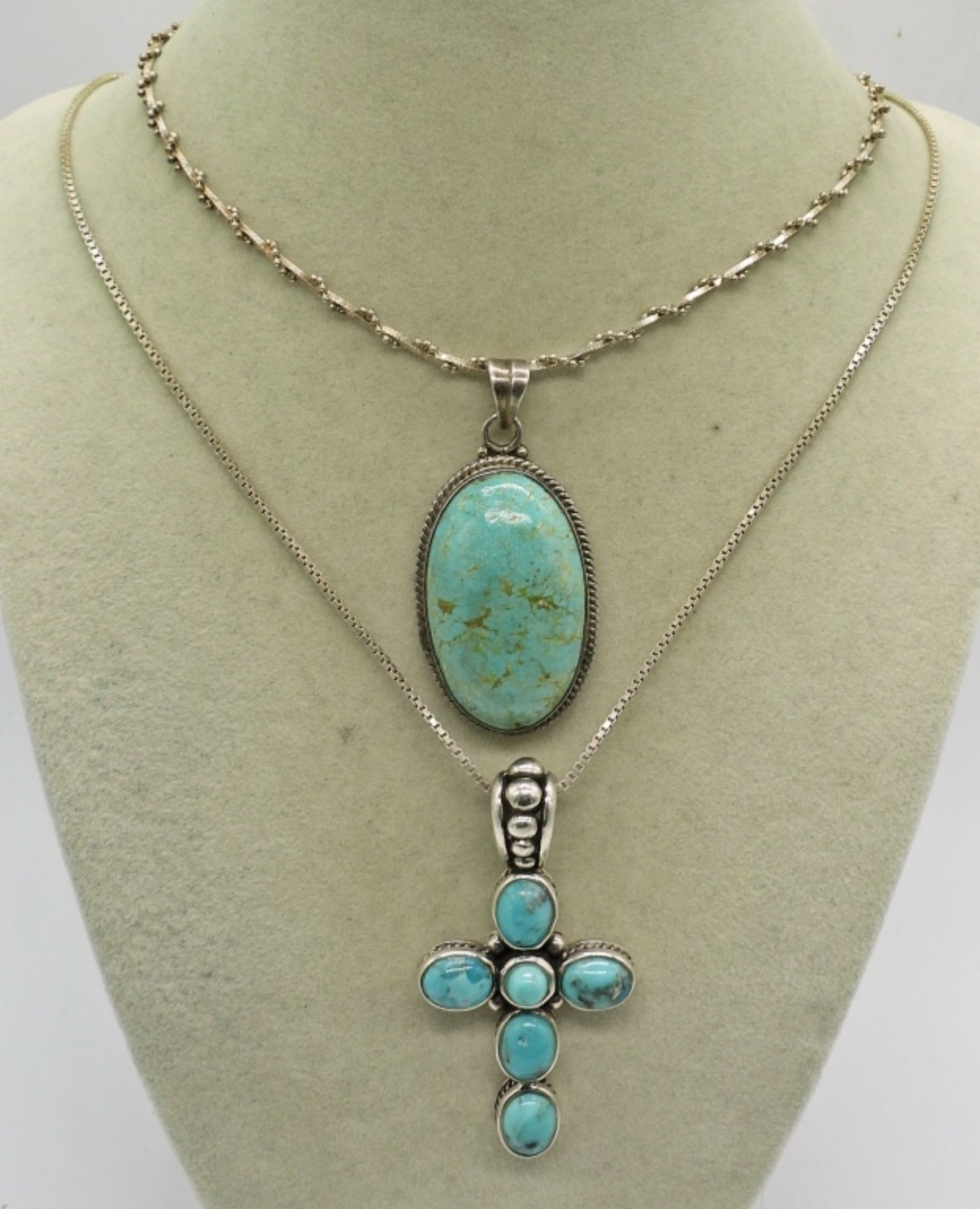 TWO VINTAGE STERLING TURQUOISE NECKLACES ON STERLING CHAINS.16″ & 18″ CHAINS. 30 DWT