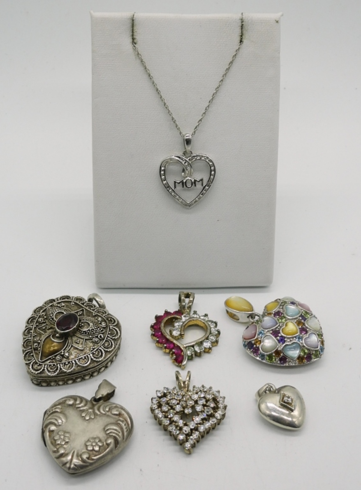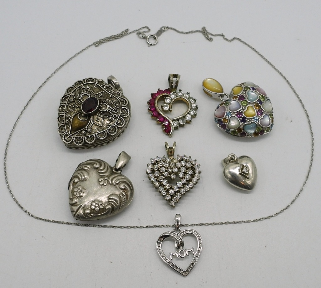 SEVEN STERLING SILVER HEART SHAPED PENDANTS WITH GEMSTONES. 2 ARE LOCKETS. STERLING CHAIN IS 18″. 26 DWT