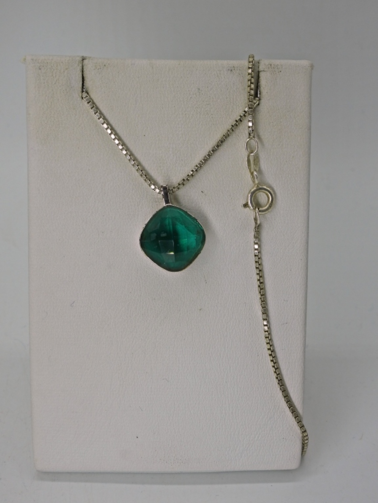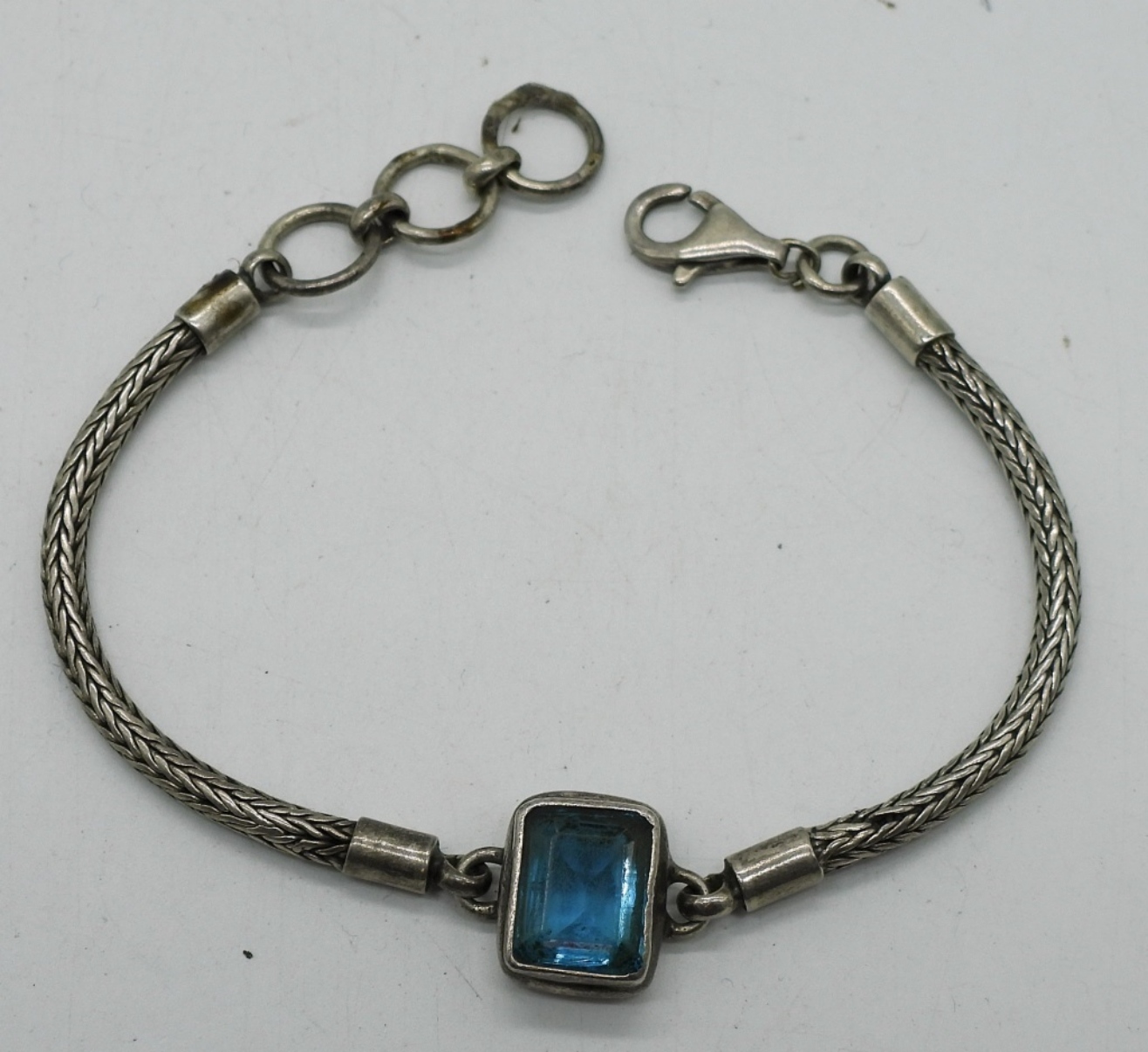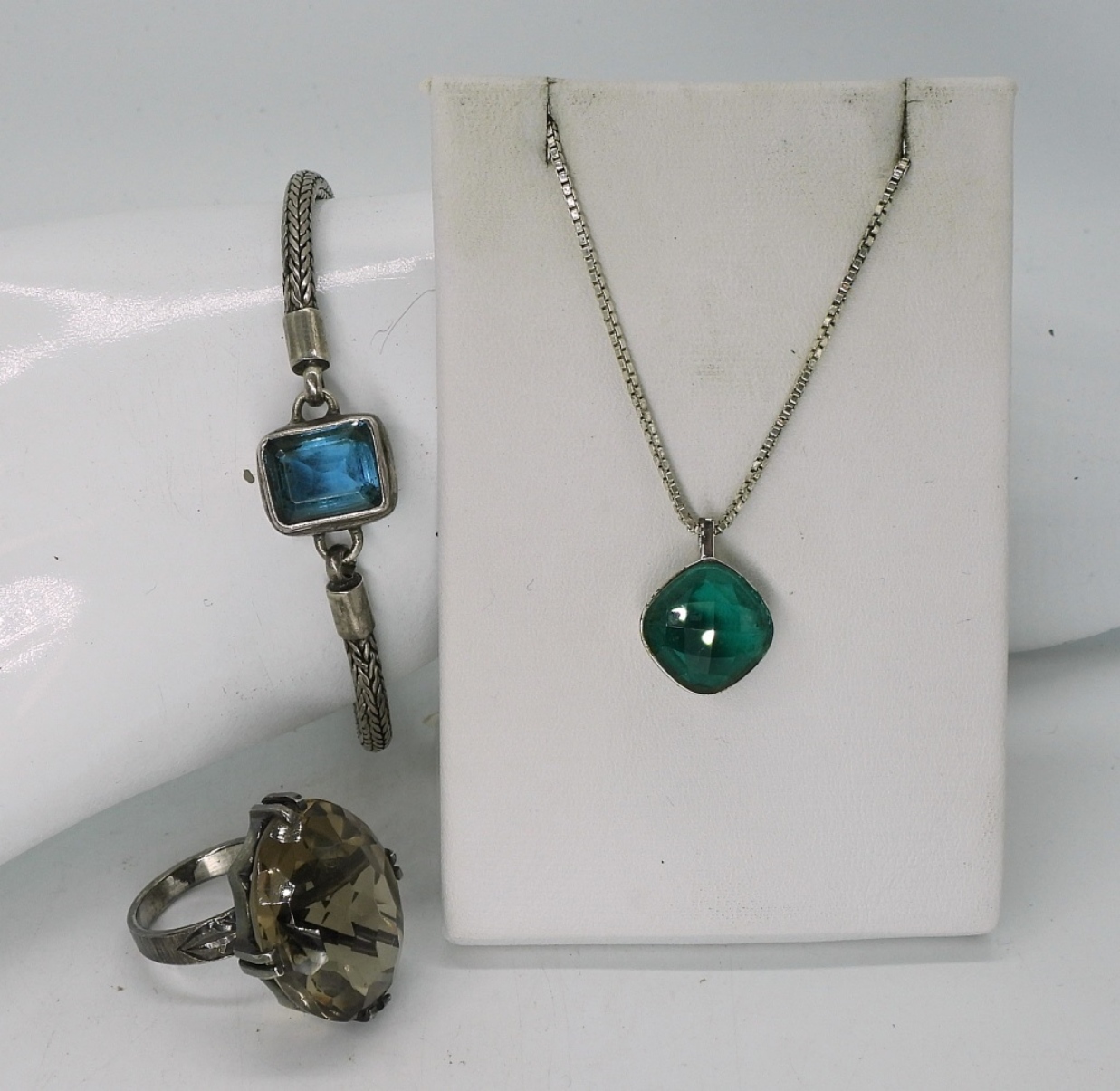 STERILNG BRACELET WITH A BLUE TOPAZ GEMSTONE, 7-8″. EMERALD GREEN COLORED GEMSTONE PENDANT ON A 24″ STERLING CHAIN. LARGE SMOKEY QUARTZ GEMSTONE IN A STERLING RING, SIZE 6. 20.3 DWT