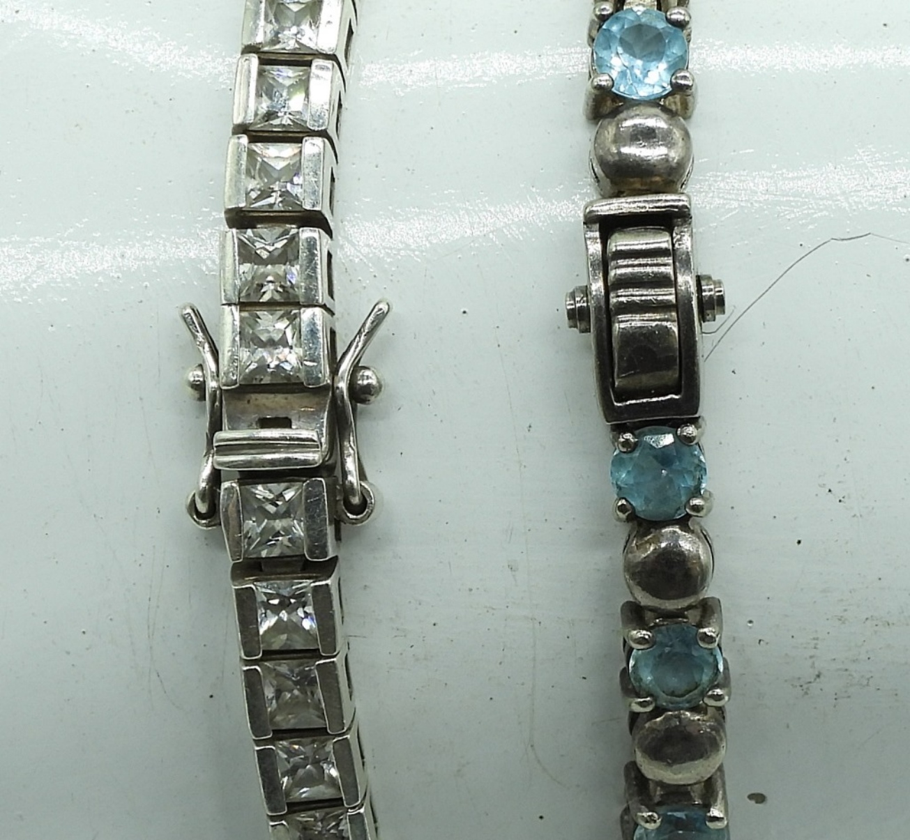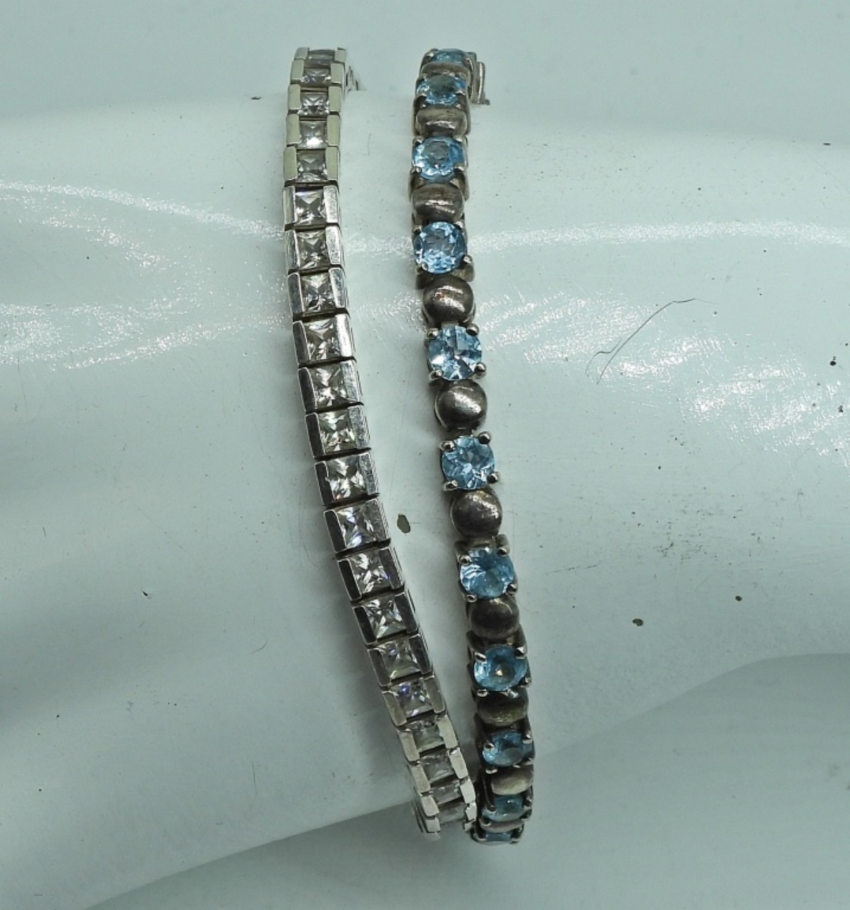 VINTAGE STERLING BLUE TOPAZ BRACELET, 7.5″. STERLING WHITE GEMSTONE BRACELET, 7.5″. 19.2 DWT