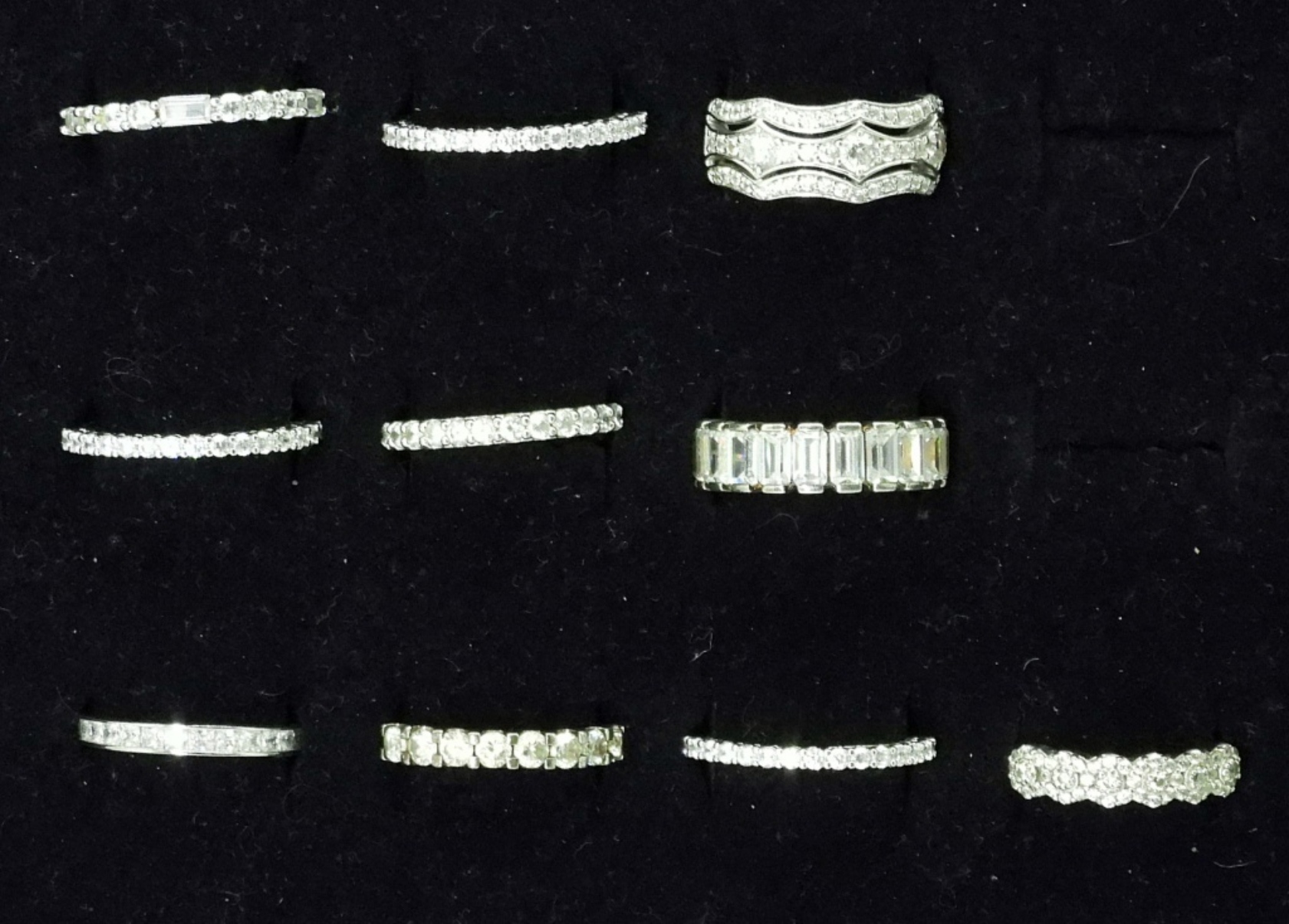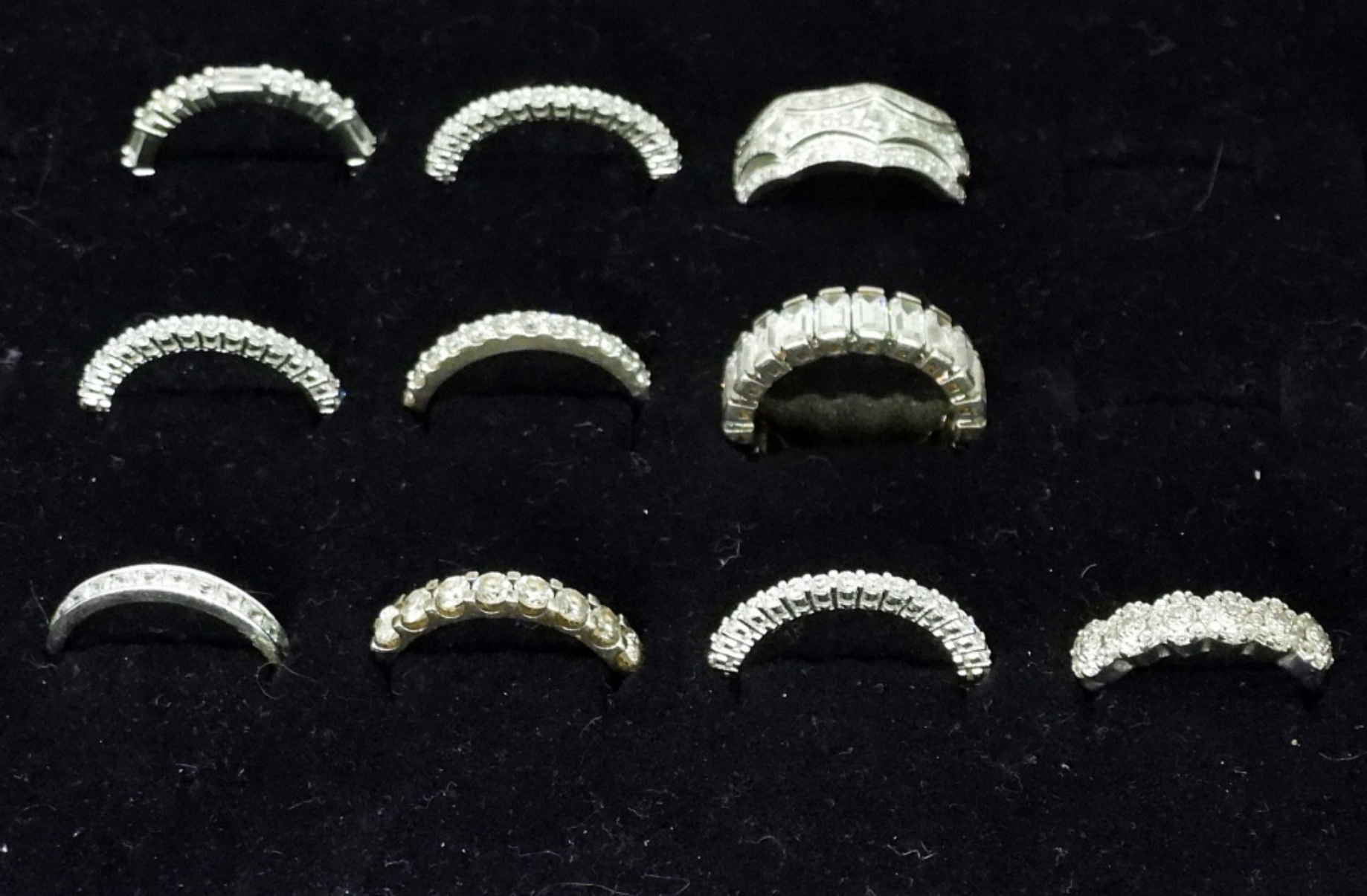 TEN STERLING SILVER BANDS / RINGS WITH DIAMOND LIKE GEMSTONES. VERY VERY NICE RINGS! SIZES 7-9. 20 DWT