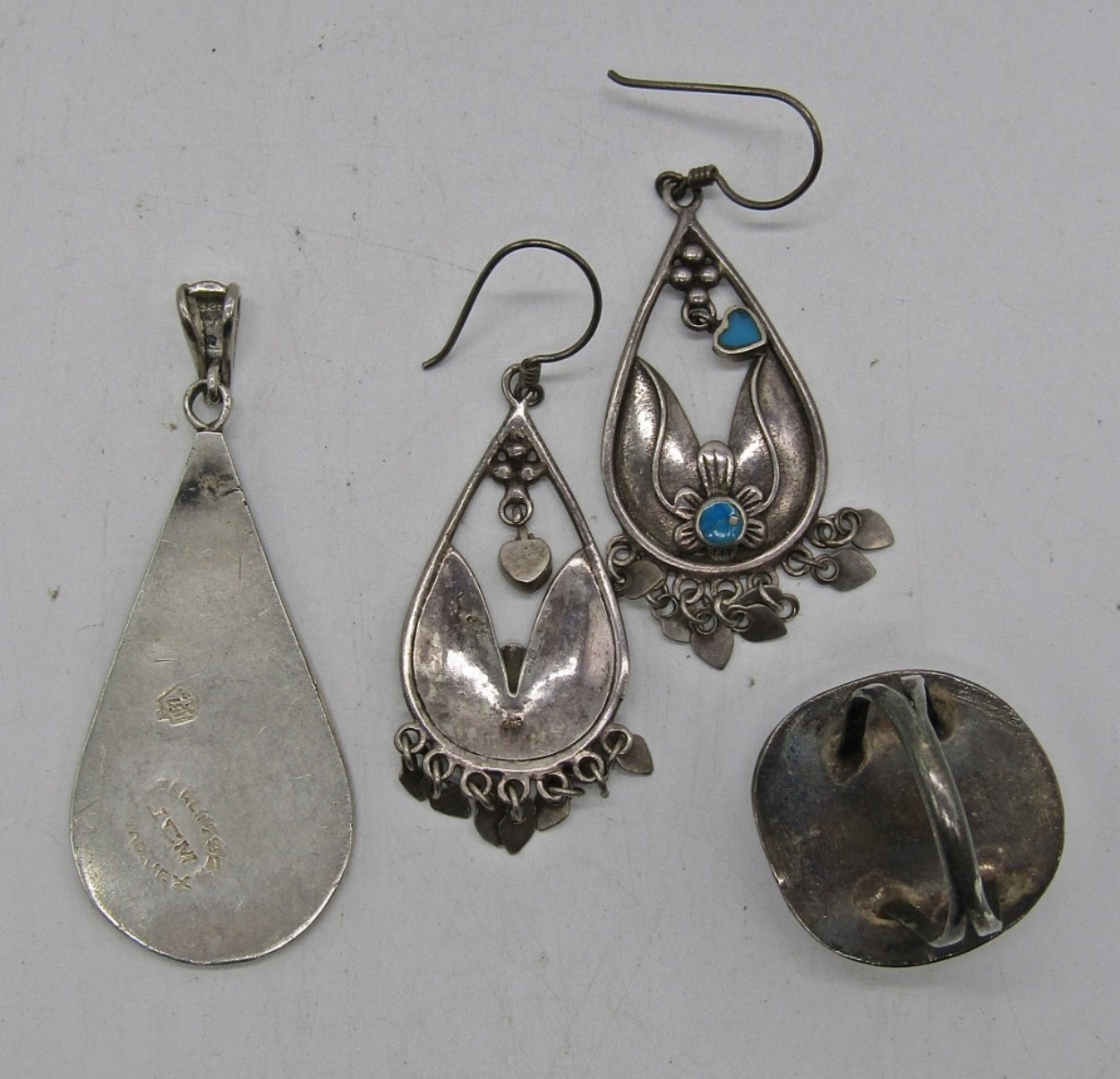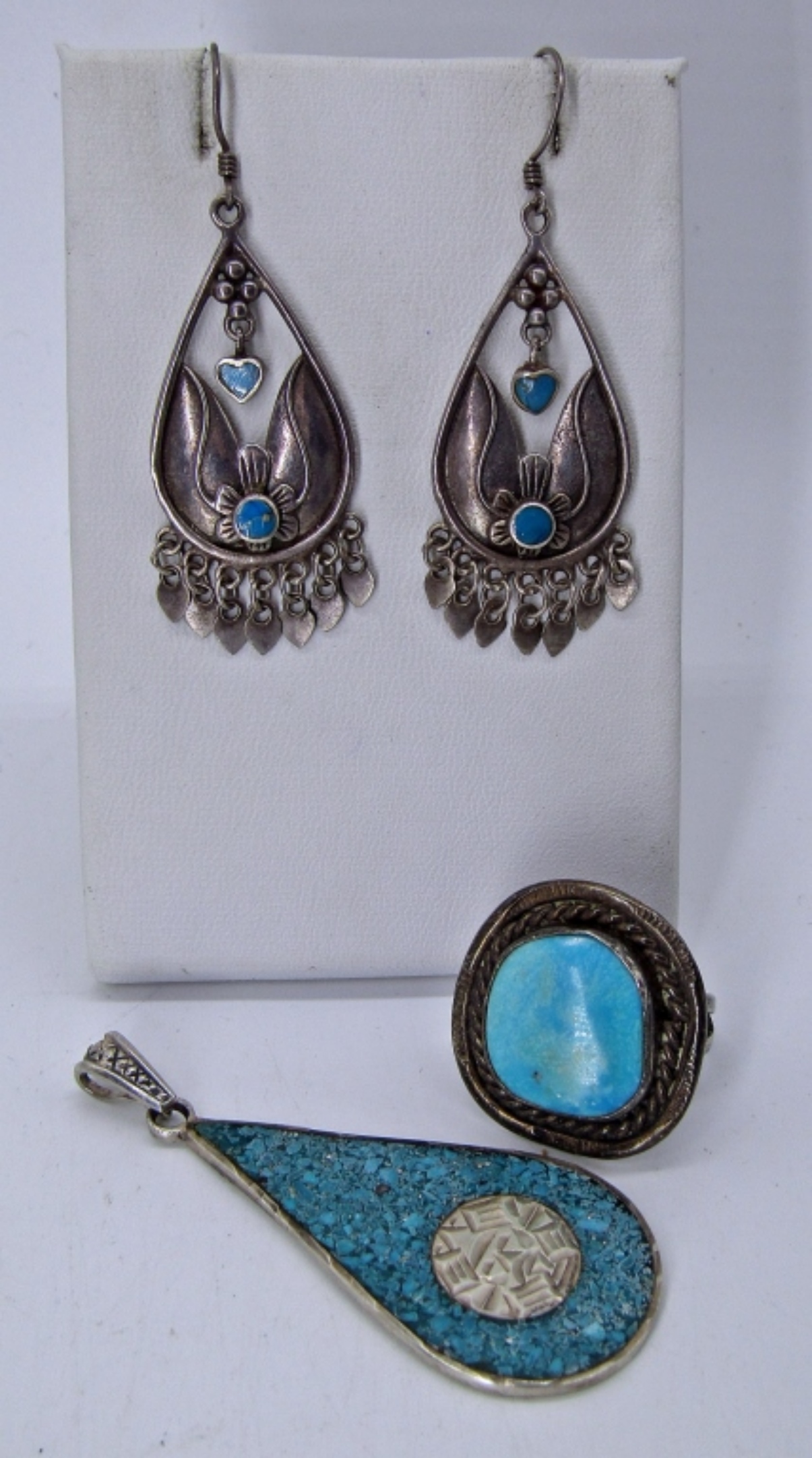 VINTAGE “MEXICO 925″ PRESSED TURQUOISE PENDANT, 2”. VINTAGE STERLING TURQUOISE RING, SIZE 7. STERLING DANGLING EARRINGS WITH BLUE GEMSTONES. 12.9 DWT