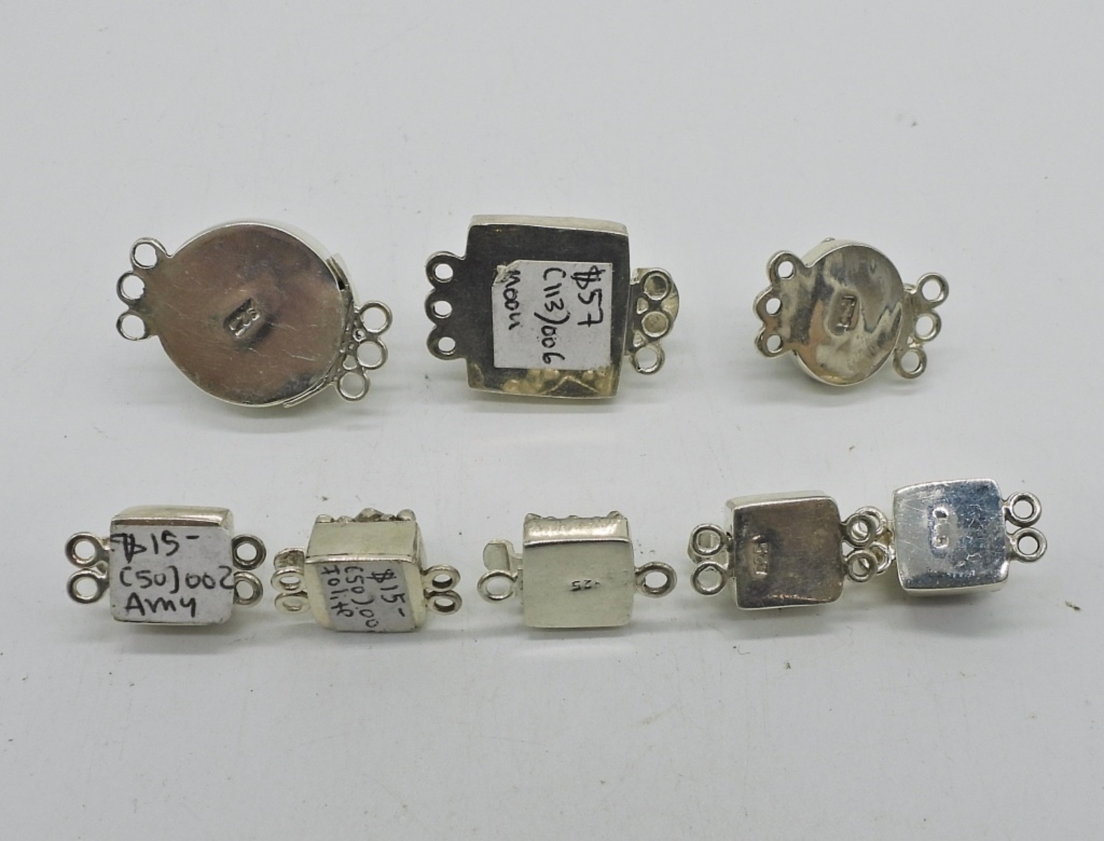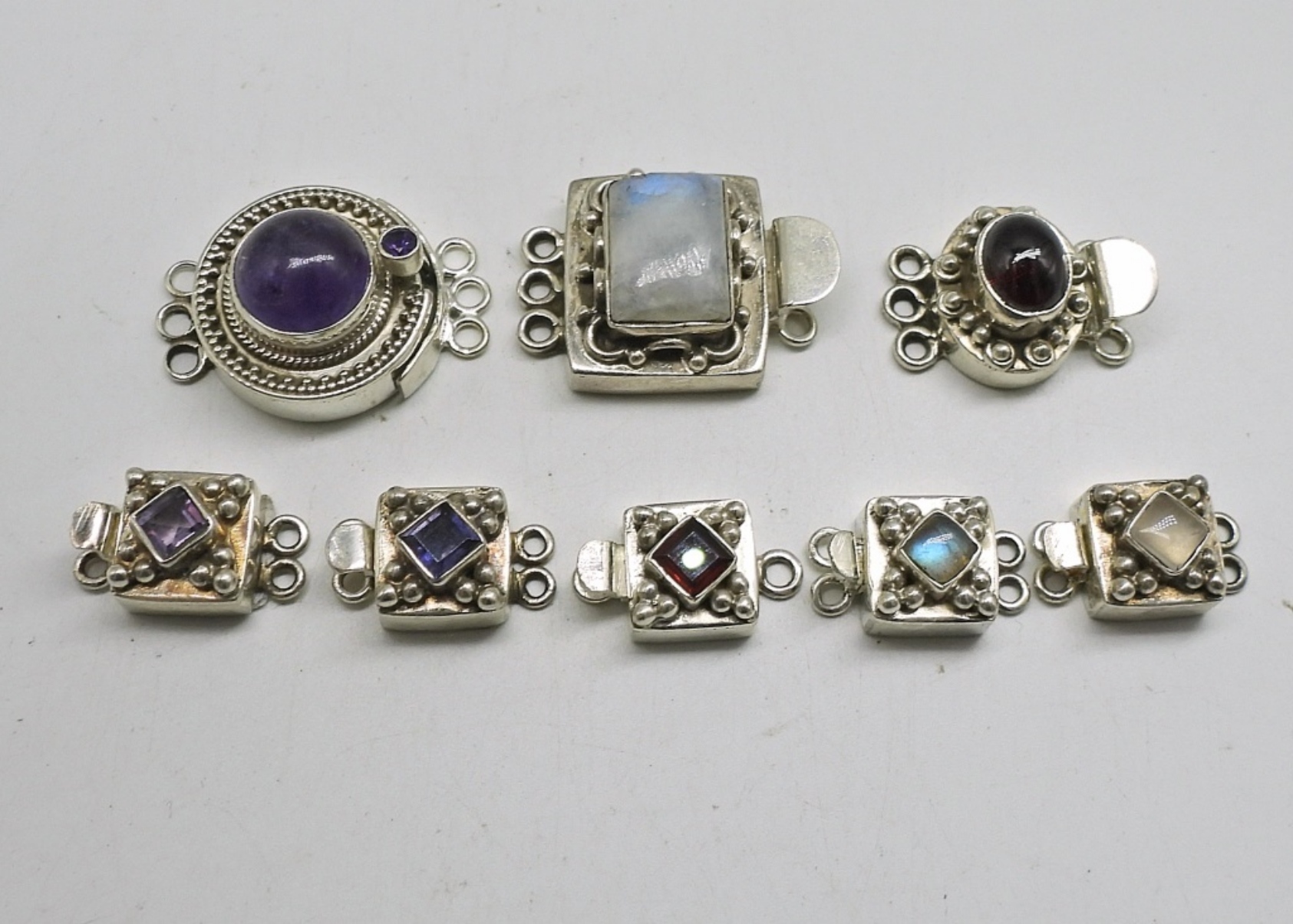 SIX SMALL STERLING BRACELET CLASPS WITH MOONSTONE, AMETHYST, GARNET & MORE. TWO LARGER BRACELET CLASPS WITH MOONSTONE AND AMETHYST. GREAT PIECES FOR MAKING YOUR OWN BRACELETS OR NECKLACES, VERY PRETTY! 30 DWT