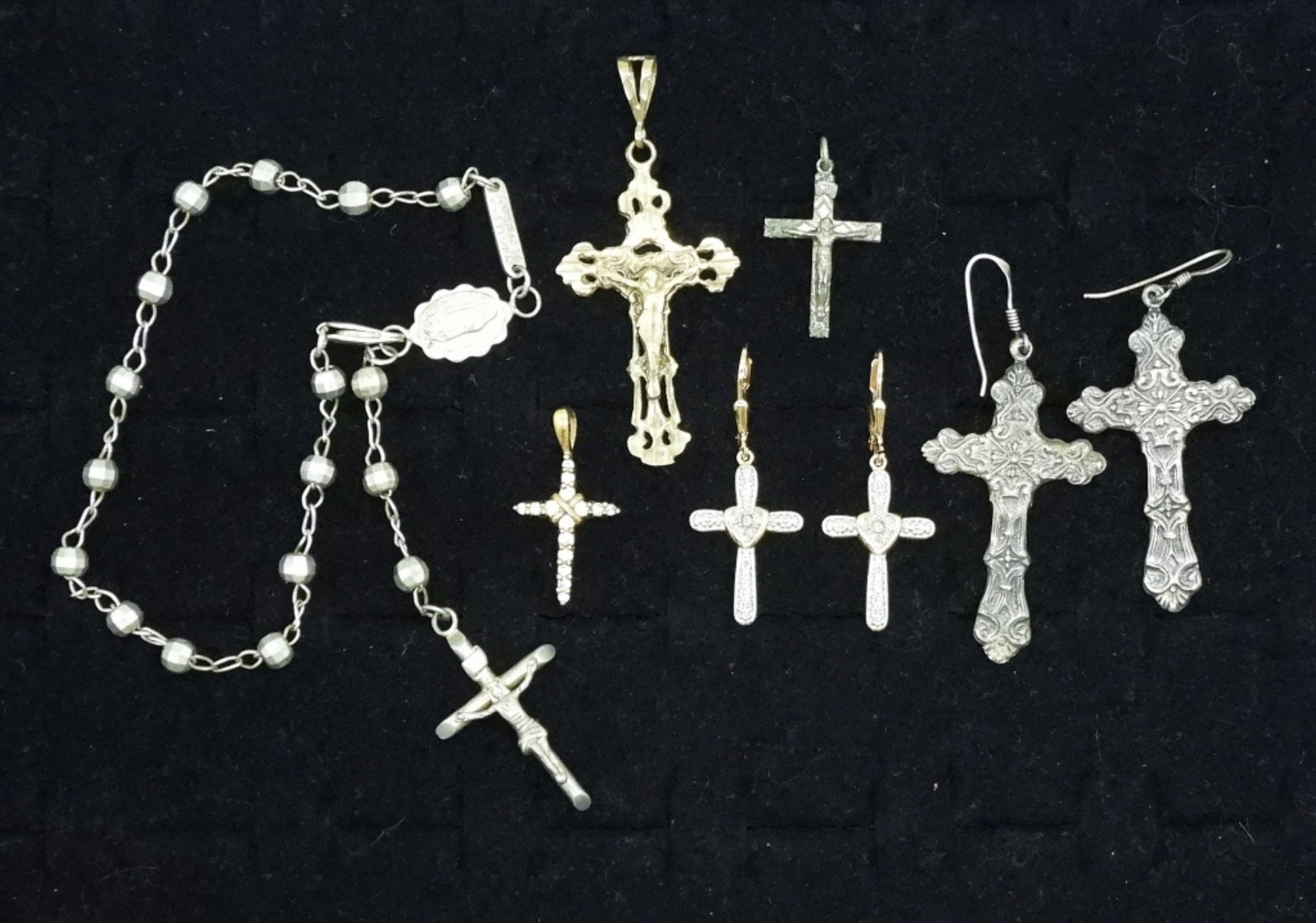 STERLING BRACELET LENGTH ROSARY, 12.5″. THREE STERLING CROSS PENDANTS, 1″ & 2″. TWO PAIR OF PIERCED CROSS EARRINGS, 1.5″ & 2″. 17 DWT