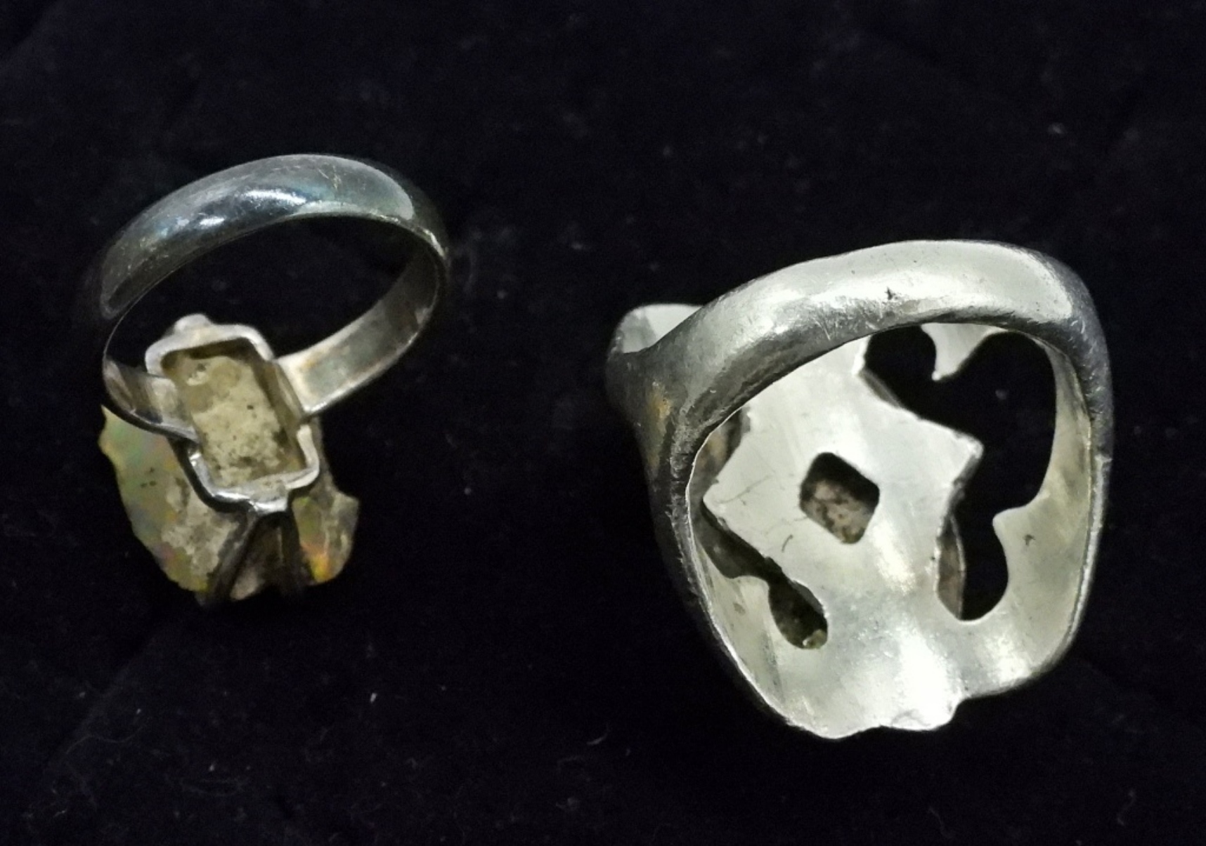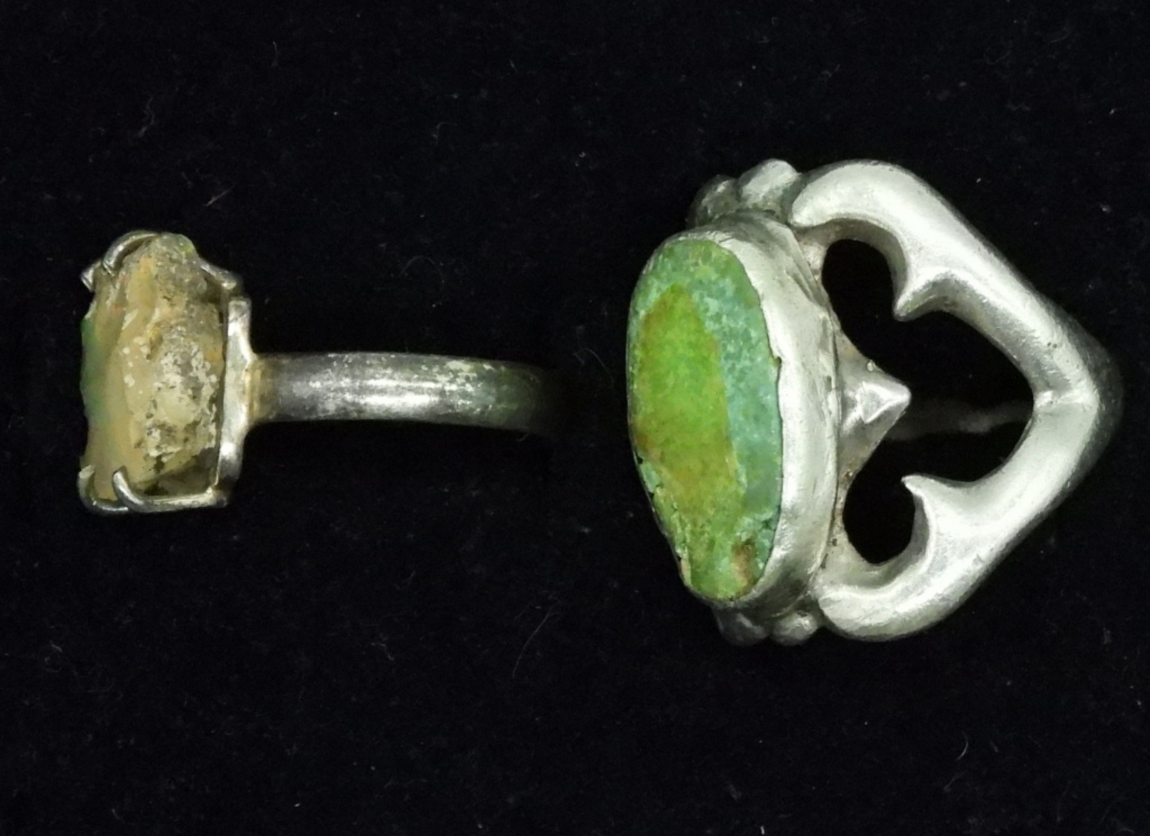 STERLING RINGS, ONE IS A LARGE CHUNK OF RAW TURQUOISE AND ONE WITH A MEDIUM SIZE CHUNK OF OPAL. VERY UNIQUE, VERY INTERESTING RINGS! SIZES 6 & 9. 11.6 DWT