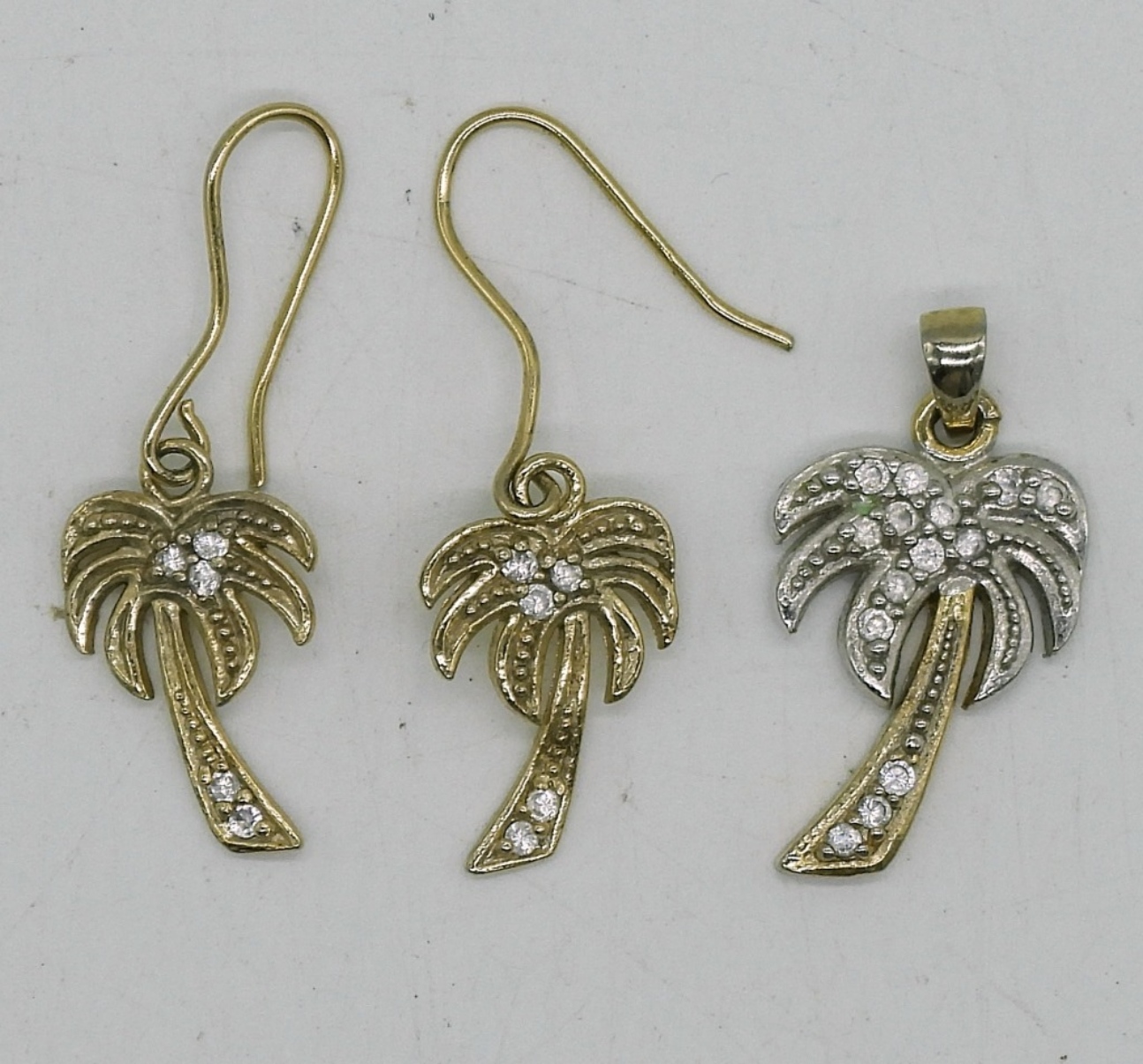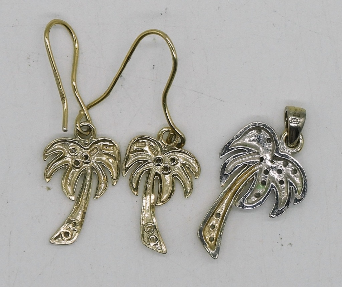 STERLING GOLD TONE PALM TREE DANGLING PIERCED EARRINGS AND PENDANT. SMALL, CUTE SET. 2.7 DWT
