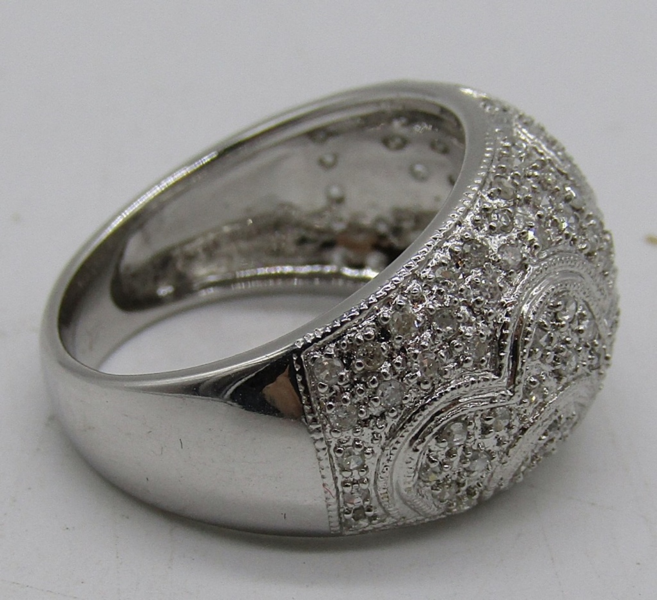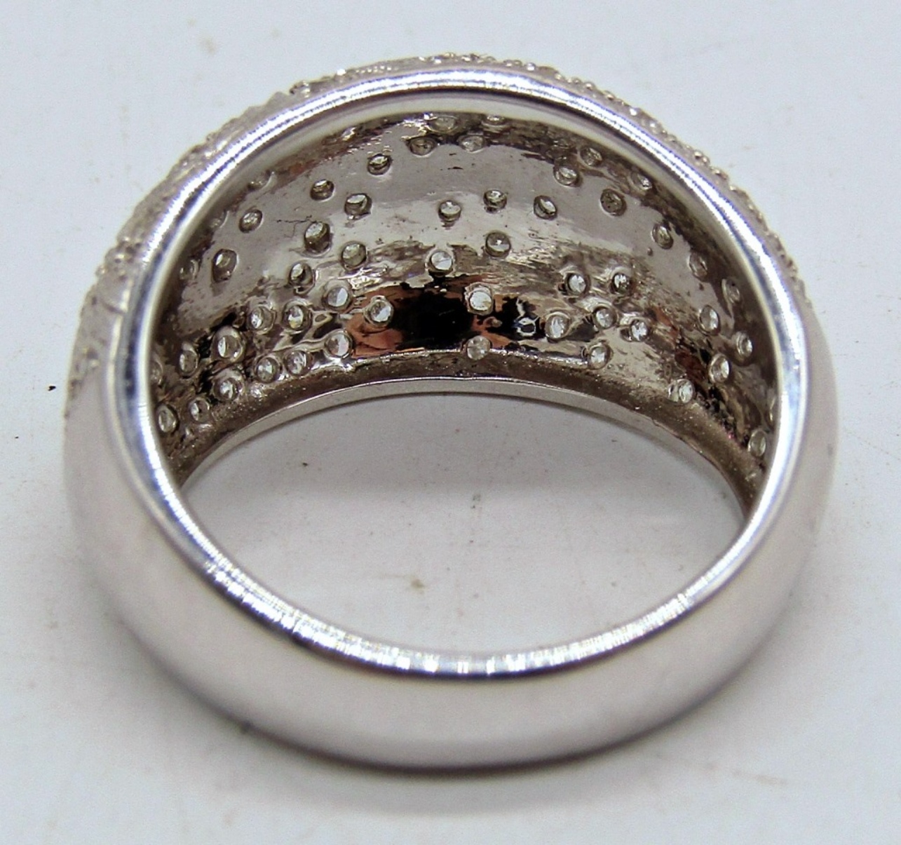 GORGEOUS 14K WHITE GOLD RING WITH MOISSANITE GEMSTONES IN A FLOWER PATTERN. SIZE 7. INCREDIBLY BEAUTIFUL! MISSING ONE GEMSTONE. 4.4 DWT