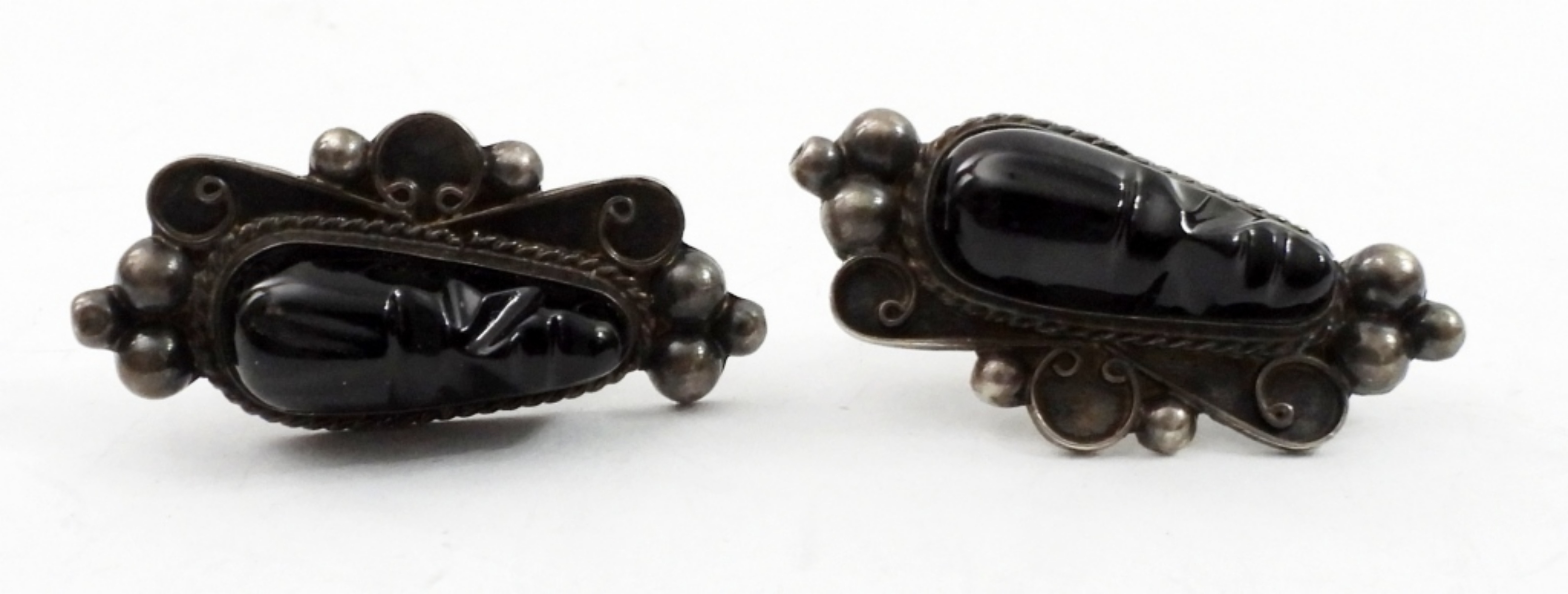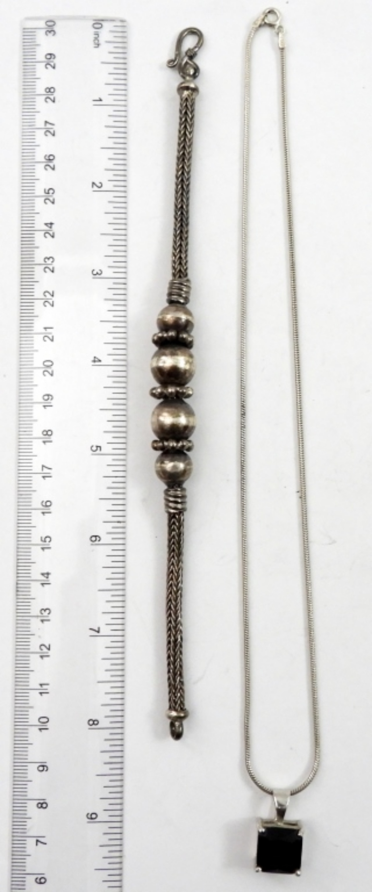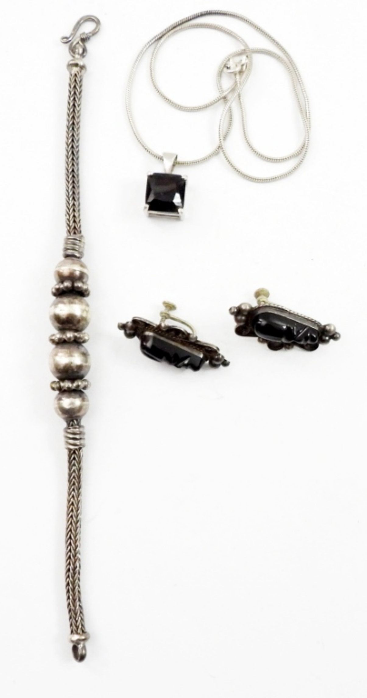 18 IN STERLING NECKLACE WITH A BLACK STONE PENDANT, A PAIR OF STERLING EARRINGS WITH BLACK STONES AND A 7 IN STERLING BALL BEAD BRACELET.35.1 DWT