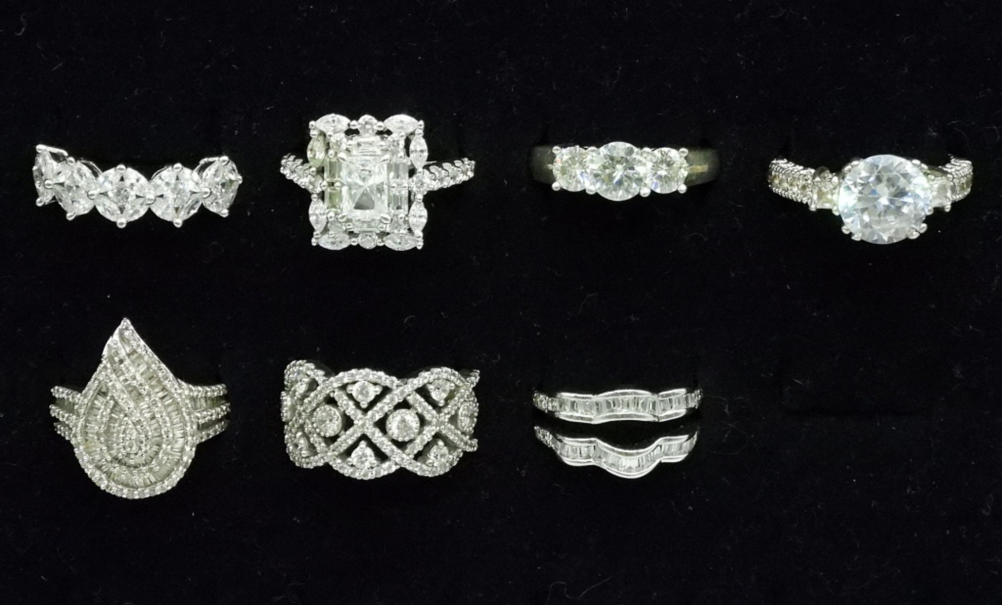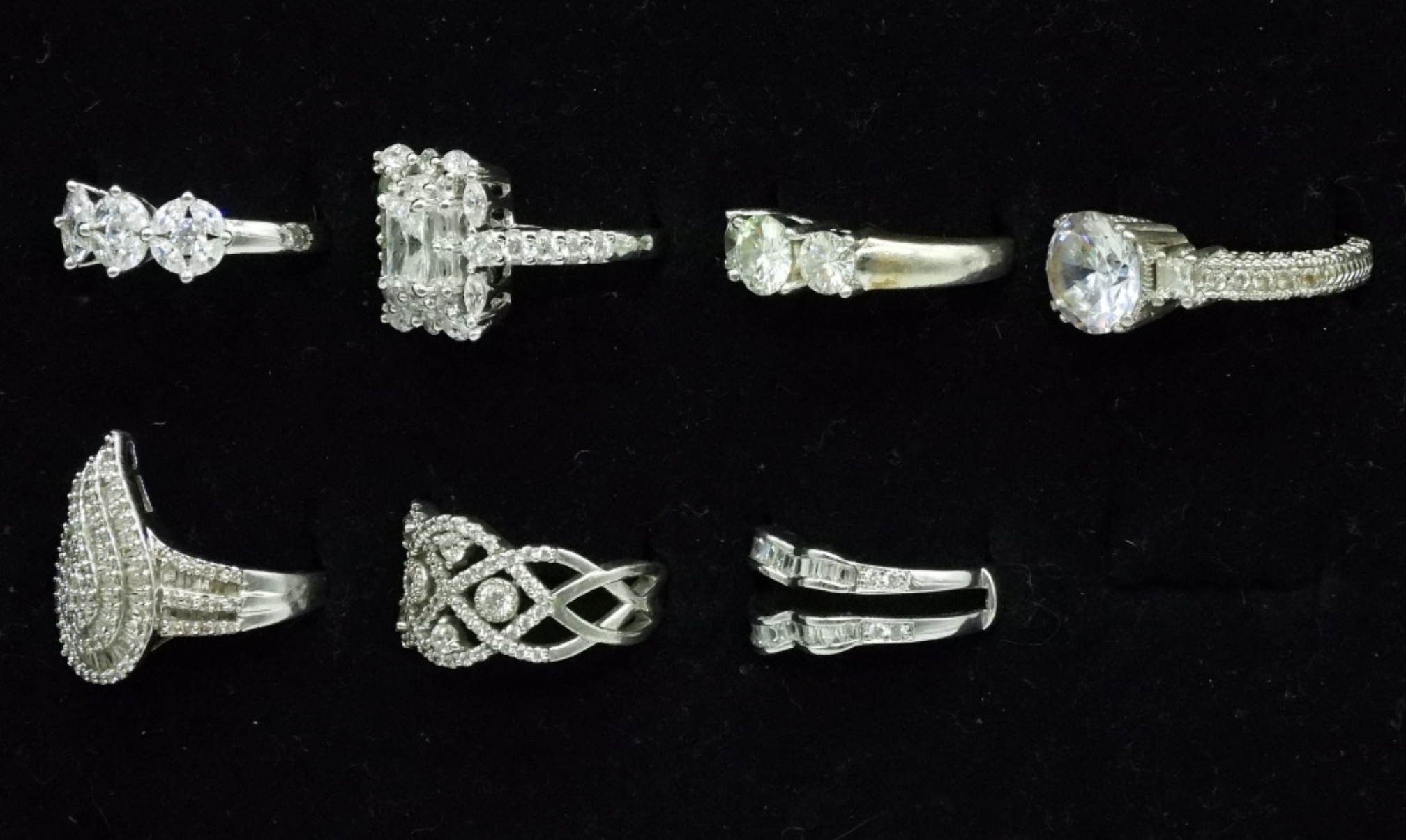 SEVEN STUNNING STERLING SILVER RINGS, BRIDAL STYLE. VERY BEAUTIFUL LOT! SIZES 8 & 9. 23.7 DWT