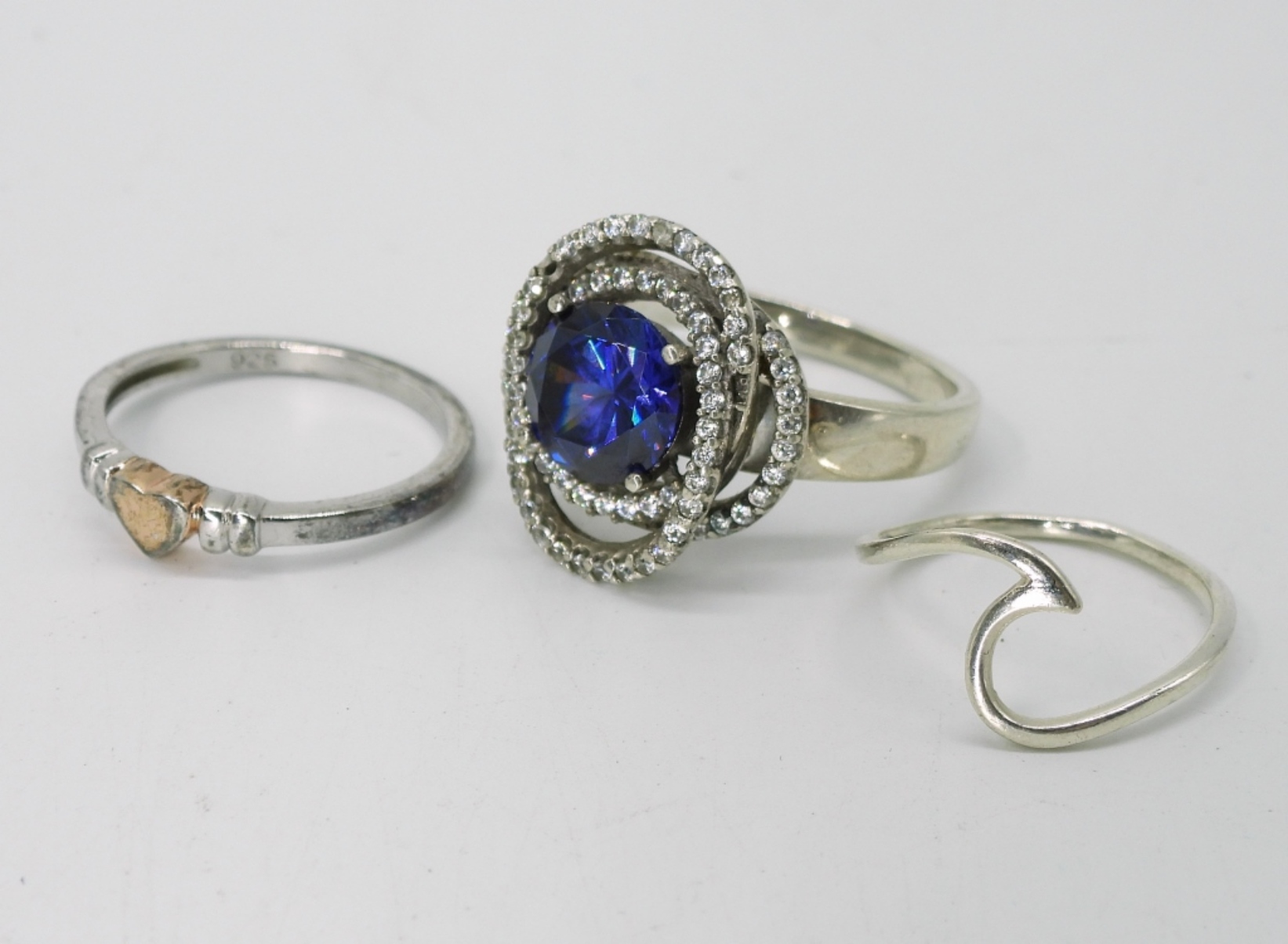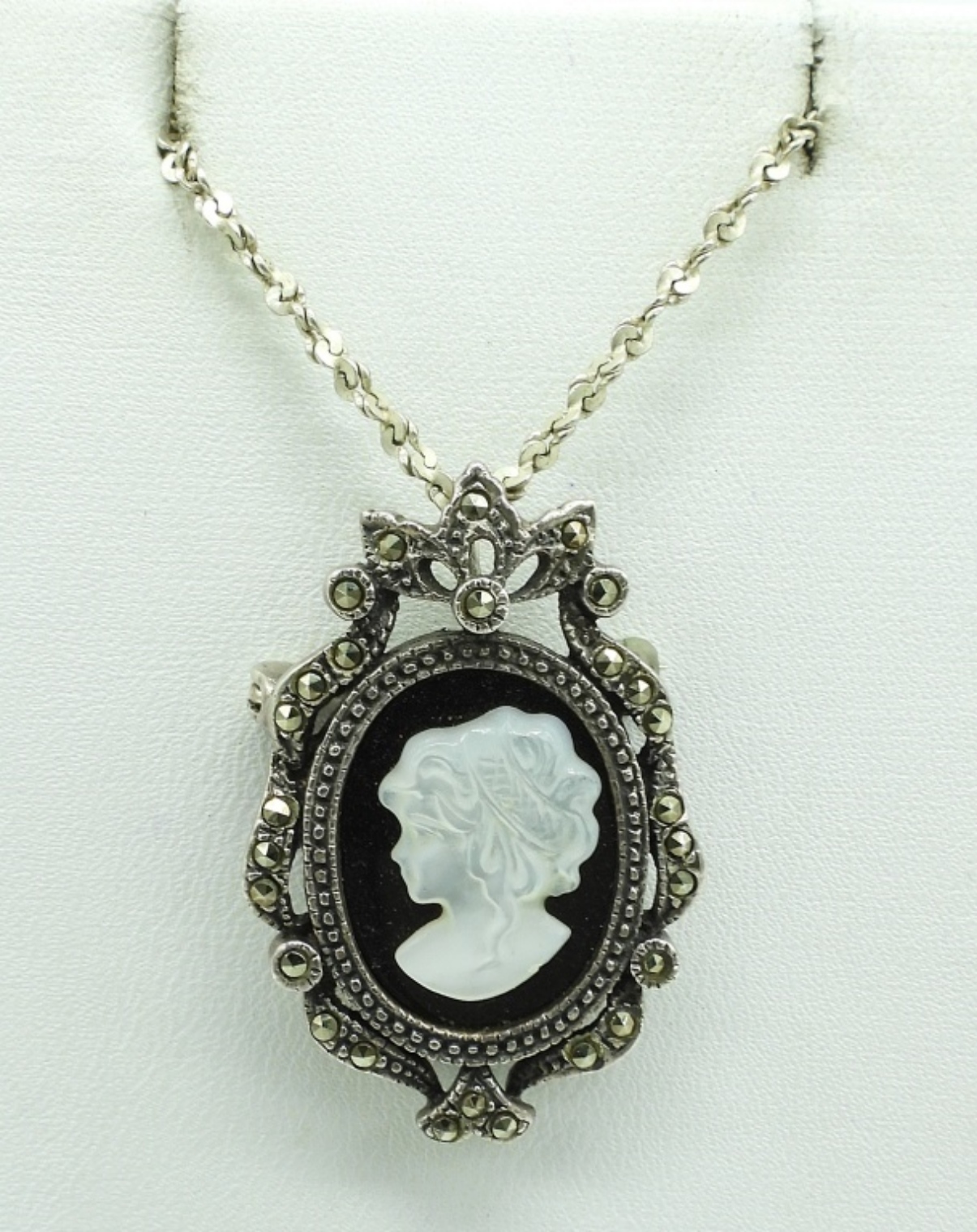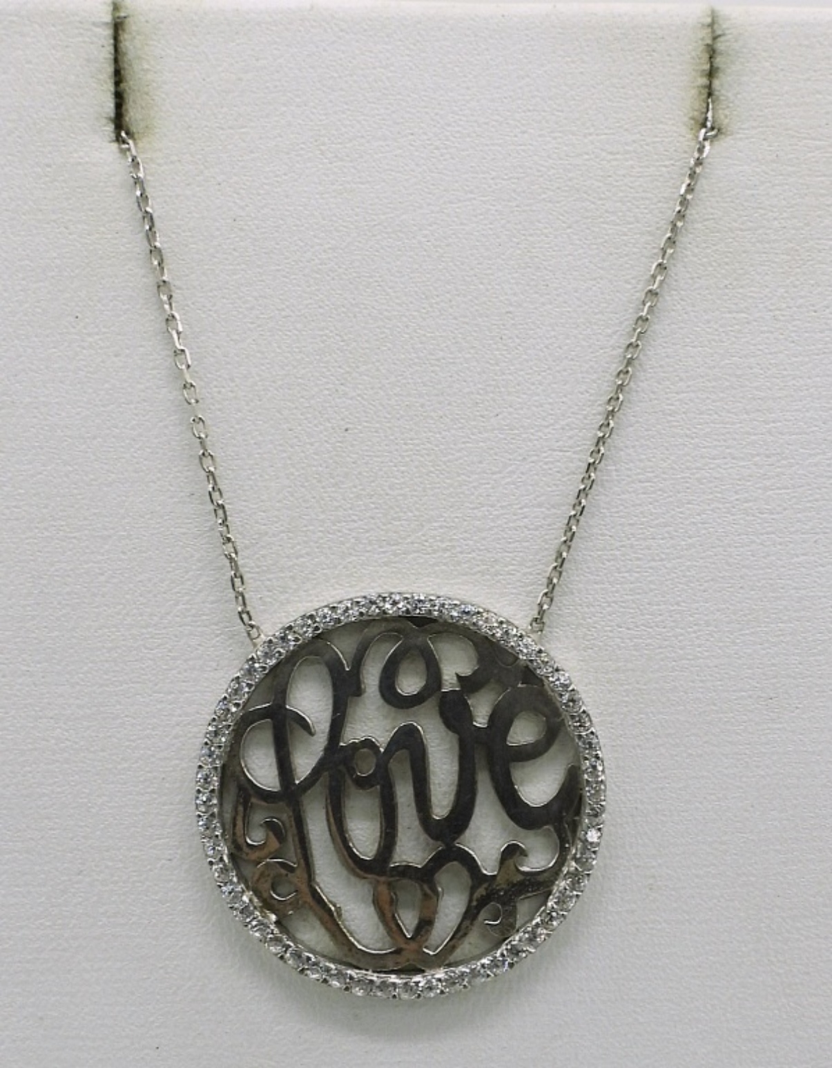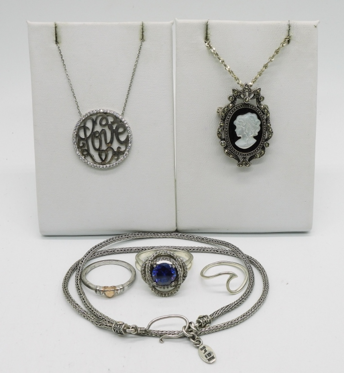THREE STERLING SILVER NECKLACES. CAMEO ON 22″ CHAIN. LOVE PENDANT ON 16″ CHAIN. STERLING CHAIN, 17″. THREE STERLING RINGS, SIZES 6, 8, 10. 23.5 DWT