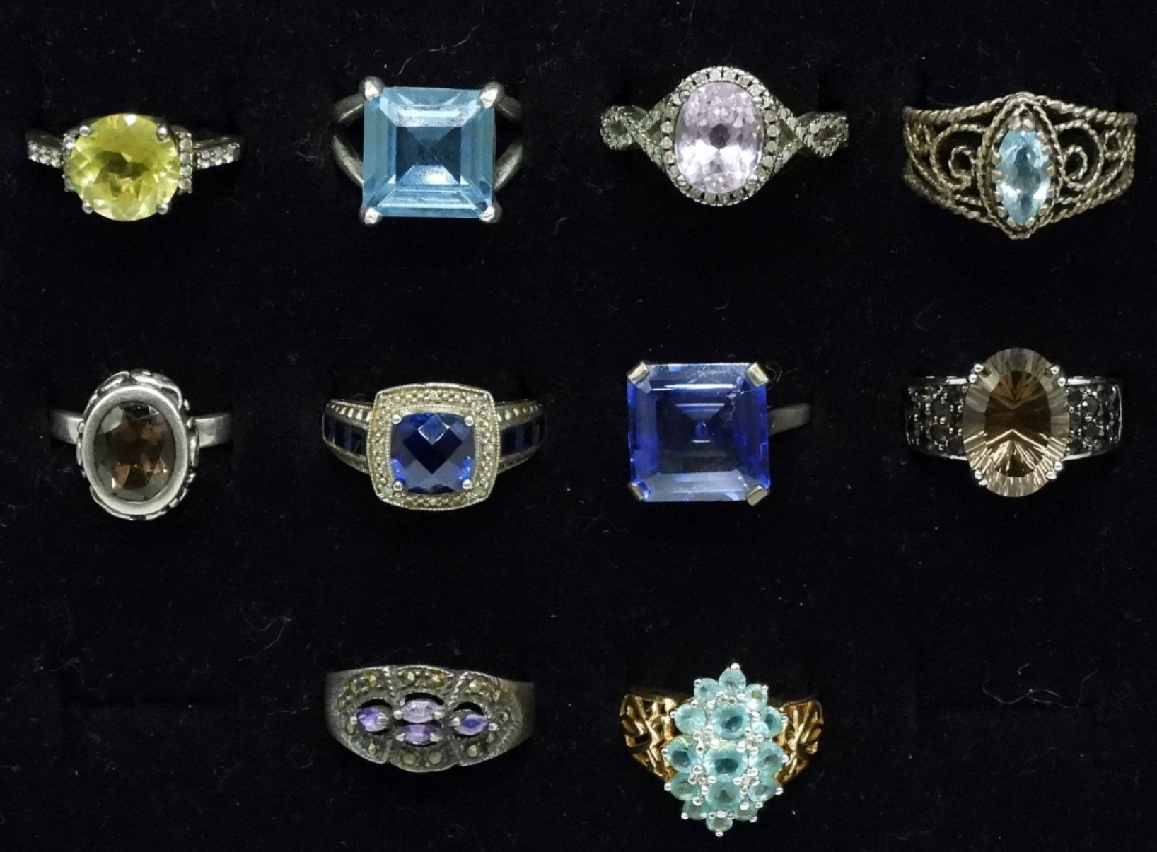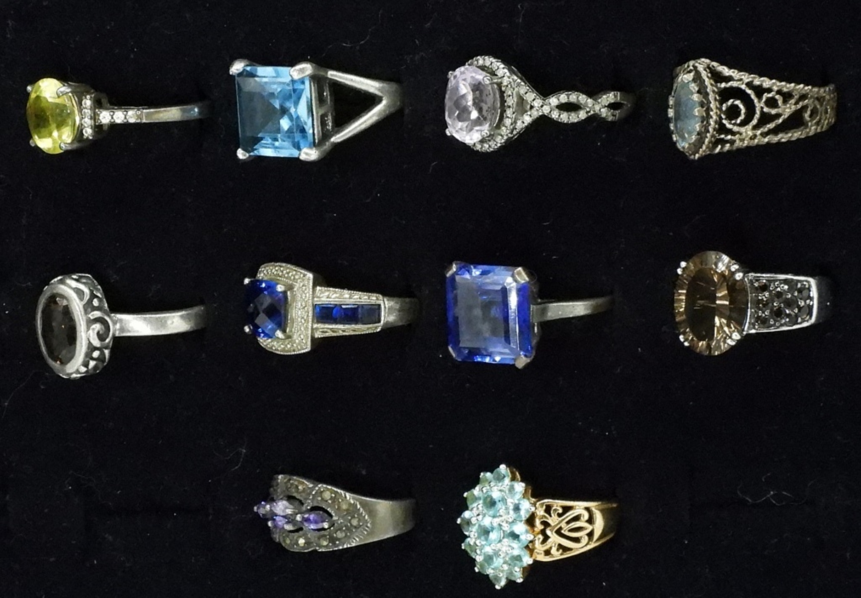 TEN GEMSTONE STERLING FASHION RINGS, SIZES 6-10. 31.9 DWT