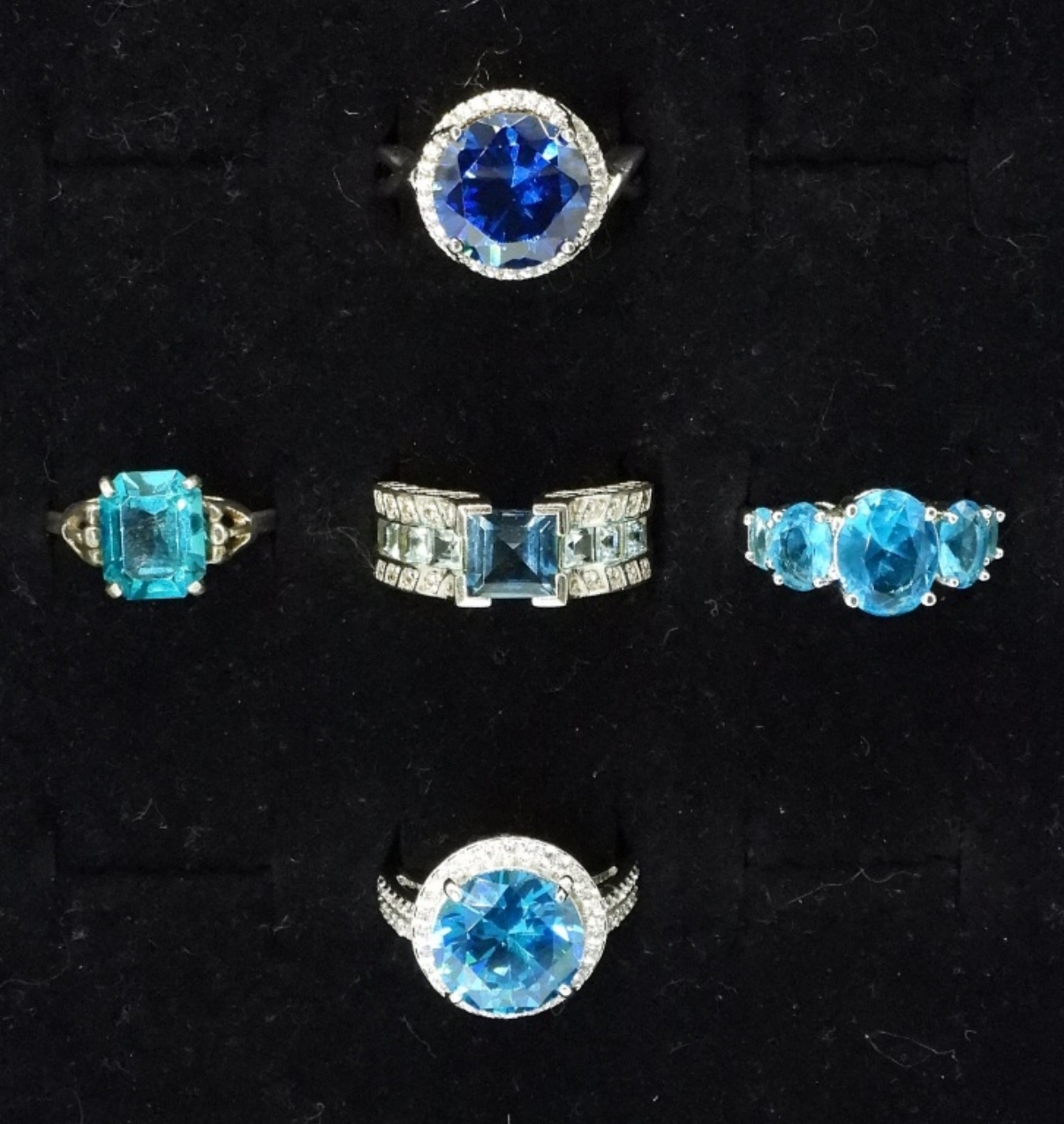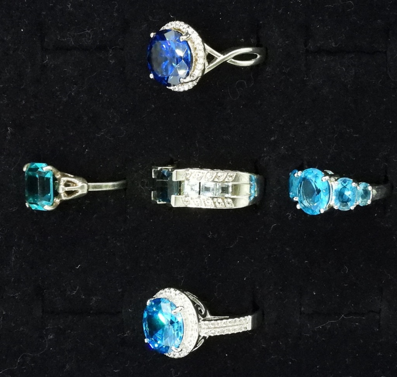 FIVE STERLING RINGS ALL WITH SHADES OF BLUE GEMSTONES. SIZES 6, 7, 8. 17 DWT