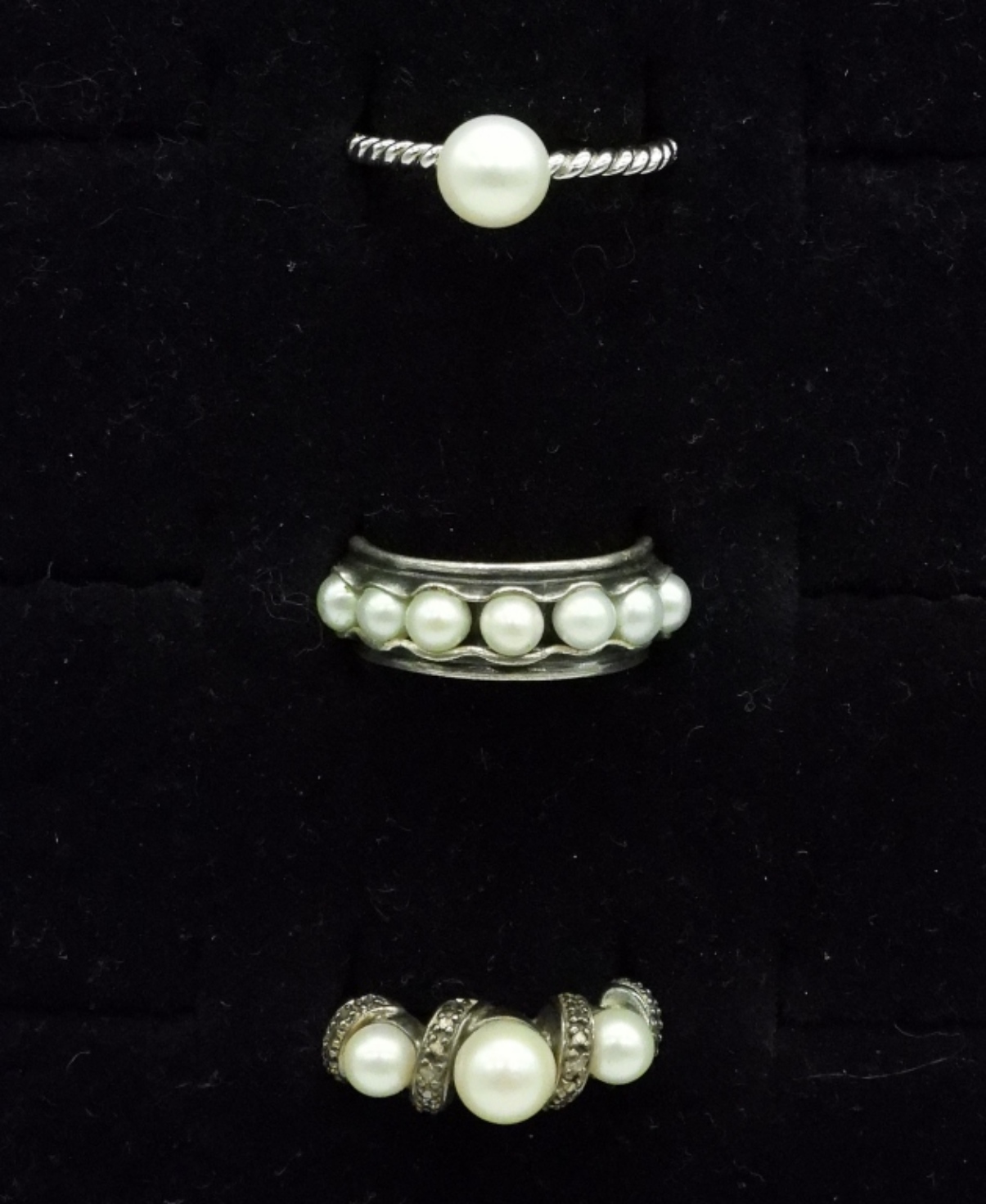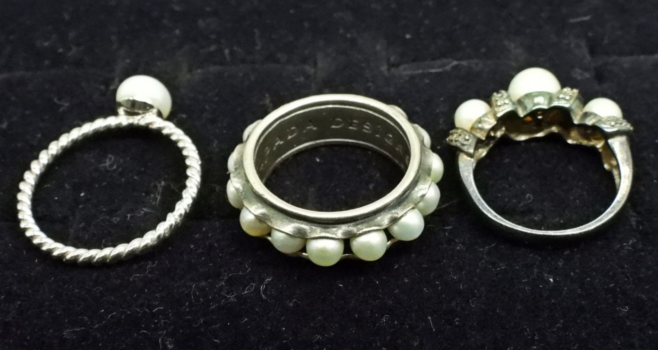 THREE STERLING SILVER RINGS WITH PEARLS. ONE IS MARKED “SILPADA DESIGNS”. SIZES 6, 7, 9. 7.7 DWT
