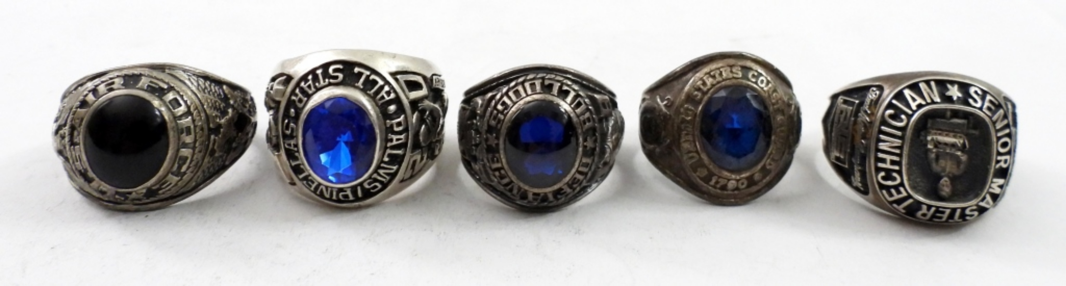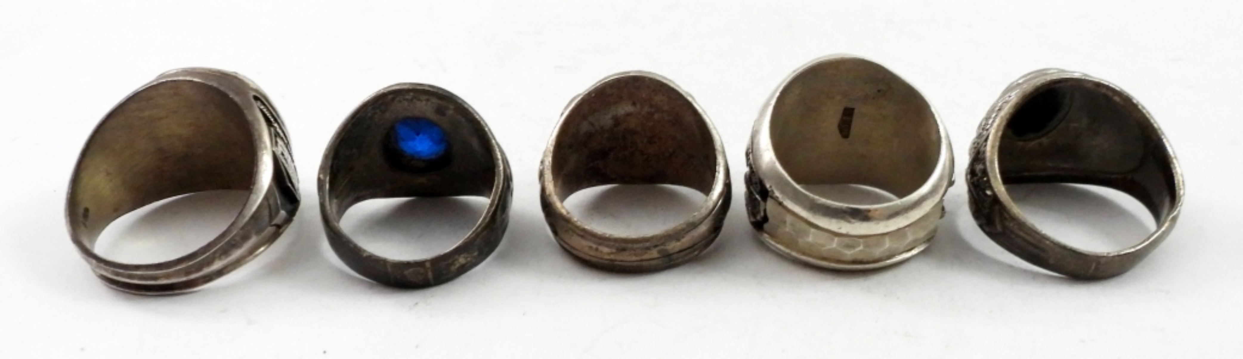 5 MENS STERLING CLASS RINGS ,SIZES10,11,14.VARIOUS STONES.52.8 DWT