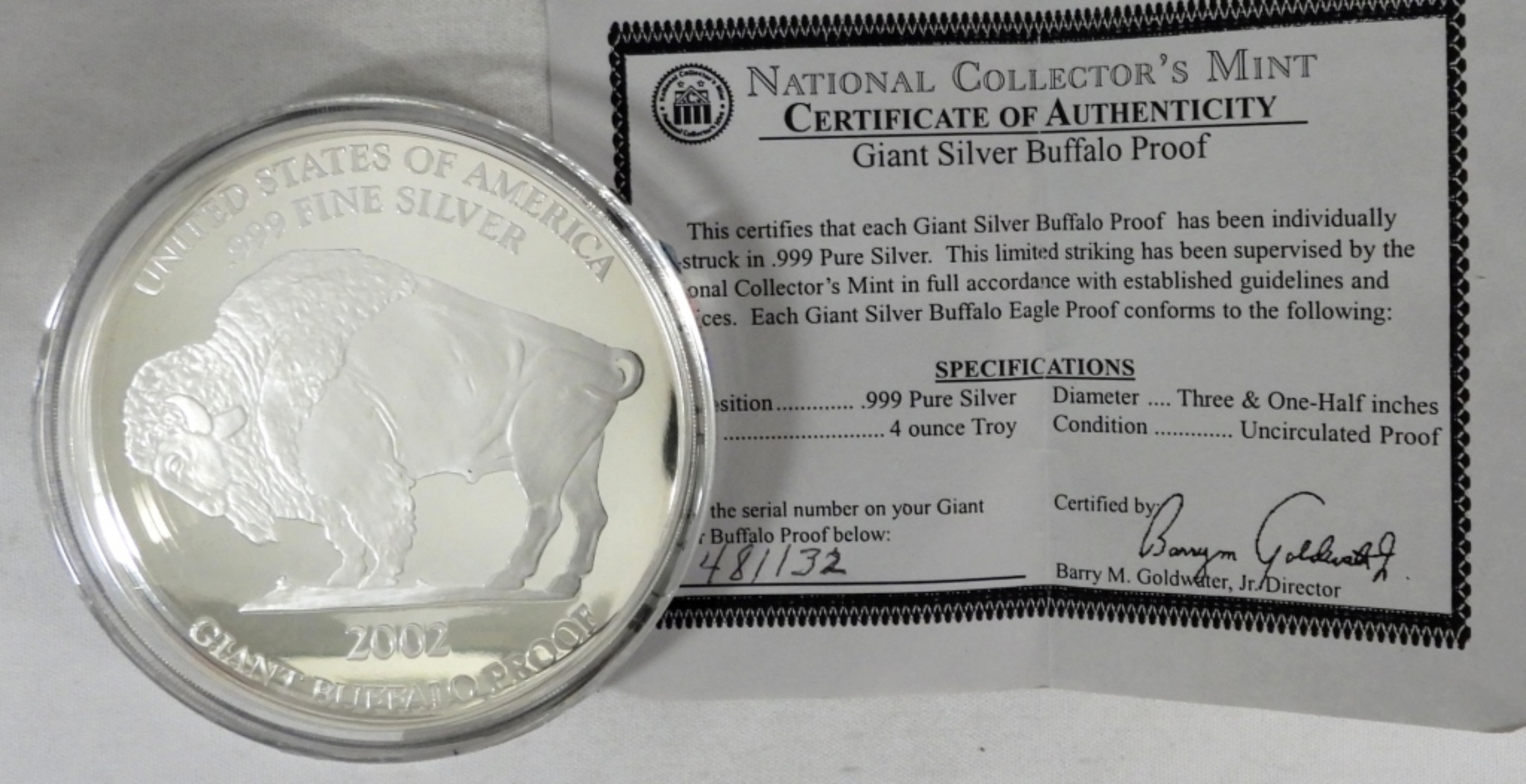2002 GIANT BUFFALO SILVER PROOF COIN .999 PURE SILVER 4OZ TROY , UNCIRCULATED PROOF w/COA AND COLLECTORS CASE