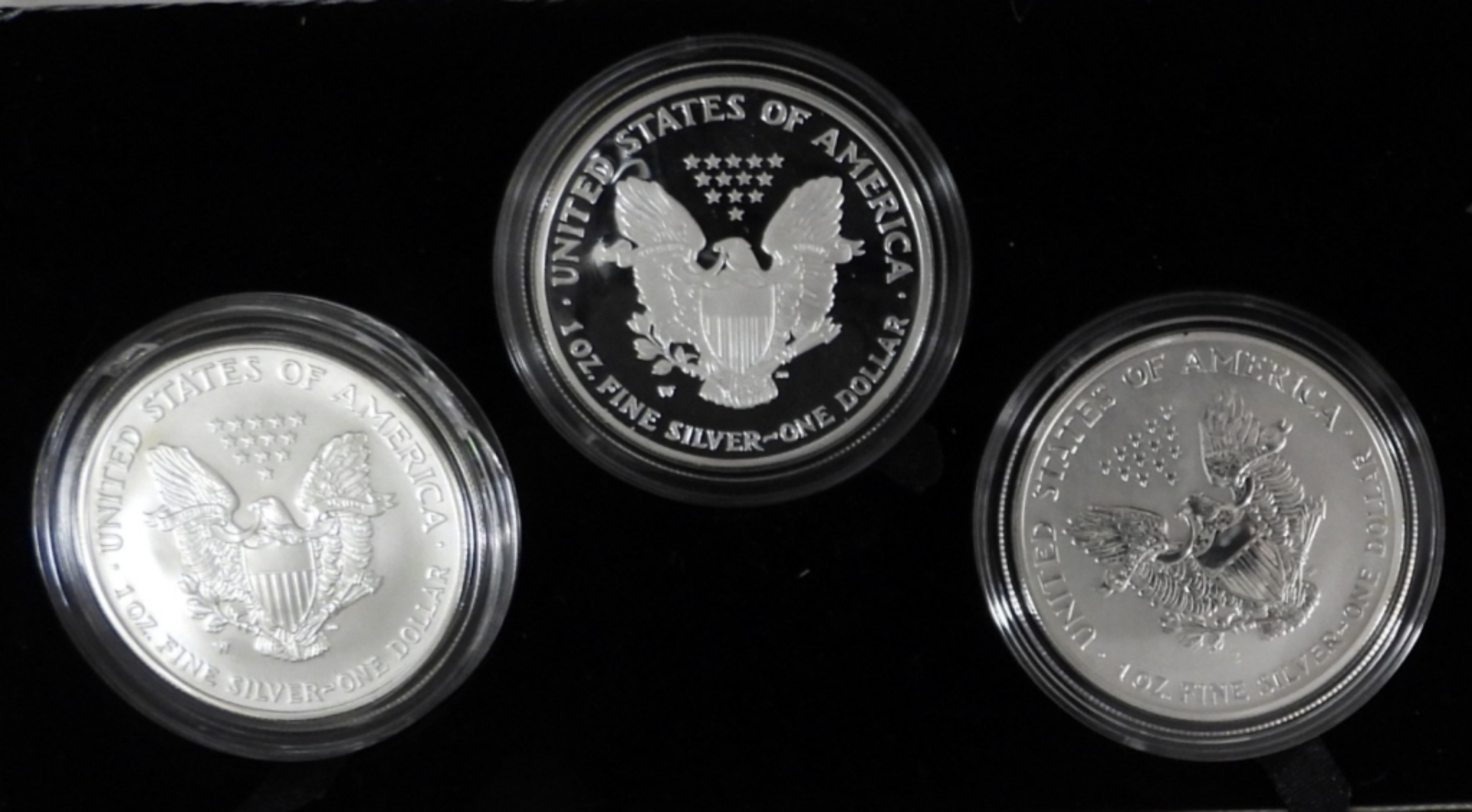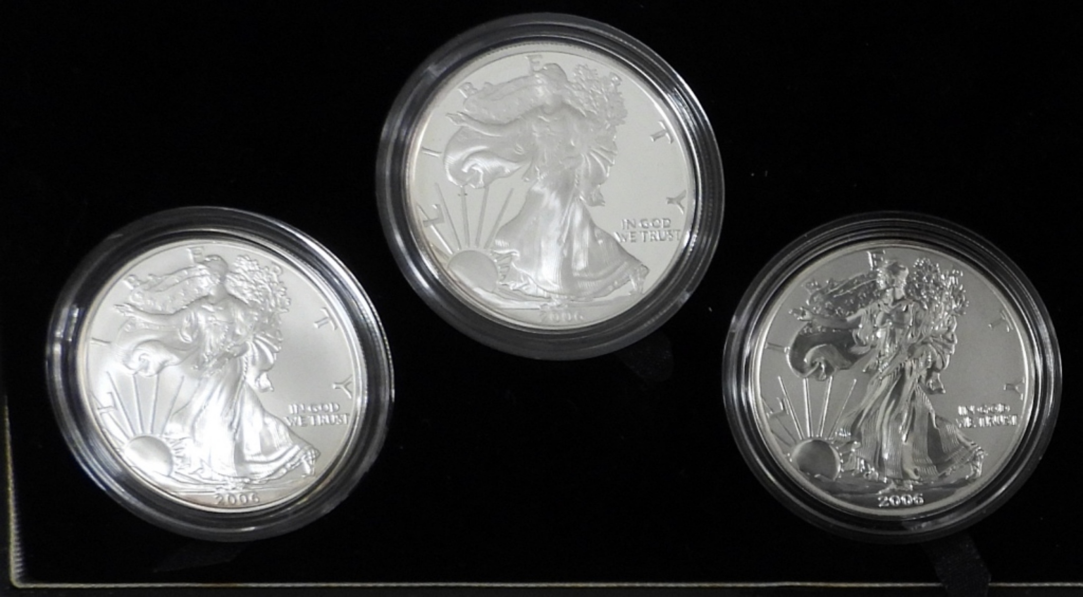 2006-W UNCIRCULATED, 2006-P REVERSE PROOF, & 2006-W PROOF AMERICAN SILVER EAGLES IN OGP W/ COA. SLIGHTLY DAMAGED CASE & SLEEVE.
