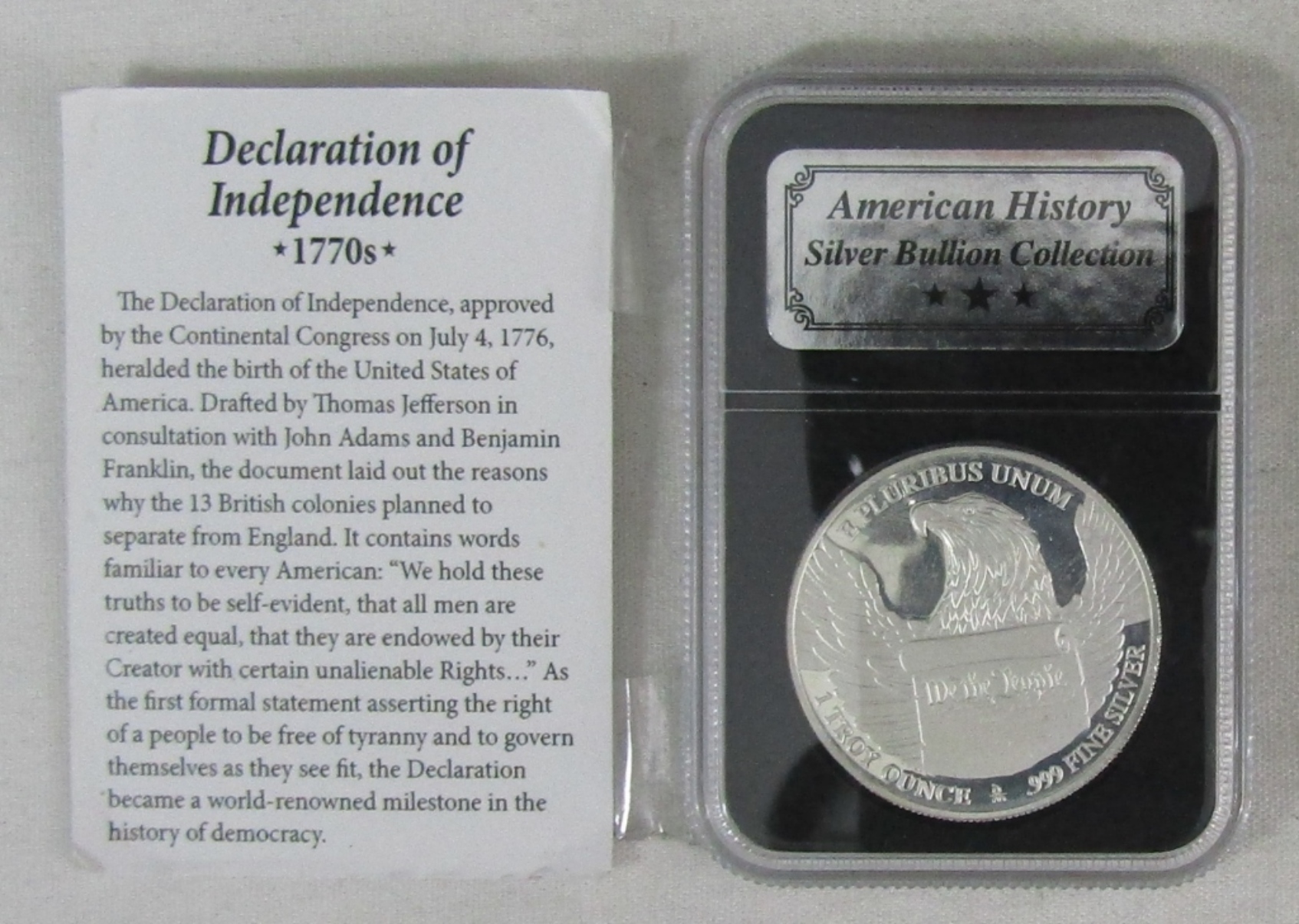 AMERICAN HISTORY SILVER BULLION COLLECTION DECLARATION OF INDEPENDENCE 1770’S 1OZ TROY 999 SILVER COIN w COA