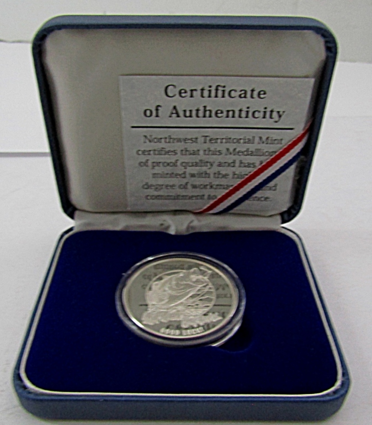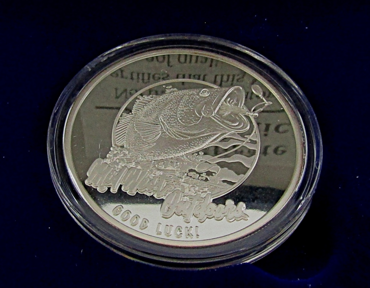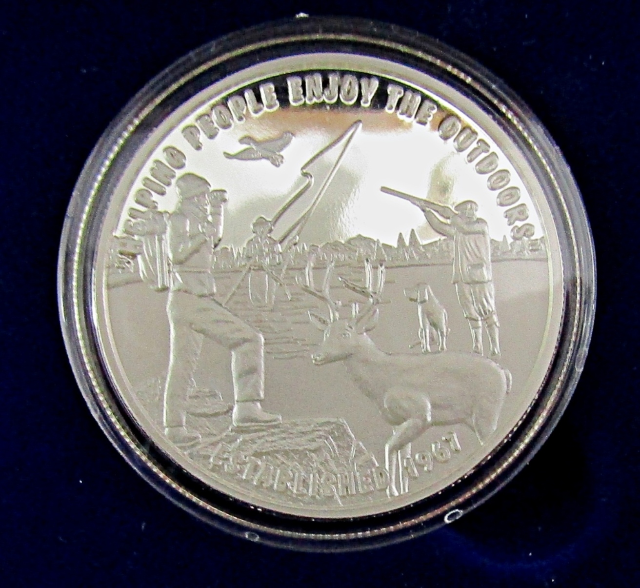 MIDWEST OUTDOORS GOOD LUCK MEDALLION “HELPING PEOPLE ENJOY THE OUTDOORS” IN DISPLAY BOX WITH COA. NORTHWEST TERRITORIAL MINT.