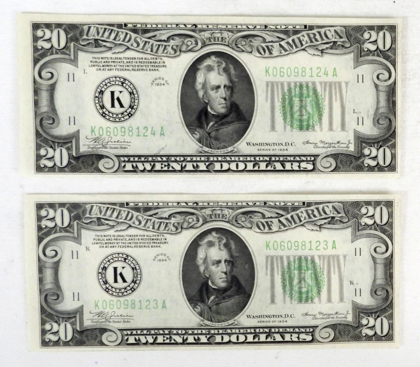 (2)1934 $20 FEDERAL NOTES CONSECUTIVE NUMBERS ,UNCIRCULATED
