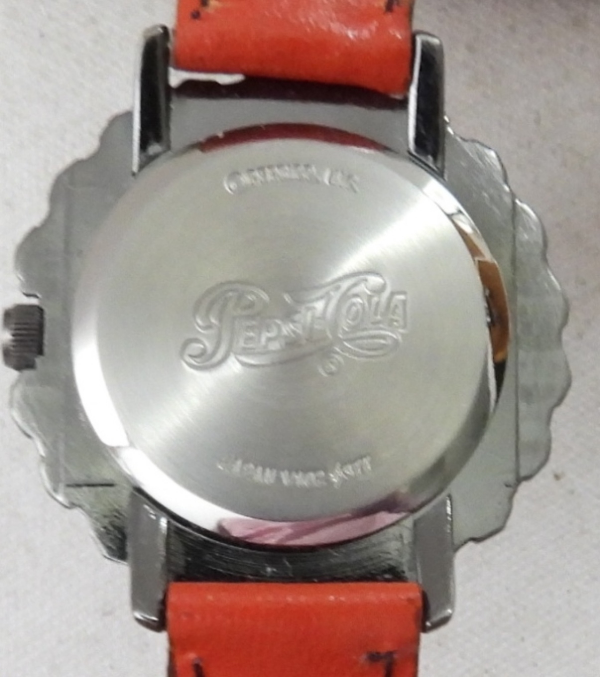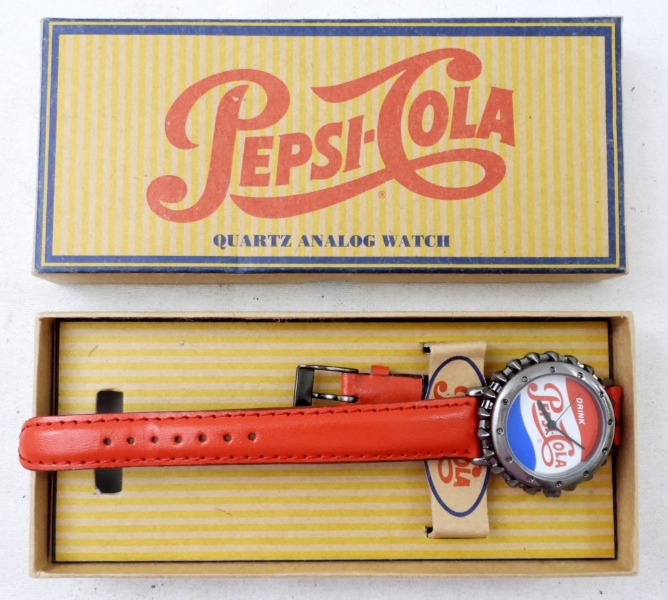 VINTAGE PEPSI-COLA BOTTLE CAP LOGO WATCH RED, WHITE & BLUE FACE WITH A RED LEATHER BAND, IN ORIGINAL PEPSI-COLA BOX WITH PAPERS . NOT TESTED AS TO WORKING OR NOT