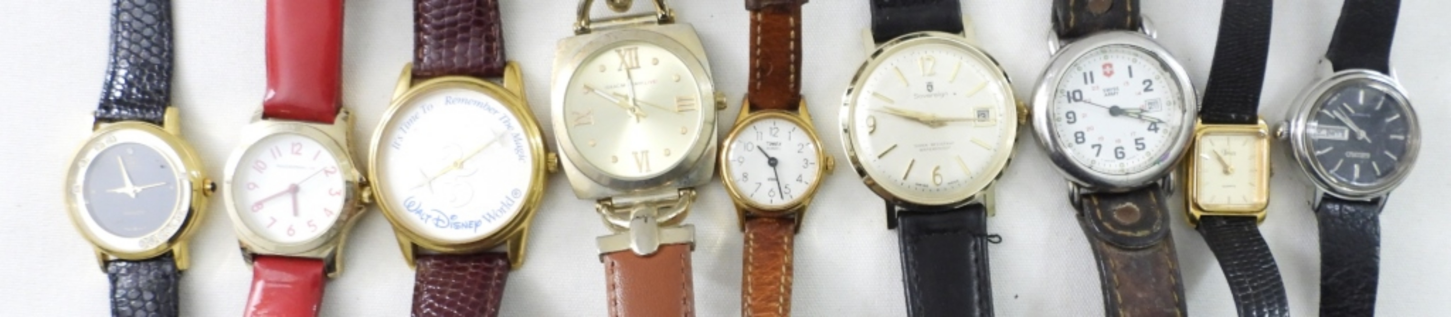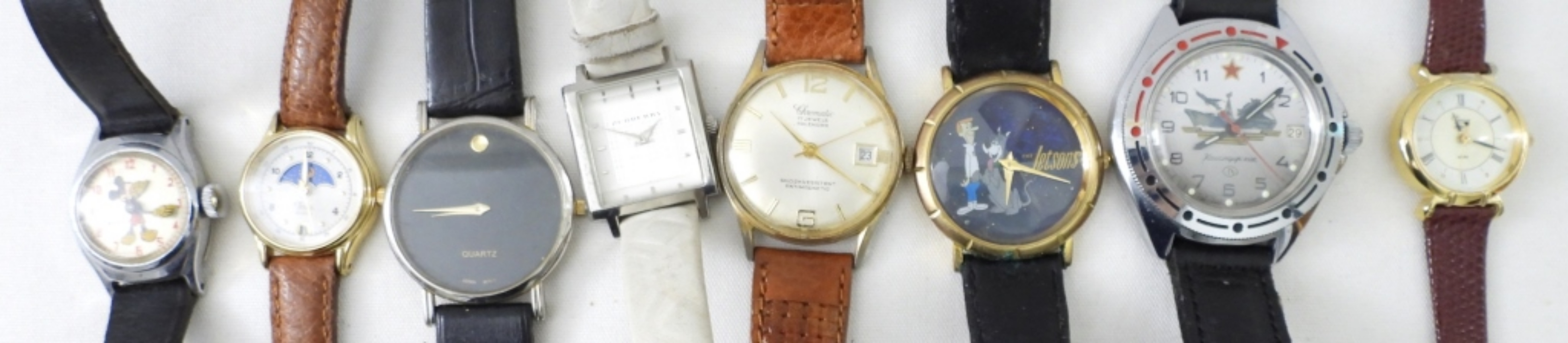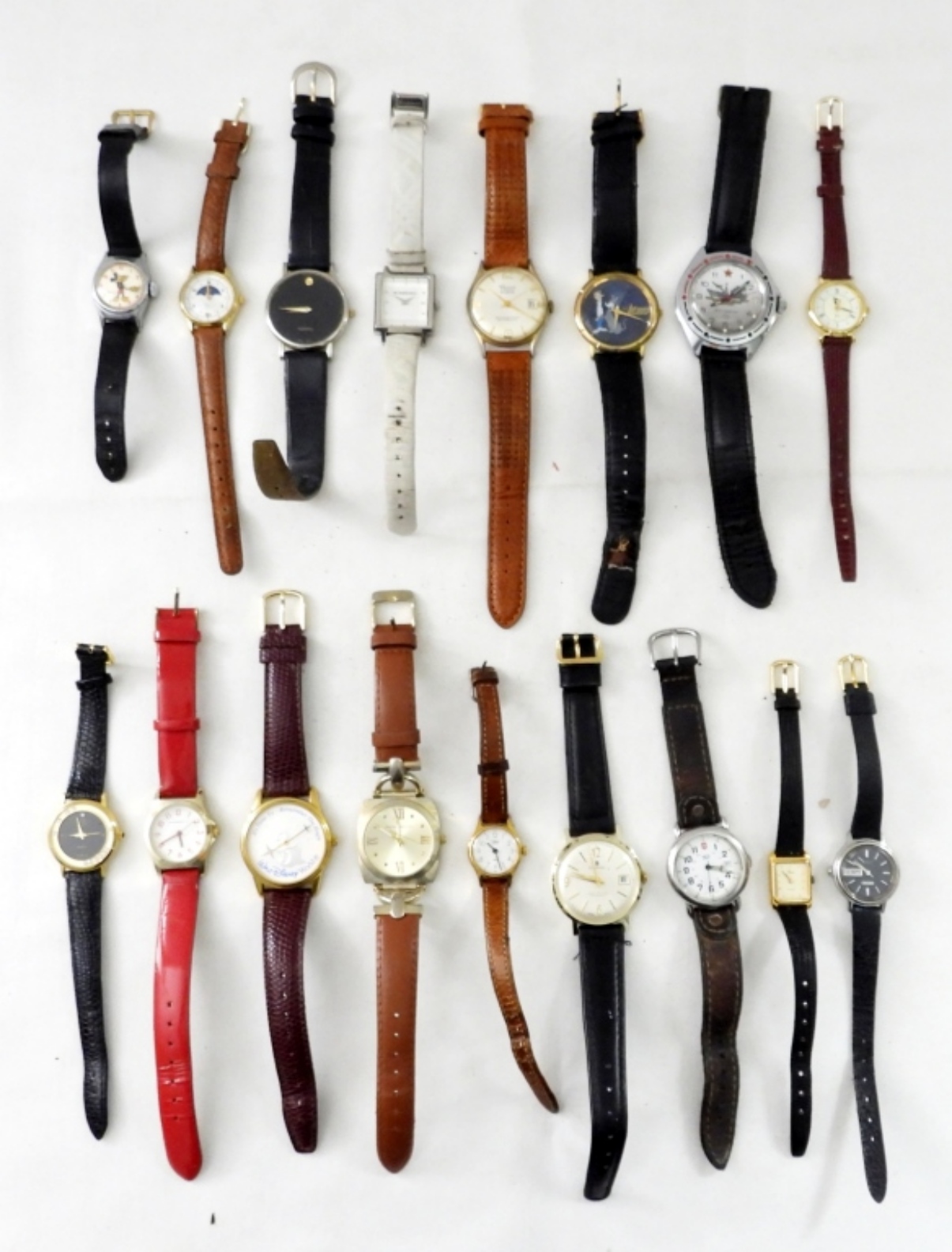 17 LEATHER BAND WATCHES (8 ) BLACK LEATHER BANDS(6) BROWN BANDS (1) RED & (1) WHITE . ASSORTED STYLE FACES.NOT TESTED AS TO WORKING OR NOT