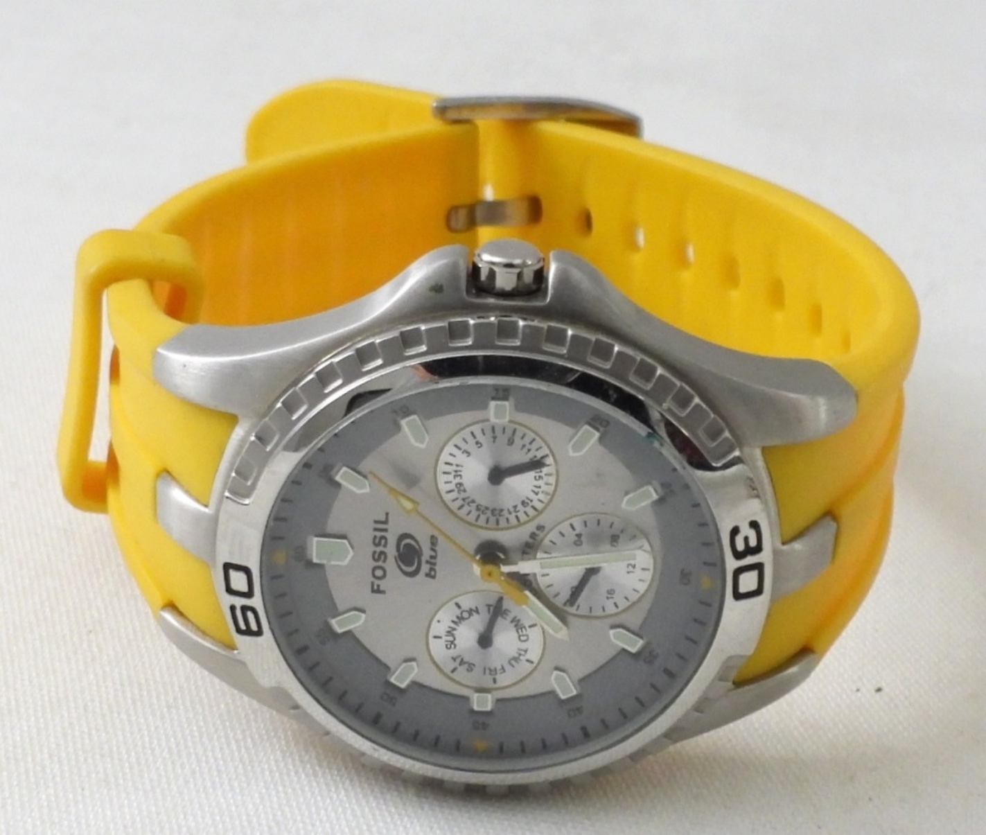 (5) MEN’S LARGE FACE CHRONOGRAPH WATCHES. FOSSIL, ADIDAS, QUARTZ & MORE(3) GOLD AND SILVER TONE(1) SILVER TONE (1 ) YELLOW BAND NOT TESTED AS TO WORKING OR NOT