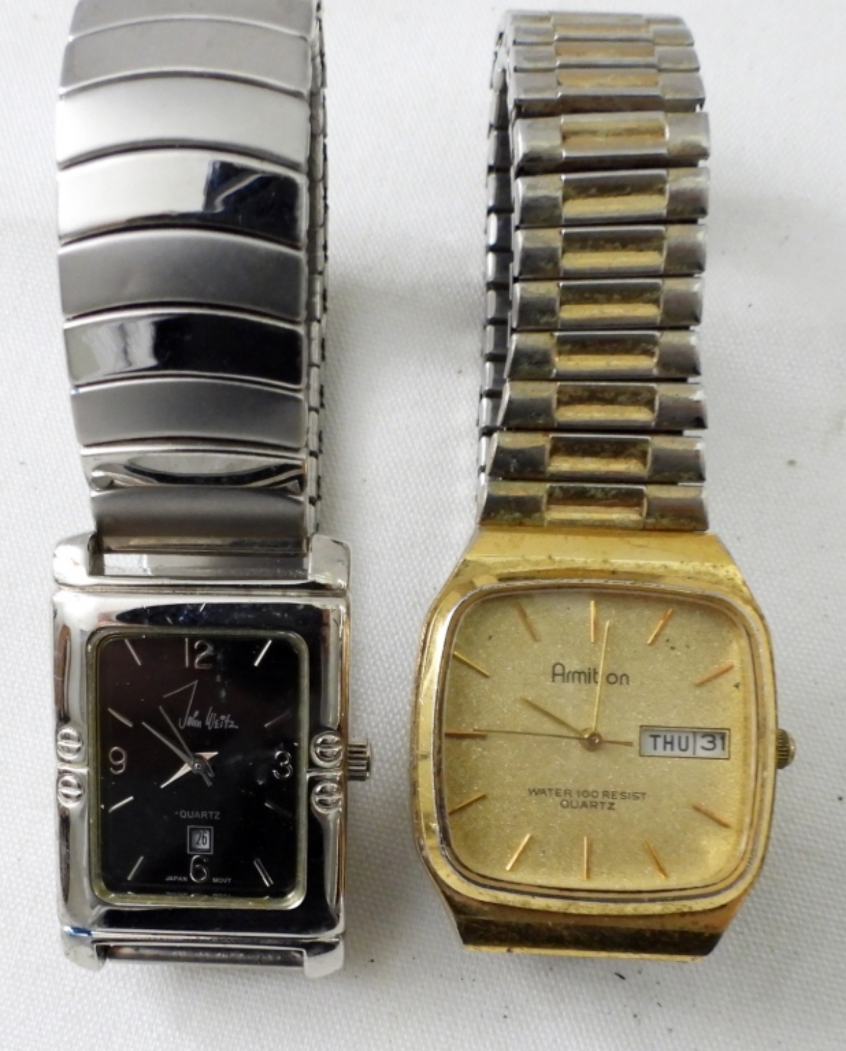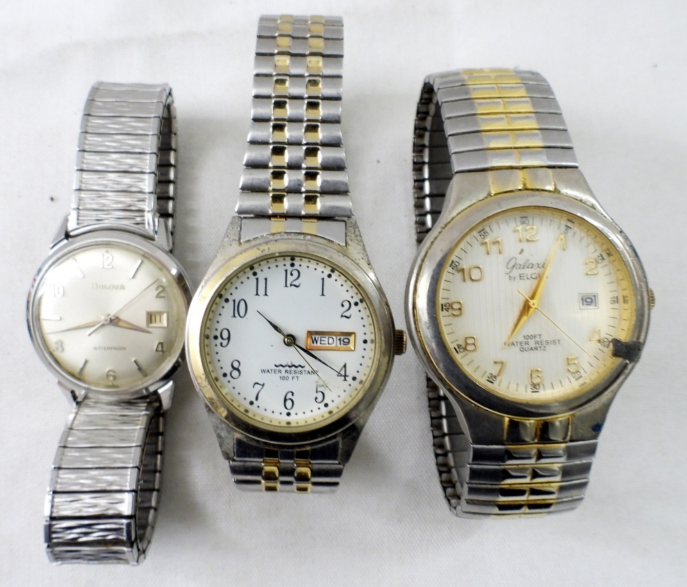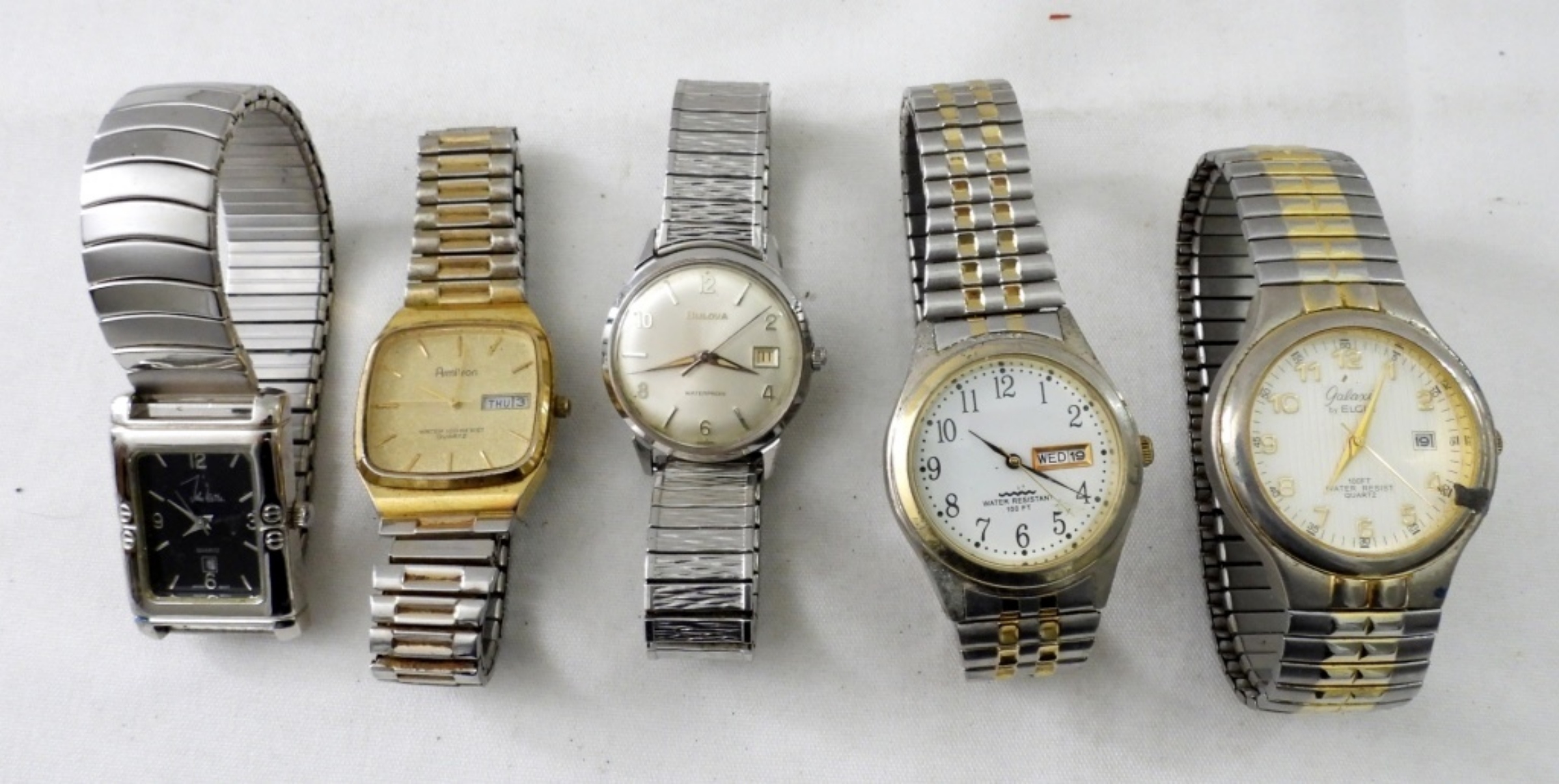 (5) MENS DATE/ DAY WATCHES, ELGIN, QUARTZ & MORE. BOTH SILVER & GOLD TONE. ALL STRETCHY BANDS . NOT TESTED AS TO WORKING OR NOT