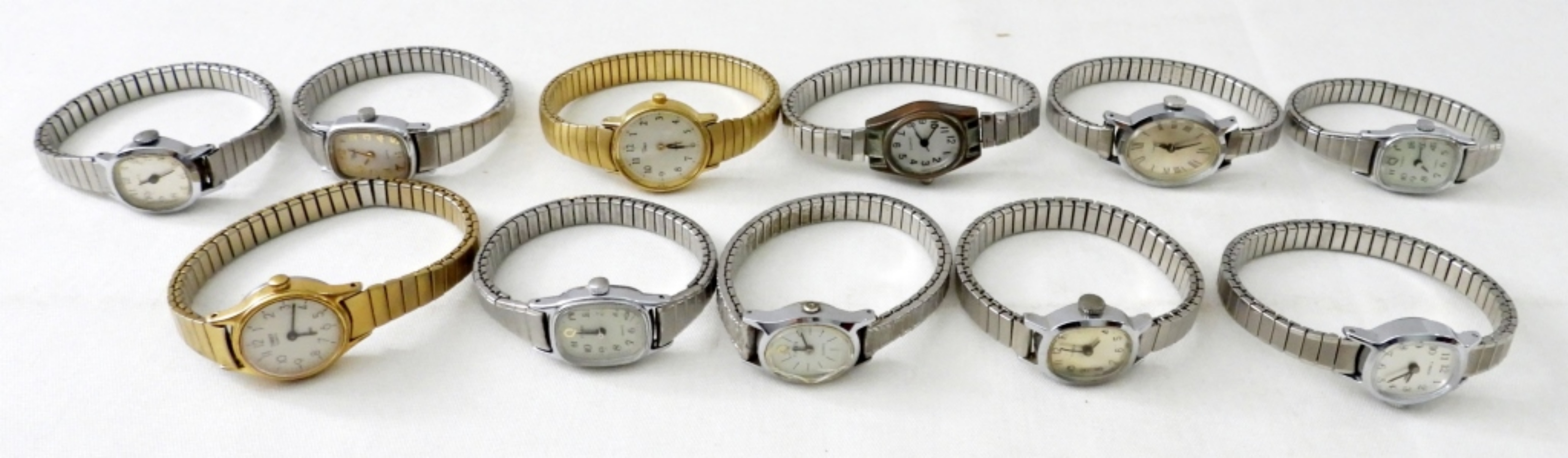 (15) VINTAGE LADIES WATCHES. TIMEX, QUARTZ,& MORE(14 )STRETCHY BAND (1)CLASP BAND (5) GOLD TONE,(10) SILVER TONE . NOT TESTED AS TO WORKING OR NOT