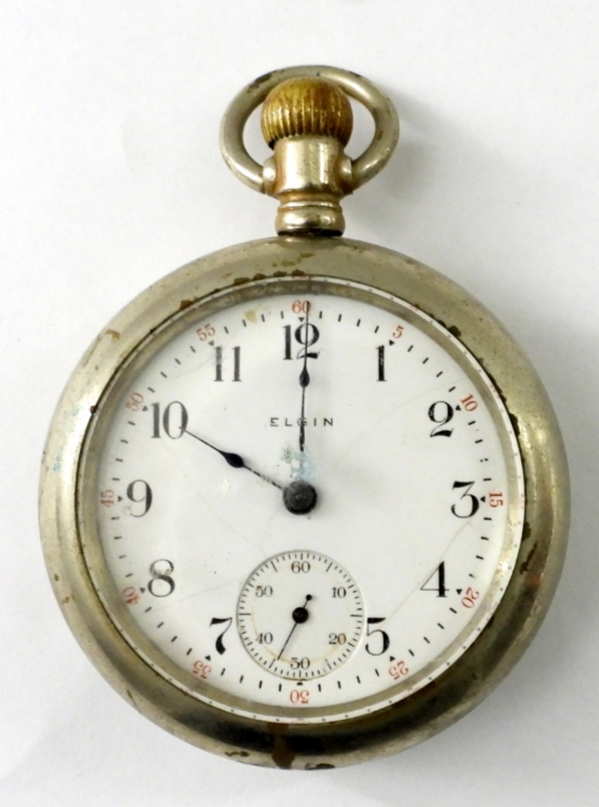 1910 ELGIN 18 SIZE MENS POCKET WATCH. SER# 14158411 ,7 JEWELS, GRADE 294. NOT IN WORKING CONDITION