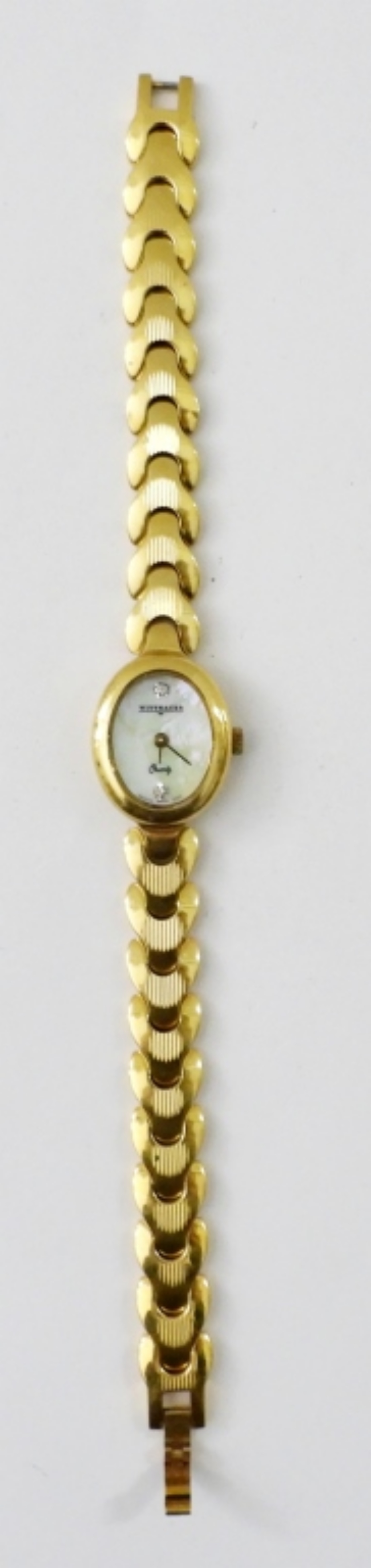 WITTNAUER GOLD TONE LADIES WATCH WITH MOTHER OF PEARL FACE & DIAMOND LIKE ACCENTS -NOT TESTED AS TO WORKING OR NOT-