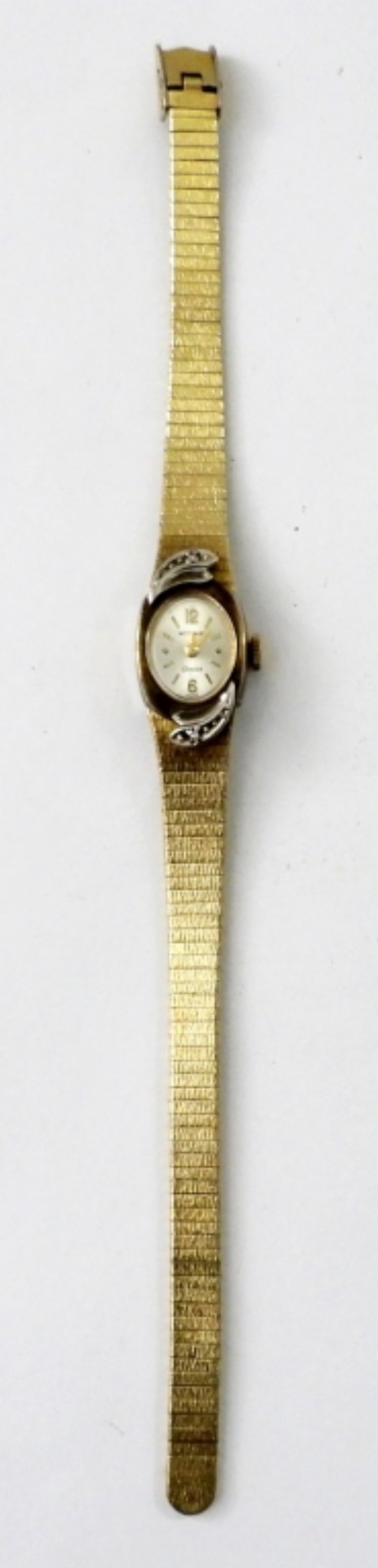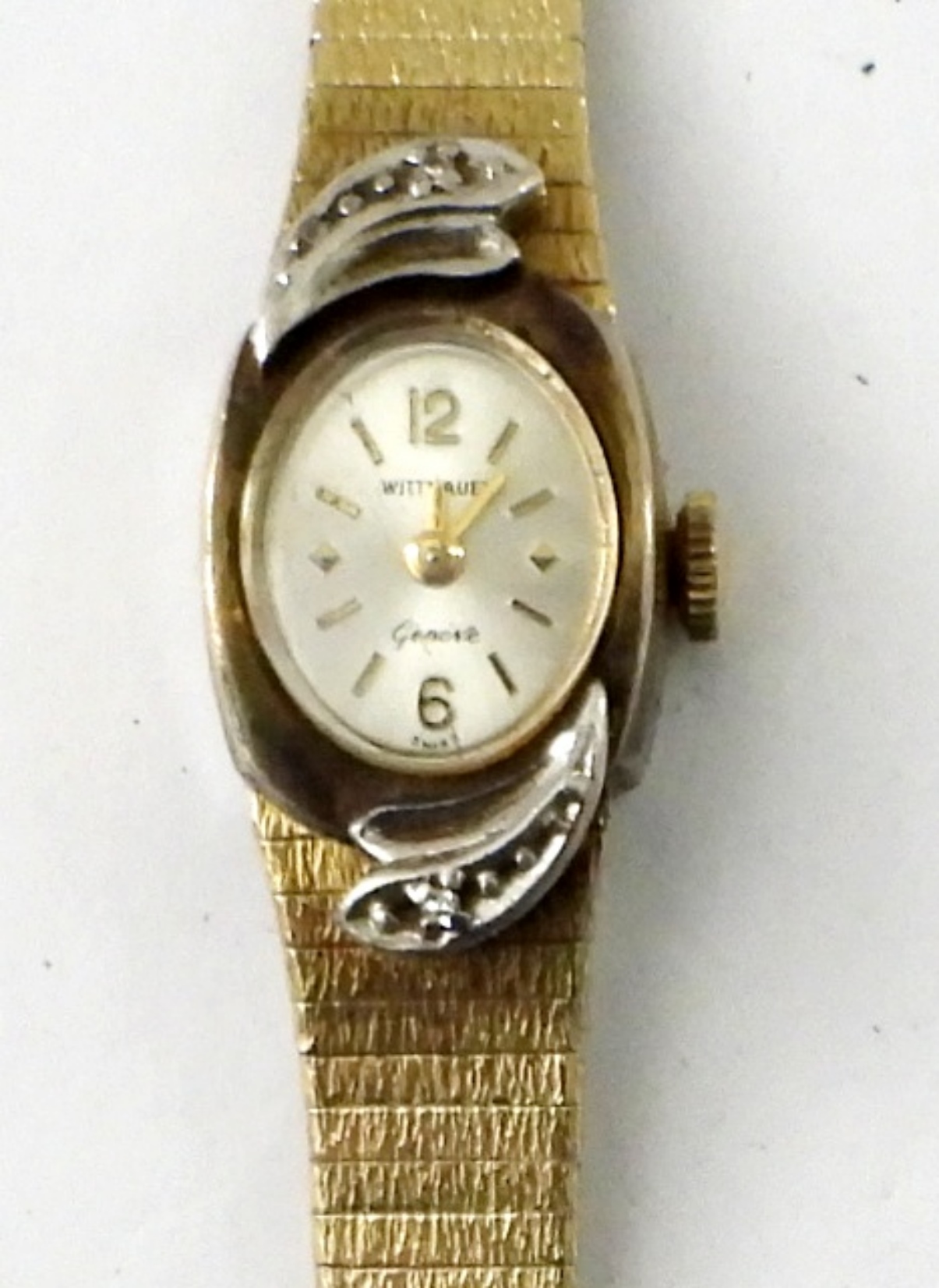 WITTNAUER GOLD TONE VINTAGE LADIES WATCH WITH TWO MOISSANITE GEMSTONES. -NOT TESTED AS TO WORKING OR NOT-