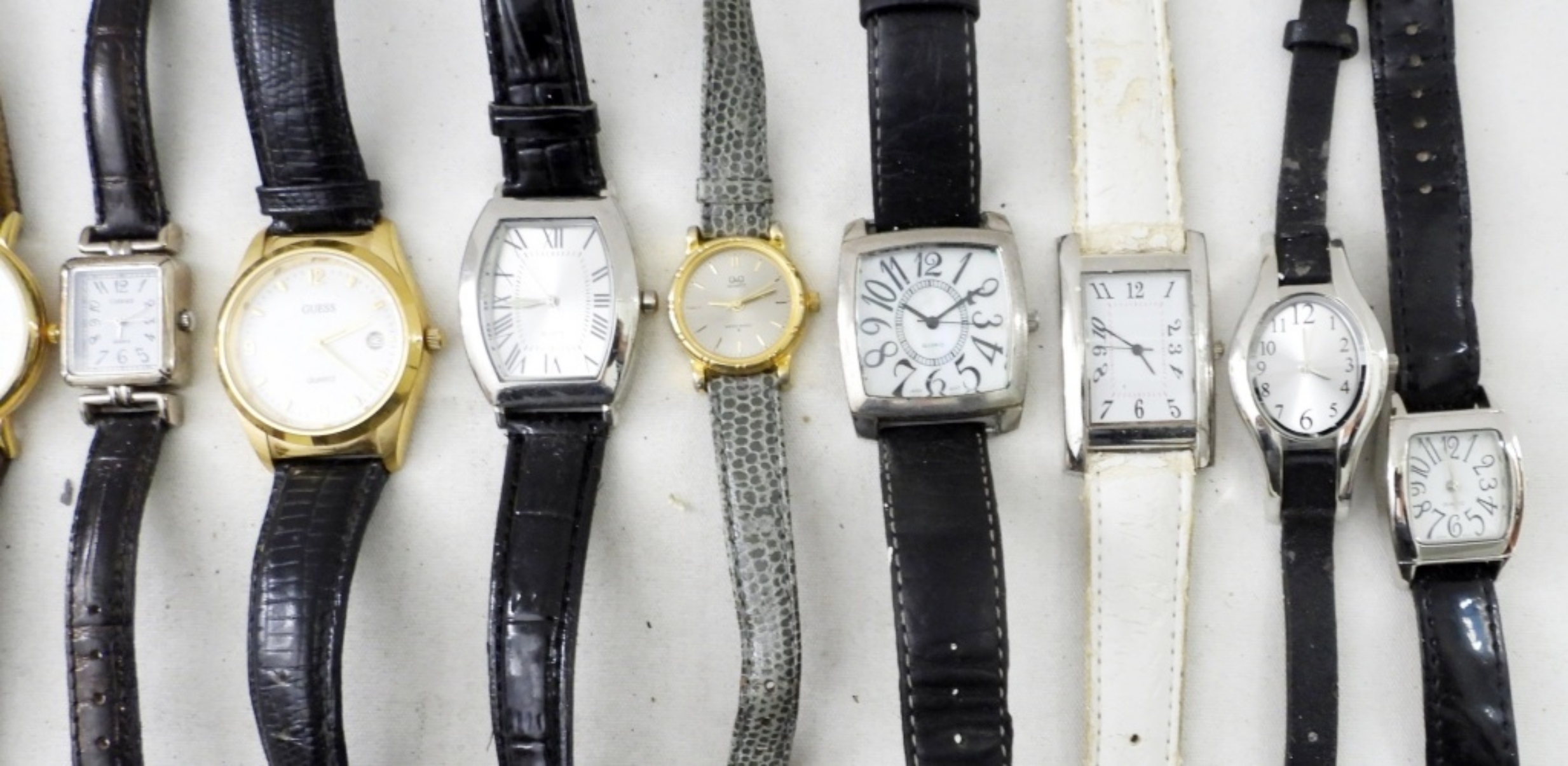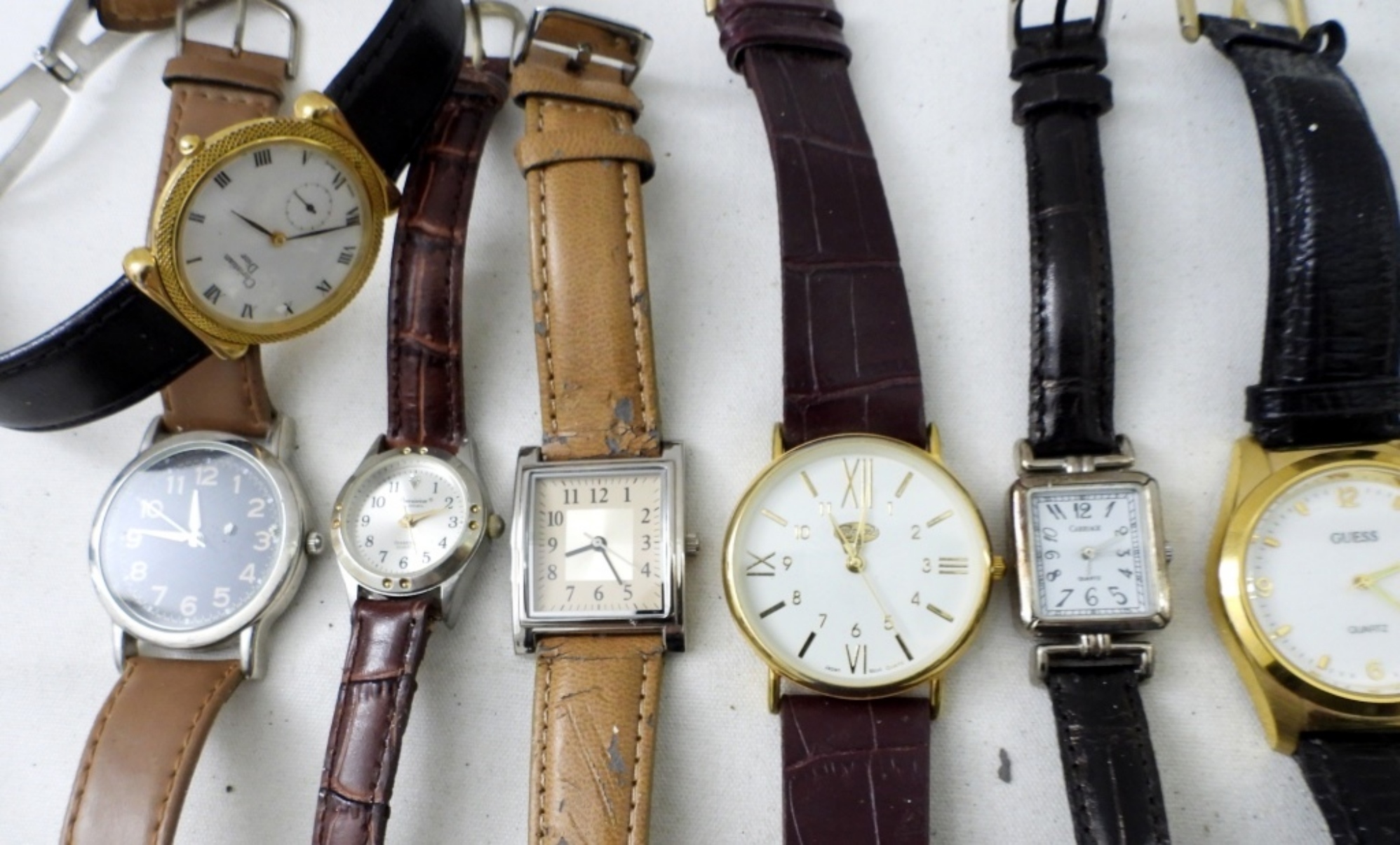FOURTEEN WOMENS WATCHES WITH LEATHER BANDS. GUESS, CHRISTIAN DIOR, PRECISION & MORE -NOT TESTED AS TO WORKING OR NOT-