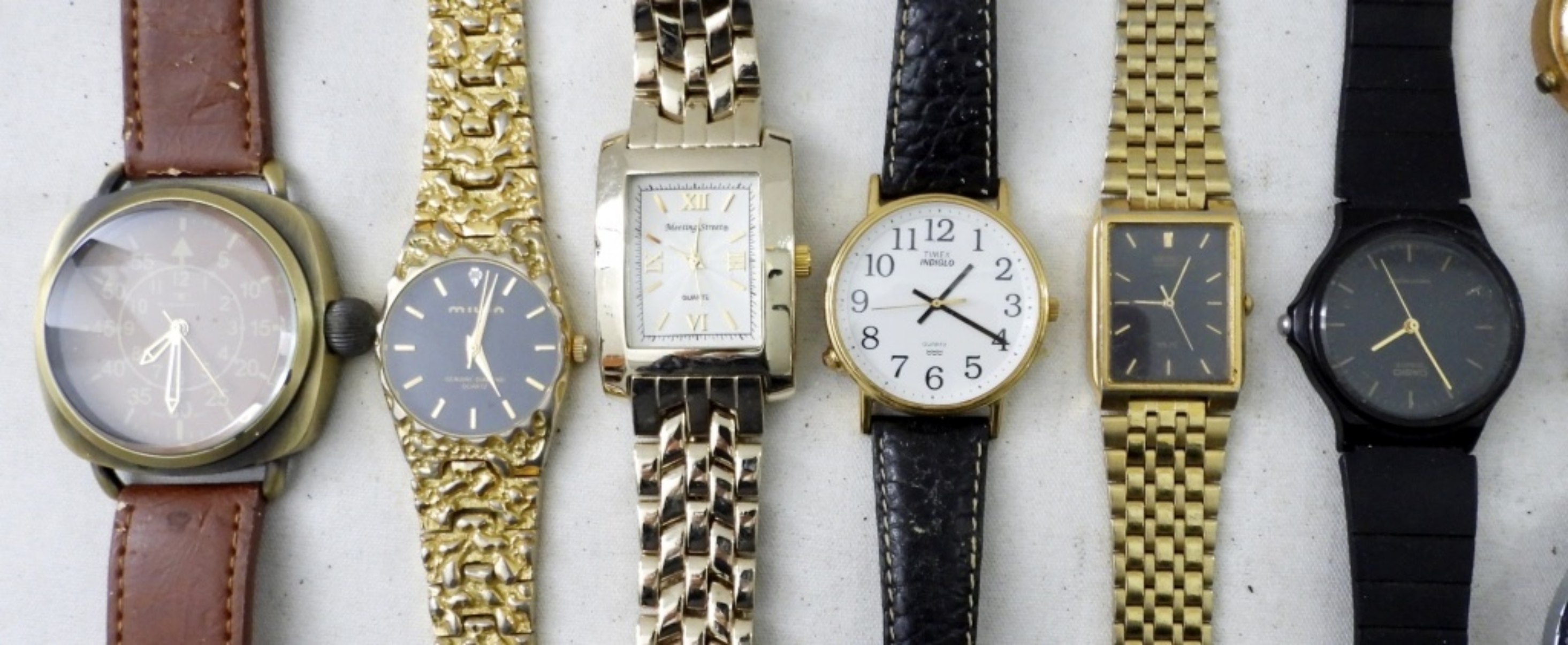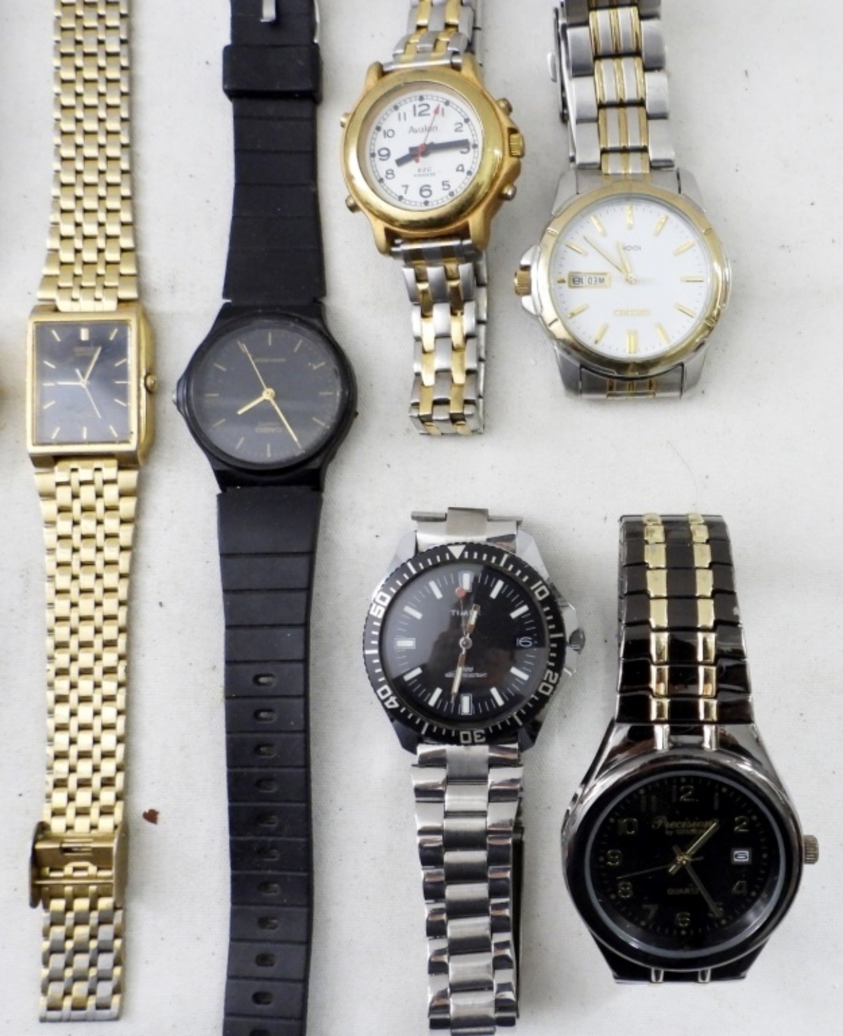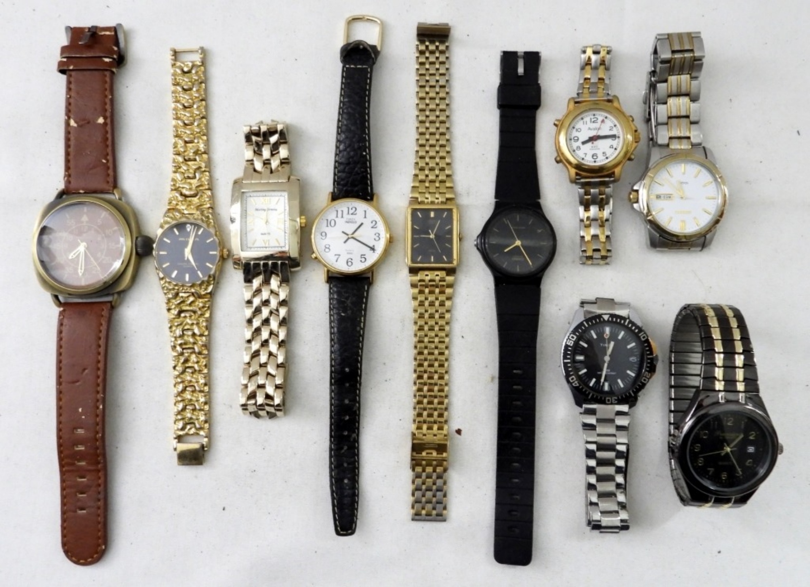 A VARIETY OF STYLES, TEN MENS WATCHES. LEATHER BANDS, GOLD TONE, SILVERTONE. SEIKO, AVALON, TIMEX & MORE -NOT TESTED AS TO WORKING OR NOT-
