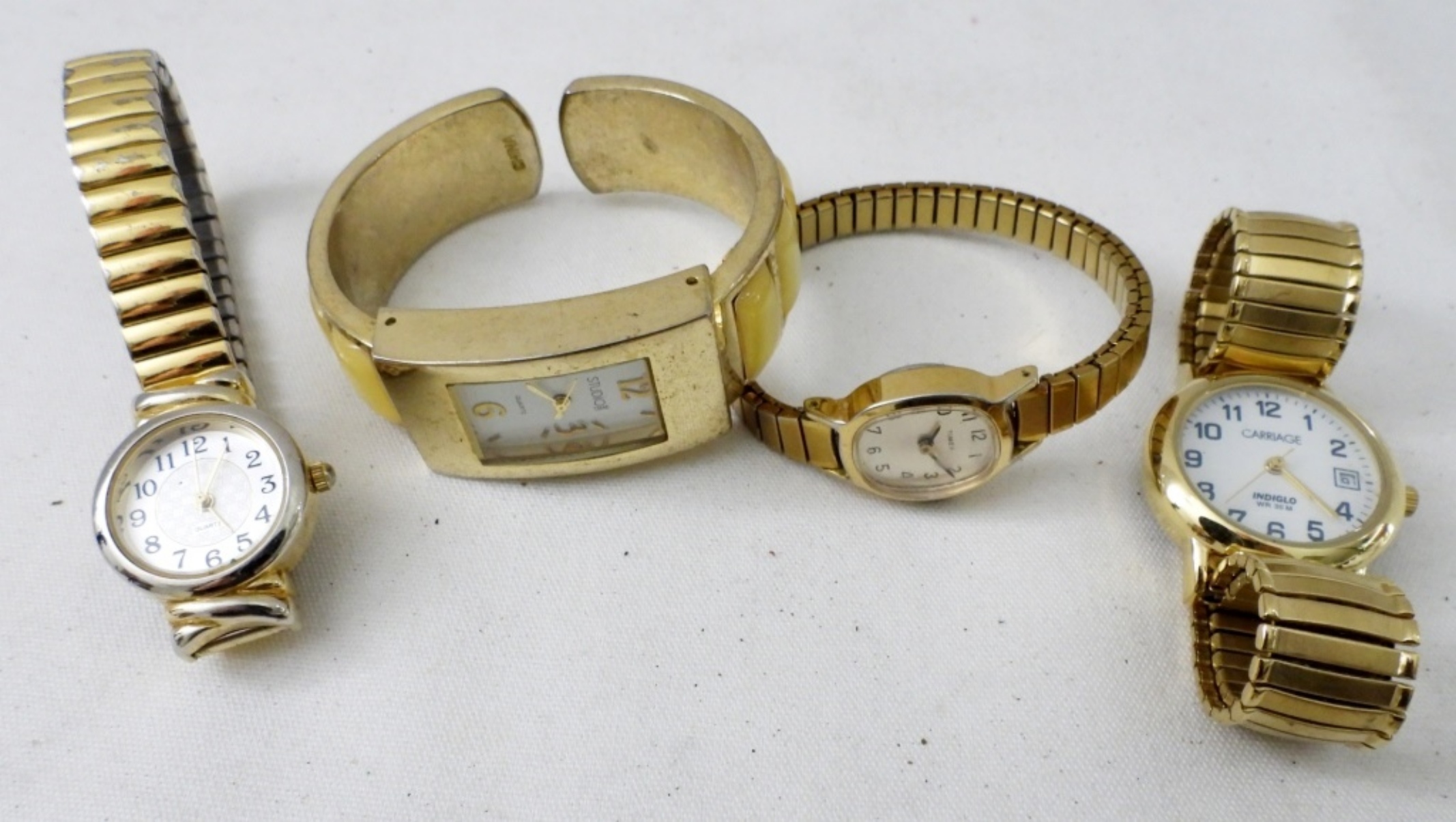 TEN WOMEN’S GOLD TONE BRACELET STYLE WATCHES. CARRIAGE, TIMEX, RELIC & MORE. -NOT TESTED AS TO WORKING OR NOT-