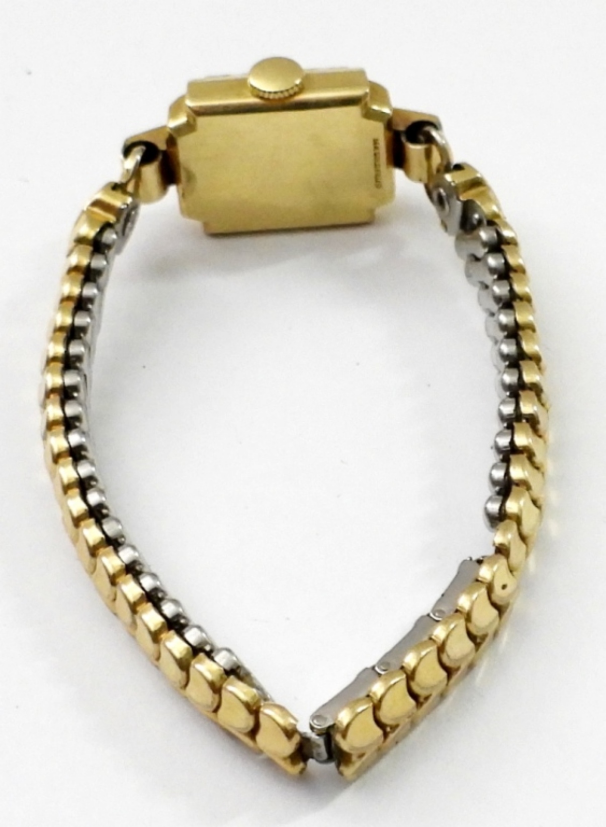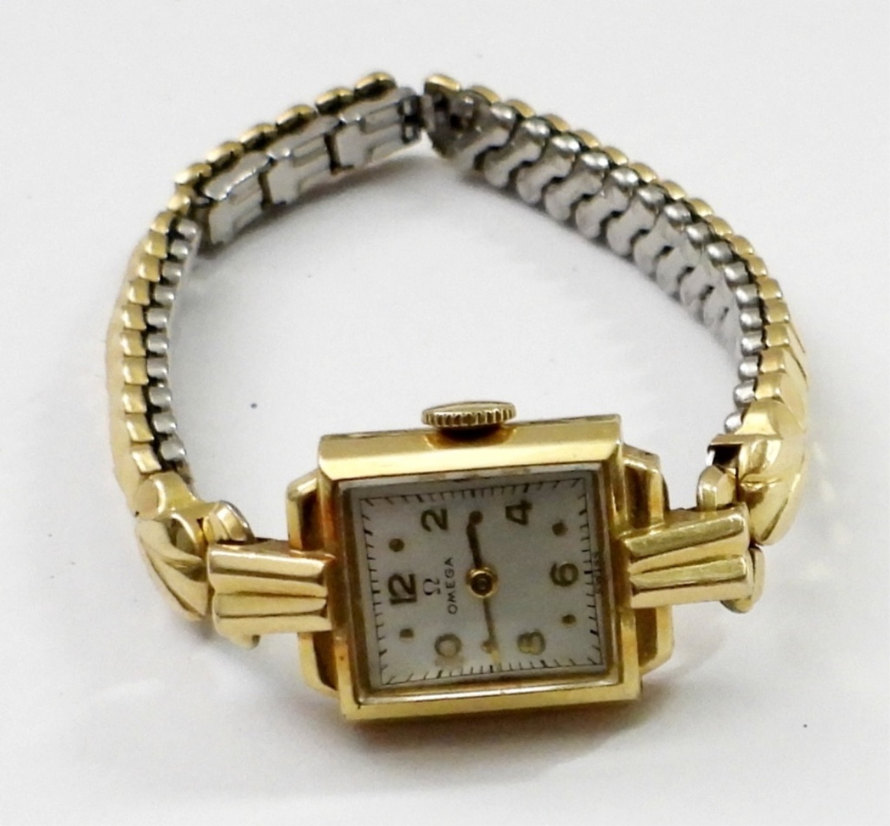VINTAGE GOLD FILLED SQUARE FACE OMEGA LADIES WATCH WITH STRETCHY BAND. NOT TESTED AS TO WORKING OR NOT