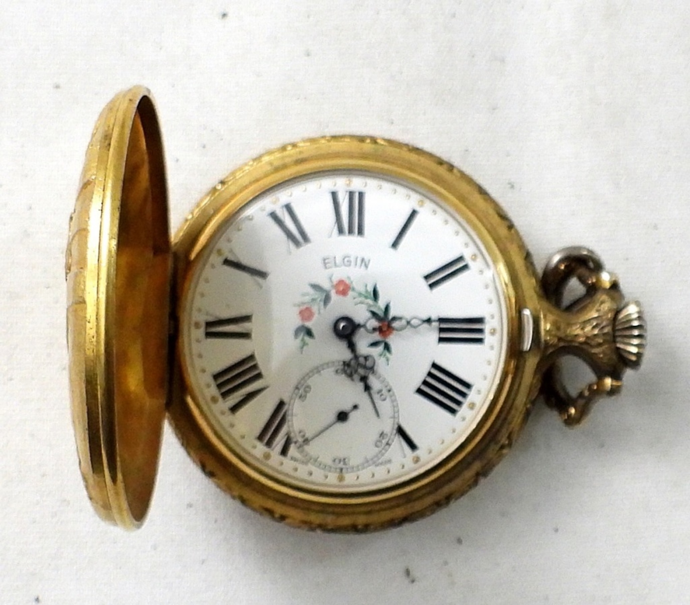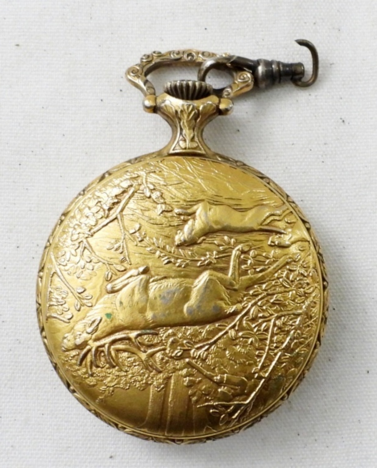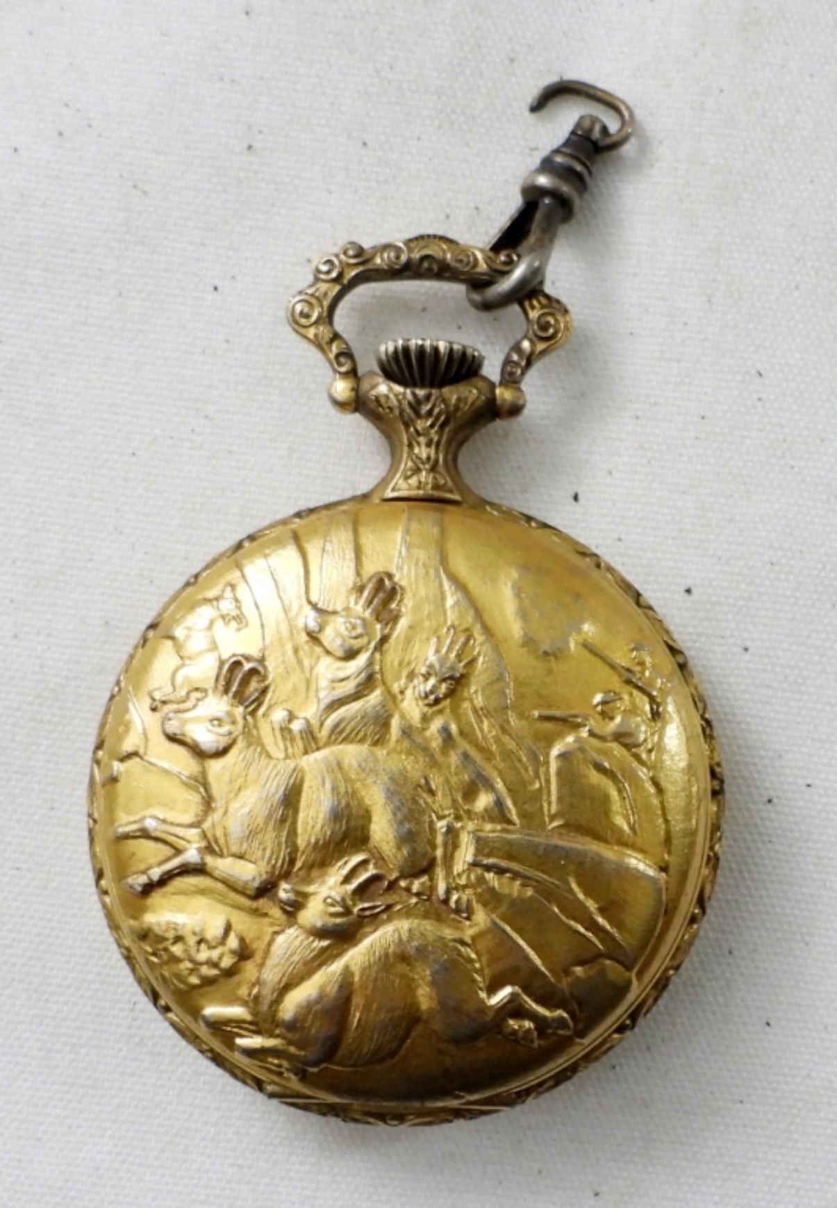 VINTAGE ELGIN 16 SIZE 17 JEWEL POCKET WATCH. GOLD TONE DEER HUNTING THEME POCKET WATCH. NOT TESTED AS TO WORKING OR NOT