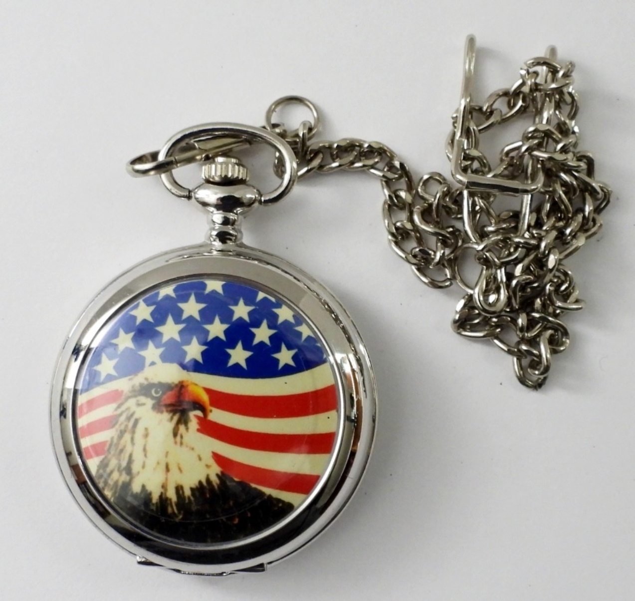 WORKING QUARTZ 16 SIZE POCKET WATCH, SILVER TONE WITH CHAIN. AMERICAN FLAG ,BALD EAGLE . NOT TESTED AS TO KEEPING TIME OR NOT