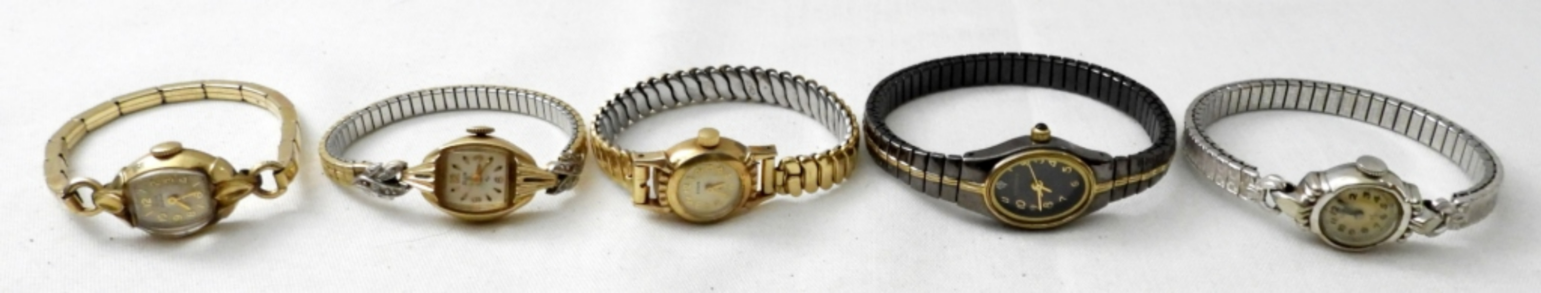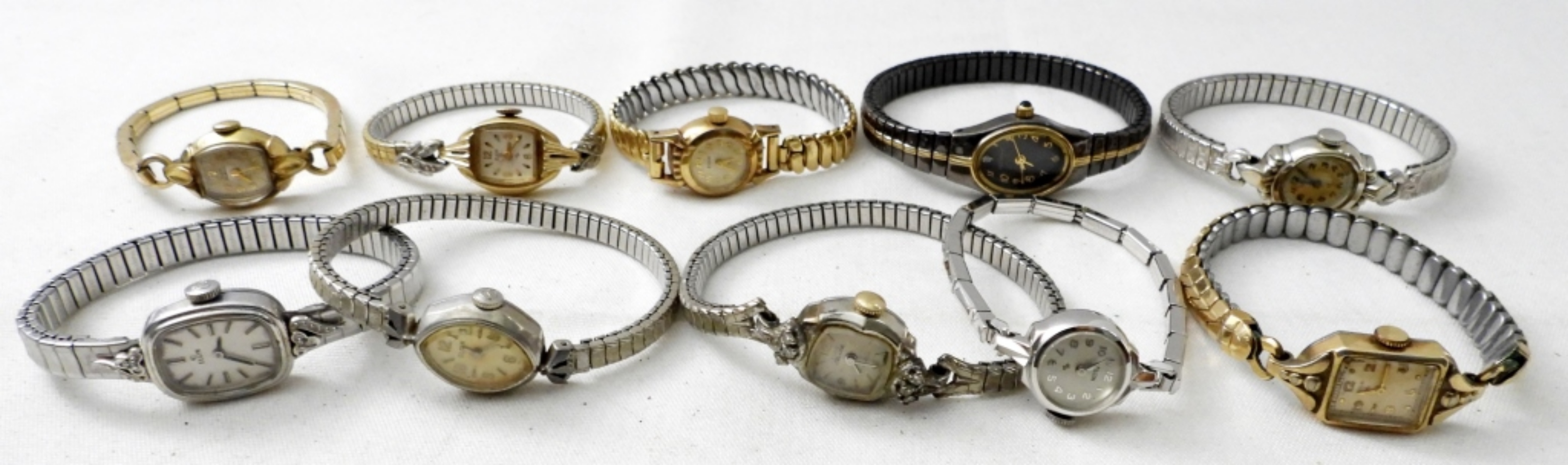 (10) VINTAGE ELGIN LADIES WATCHES, STRETCHY BANDS , ASSORTED STYLE FACES . GOLD AND SILVER TONE. NOT TESTED AS TO WORKING OR NOT