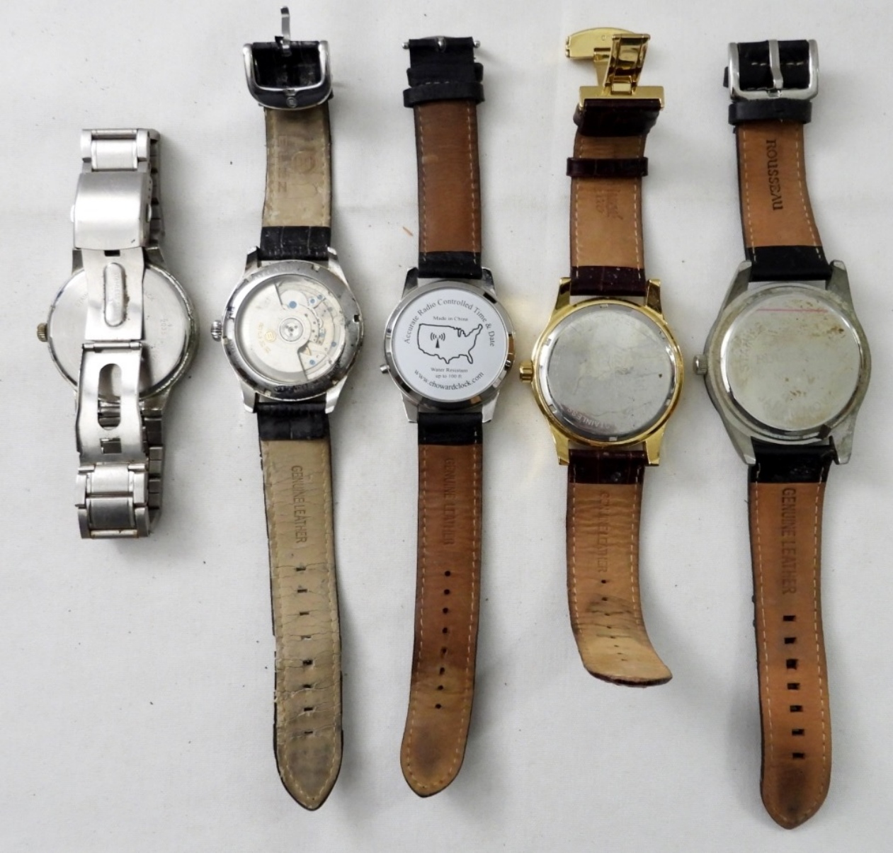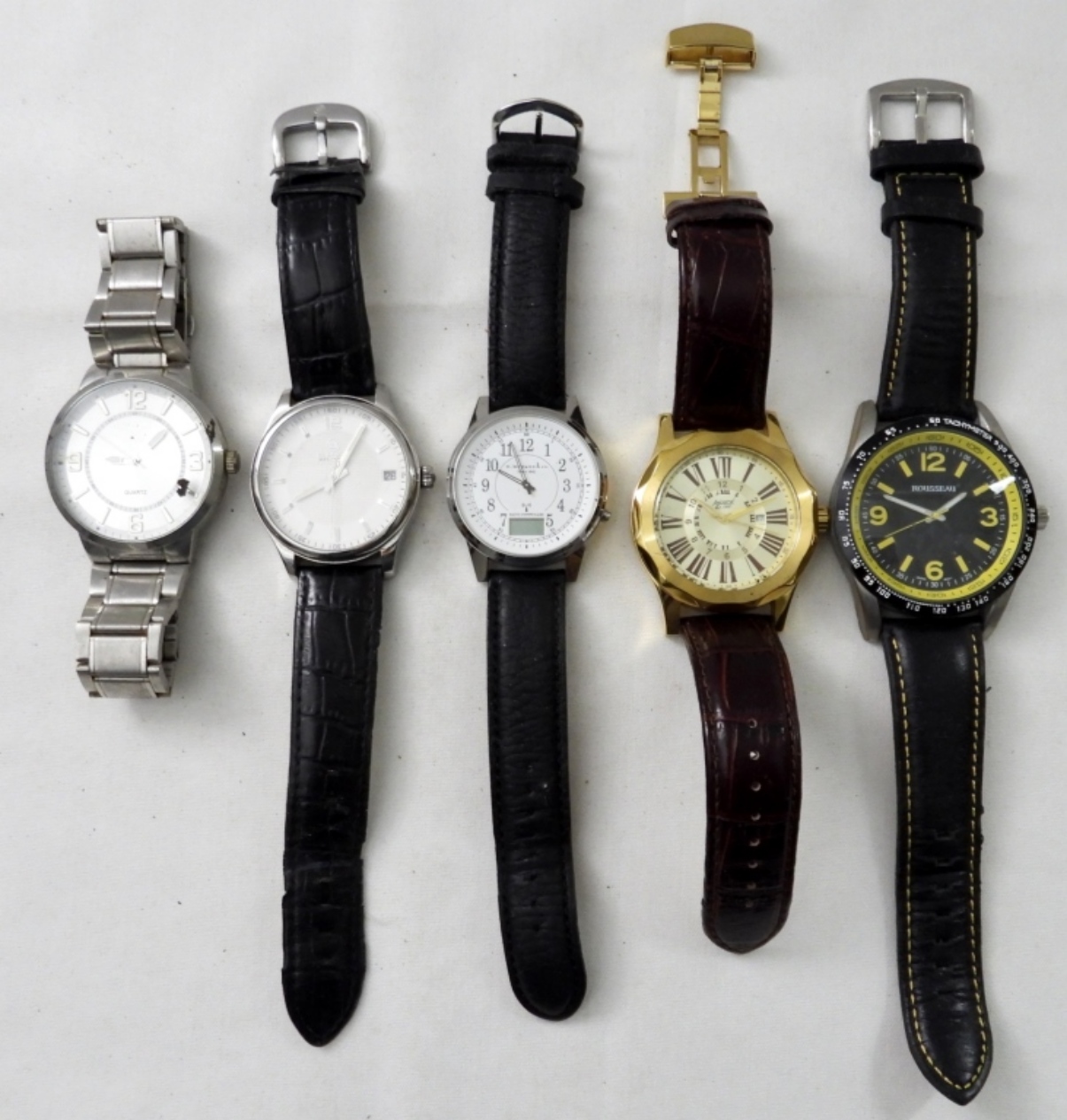 (5) LARGE FACE MENS WATCHES, BUZZ,QUART & ZROUSSEAU. (4) LEATHER BANDS AND 1 SILVER TONE CLASP BAND .NOT TESTED AS TO WORKING OR NOT