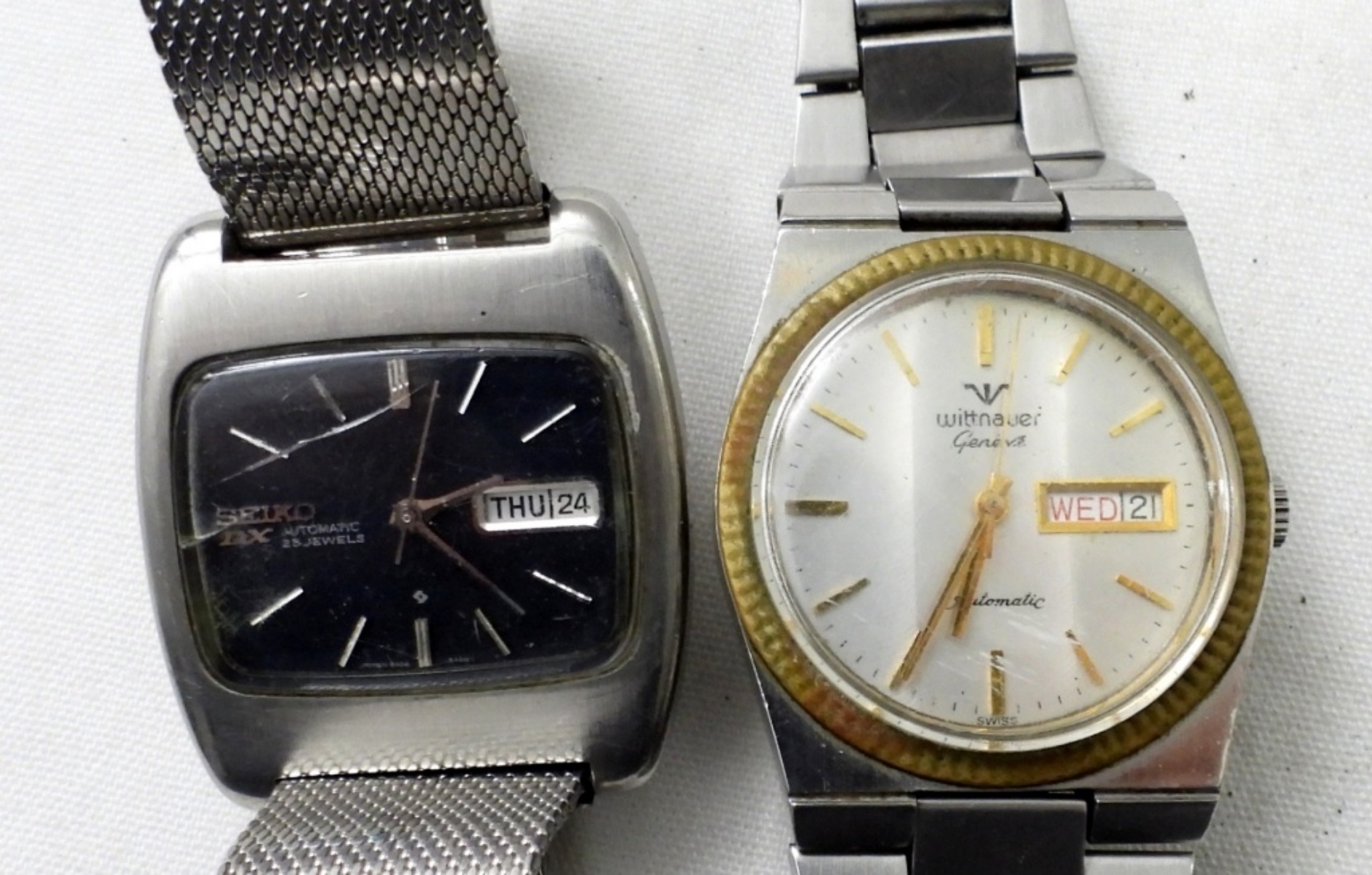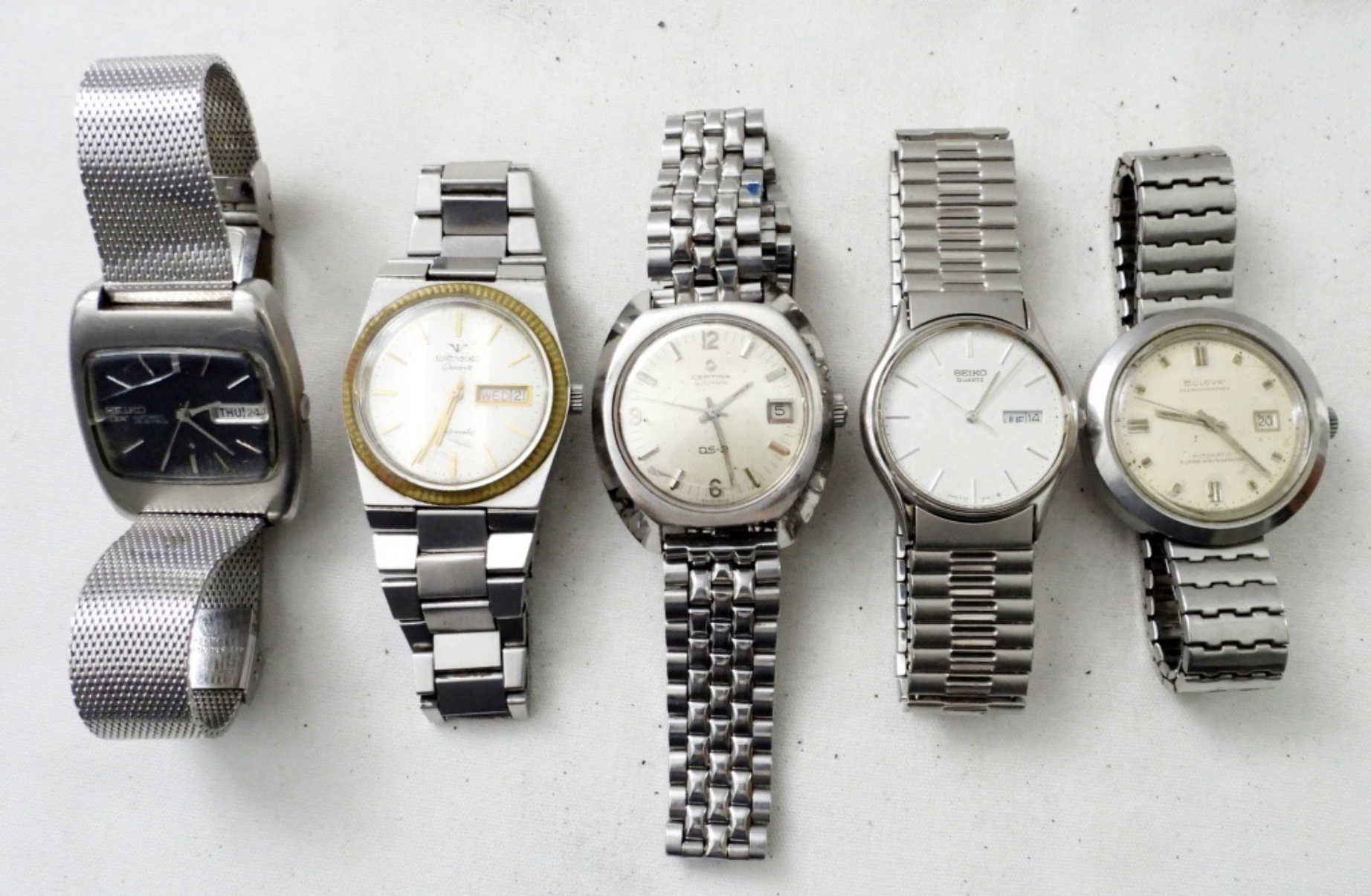 (5) DATE / DAY SILVER TONE MENS WRIST WATCH. 2 STRETCHY BAND, 3 CLASP BAND . NOT TESTED AS TO WORKING OR NOT