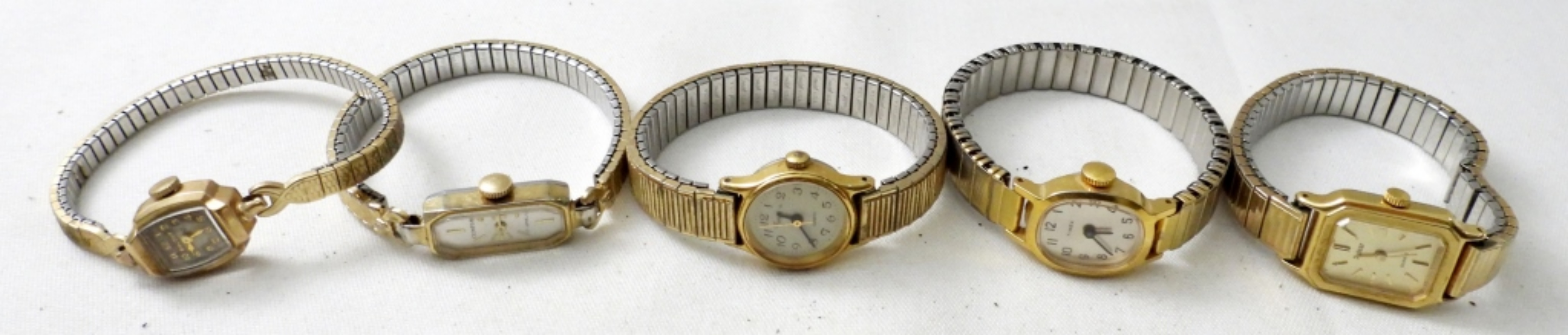 (10) VINTAGE LADIES WATCHES ,BUKOVA,PULSAR ,TIMEX & MORE. ALL WITH STRETCHY BANDS , ALL GOLD TONE . NOT TESTED AS TO WORKING OR NOT